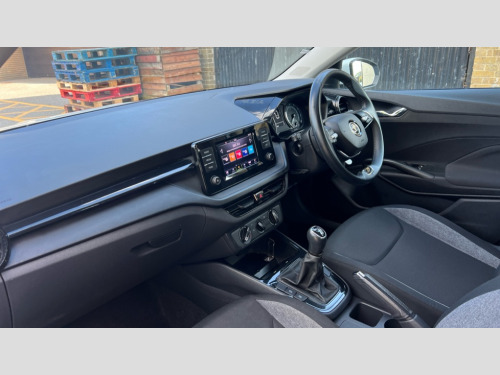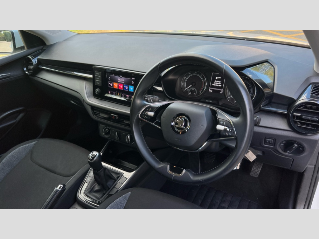 Skoda Fabia 1.0 MPI 80 SE Comfort 5dr Bluetooth connection, Driver alert system - DAS, Electromechanical power steering, Exterior temperature gauge, Lane assist including road edge detection, Multifunction trip computer in black and white, Service interval indicator, SmartLink, Speed limiter, 2x USB-C in the front (for data transmission and charging), 4 speakers in front, Auxiliary socket for external MP3 player, DAB digital radio reception, Radio Swing with 6.5" colour display, Basic LED Headlights, Basic rear lights, Body colour door mirrors, Body coloured bumpers, Dimming rear view mirror with black frame, Door mirror integrated indicators, Electrically adjustable and heated door mirrors, Electrically adjustable front windows with function auto up/down, Front fog lights, Front window wiper intermittent control, Headlight range control - Automatic, Ice scraper in fuel cap, LED daytime running lights with coming and leaving home feature, Mechanical adjustable rear windows, Rain sensor, Rear LED fog light, Rear side wing doors, Rear window wiper with washing nozzles, Roof mounted spoiler, SKODA tailgate lettering in chrome, Third brake light, 2 reading lights in front and 2 reading lights in rear, 2 spoke leather multifunction steering wheel, 3 rear headrests, Backrest split and folding, Central console with fixed cup holder and storage box, Chrome handbrake release button, Fabric upholstery, Gearshift knob/handle in leather, Grain satin black interior door handles, Hand brake lever handle in leather, Height adjustable front headrests, Height adjustable front seats, Height adjustable steering wheel, ISOFIX and TopTether anchorage points to the outer rear seats, ISOFIX and TopTether on the front passenger seat, Luggage compartment lighting, Manual air conditioning, Manually adjustable lumbar support in front seats, Pollen filter, Rear seat bench unsplit, Single front passenger seat, Storm grey headlining, Sun visors with mirror and airbag label on passenger side, Ticket holder, 3-point height adjustable front seats belts with pretensioner and force limiter, Automatic warning lights in case of crash, Driver and passengers airbag with switch off function, e-Call+, ESC including ABS, MSR, ASR, EDS, HBA and XDS, Front and rear seat belt warning, FRONT ASSIST (AEB City and AEB Inter Urban), Front side airbags, Head airbags, One tone horn, Pedestrian protection, Three rear 3-points safety seat belts with pretensioner and force limiter including stop function for outer rear seat belts, Tyre pressure monitoring system, Anti-theft alarm system including immobiliser, interior monitoring, backup horn, and towing protection, Central locking with radio remote control, interior controls, SAFE function and 2 foldable keys, Black painted air vents, Glossy black decorative trim, Grain satin black central console cover, Grain satin black lower decorative trim, Satin black door and side trim panel in front, Anti-theft wheel bolts protection, Super-low rolling resistance tyres