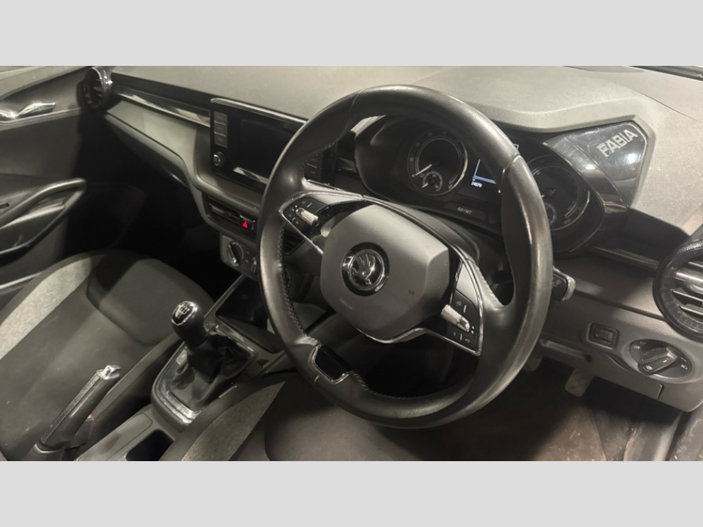 Dimming Rear View Mirror with Black Frame Bluetooth connection, Driver alert system - DAS, Electromechanical power steering, Exterior temperature gauge, Lane assist including road edge detection, Multifunction trip computer in black and white, Service interval indicator, Speed limiter, 2x USB-C in the front (for data transmission and charging), 4 speakers in front, Auxiliary socket for external MP3 player, DAB digital radio reception, Radio Swing with 6.5" colour display, Basic LED Headlights, Basic rear lights, Body colour door mirrors, Body coloured bumpers, Dimming rear view mirror with black frame, Door mirror integrated indicators, Electrically adjustable and heated door mirrors, Electrically adjustable front windows with function auto up/down, Front fog lights, Front window wiper intermittent control, Headlight range control - Automatic, Ice scraper in fuel cap, LED daytime running lights with coming and leaving home feature, Mechanical adjustable rear windows, Rain sensor, Rear LED fog light, Rear side wing doors, Rear window wiper with washing nozzles, Roof mounted spoiler, SKODA tailgate lettering in chrome, Third brake light, 2 reading lights in front and 2 reading lights in rear, 2 spoke leather multifunction steering wheel, 3 rear headrests, Backrest split and folding, Central console with fixed cup holder and storage box, Chrome handbrake release button, Fabric upholstery, Gearshift knob/handle in leather, Grain satin black interior door handles, Hand brake lever handle in leather, Height adjustable front headrests, Height adjustable front seats, Height adjustable steering wheel, ISOFIX and TopTether anchorage points to the outer rear seats, ISOFIX and TopTether on the front passenger seat, Luggage compartment lighting, Manual air conditioning, Manually adjustable lumbar support in front seats, Pollen filter, Rear seat bench unsplit, Single front passenger seat, Storm grey headlining, Sun visors with mirror and airbag label on passenger side, Ticket holder, 3-point height adjustable front seats belts with pretensioner and force limiter, Automatic warning lights in case of crash, Driver and passengers airbag with switch off function, e-Call+, ESC including ABS, MSR, ASR, EDS, HBA and XDS, Front and rear seat belt warning, FRONT ASSIST (AEB City and AEB Inter Urban), Front side airbags, Head airbags, One tone horn, Pedestrian protection, Three rear 3-points safety seat belts with pretensioner and force limiter including stop function for outer rear seat belts, Tyre pressure monitoring system, Anti-theft alarm system including immobiliser, interior monitoring, backup horn, and towing protection, Central locking with radio remote control, interior controls, SAFE function and 2 foldable keys, Black painted air vents, Glossy black decorative trim, Grain satin black central console cover, Grain satin black lower decorative trim, Satin black door and side trim panel in front, Anti-theft wheel bolts protection, Super-low rolling resistance tyres