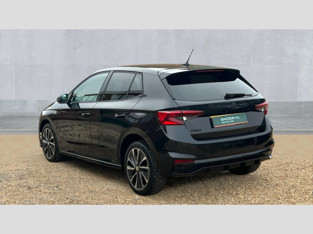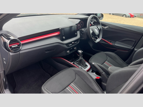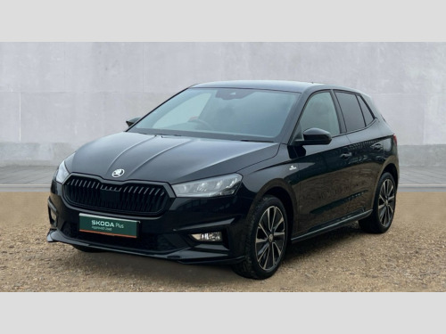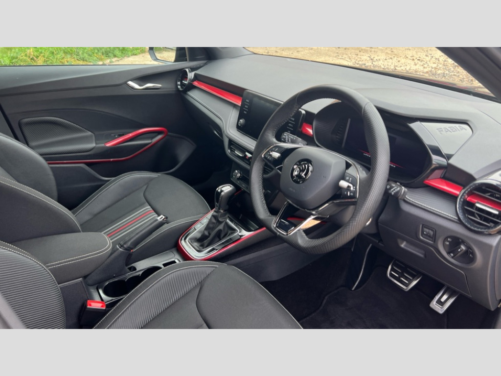 Skoda Fabia 1.0 TSI 110 Monte Carlo 5dr DSG Bluetooth connection, Driver alert system - DAS, Electromechanical power steering, Exterior temperature gauge, Service interval indicator, 2x USB-C in the front (for data transmission and charging), 6 Speakers (4 in front and 2 in rear), Auxiliary socket for external MP3 player, Bolero radio with 8" colour display, DAB digital radio reception, Auto dimming rear view mirror, Basic rear lights, Black radiator grille, Body coloured bumpers, Door mirror integrated indicators, Electrically adjustable and heated door mirrors, Front and rear electric windows, Front window wiper intermittent control, Headlight range control - Automatic, Ice scraper in fuel cap, LED daytime running lights with coming and leaving home feature, Monte Carlo badging, Privacy glass, Rear LED fog light, Rear side wing doors, Rear window wiper with washing nozzles, Roof mounted spoiler, SKODA tailgate lettering in black, Sports bumpers, Third brake light, 3 rear headrests, Aluminium pedals, Backrest split and folding, Black headlining, Central console with removable cup holder and storage box, Chrome handbrake release button, Fabric/artificial leather upholstery, Front sports seats, Gearshift knob/handle in leather, Hand brake lever handle in leather, Height adjustable front headrests, Height adjustable steering wheel, ISOFIX and TopTether anchorage points to the outer rear seats, ISOFIX and TopTether on the front passenger seat, Luggage compartment lighting, Metallic painted red central console cover, Metallic red interior door handles, Monte Carlo door sills, Pollen filter, Rear seat bench unsplit, Single front passenger seat, Sun visors with mirror and airbag label on passenger side, Textile floor mats, Ticket holder, Umbrella in drivers door, Ambient lighting pack 2 - Fabia Hatchback, 3-point height adjustable front seats belts with pretensioner and force limiter, Automatic warning lights in case of crash, Driver and passengers airbag with switch off function, e-Call+, ESC including ABS, MSR, ASR, EDS, HBA and XDS, Front and rear seat belt warning, FRONT ASSIST (AEB City and AEB Inter Urban), Front side airbags, Head airbags, Hill hold assist, One tone horn, Pedestrian protection, Three rear 3-points safety seat belts with pretensioner and force limiter including stop function for outer rear seat belts, Tyre pressure monitoring system, Anti-theft alarm system including immobiliser, interior monitoring, backup horn, and towing protection, Carbon effect door and side trim panels, Carbon effect lower decorative trim with white stitching, Red metallic upper decorative trim, Anti-theft wheel bolts protection, Super-low rolling resistance tyres