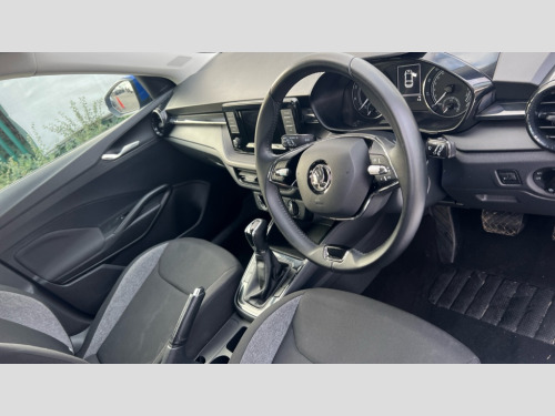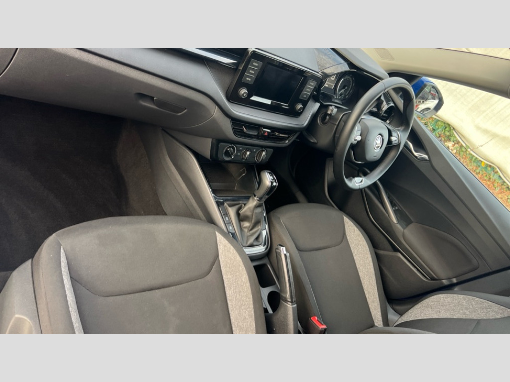Skoda Fabia 1.0 TSI 110 SE Comfort 5dr DSG Bluetooth connection, Driver alert system - DAS, Electromechanical power steering, Exterior temperature gauge, Lane assist including road edge detection, Multifunction trip computer in black and white, Service interval indicator, Speed limiter, 2x USB-C in the front (for data transmission and charging), 4 speakers in front, Auxiliary socket for external MP3 player, DAB digital radio reception, Radio Swing with 6.5" colour display, Basic LED Headlights, Basic rear lights, Body colour door mirrors, Body coloured bumpers, Dimming rear view mirror with black frame, Door mirror integrated indicators, Electrically adjustable and heated door mirrors, Electrically adjustable front windows with function auto up/down, Front fog lights, Front window wiper intermittent control, Headlight range control - Automatic, Ice scraper in fuel cap, LED daytime running lights with coming and leaving home feature, Mechanical adjustable rear windows, Rain sensor, Rear LED fog light, Rear side wing doors, Rear window wiper with washing nozzles, Roof mounted spoiler, SKODA tailgate lettering in chrome, Third brake light, 2 reading lights in front and 2 reading lights in rear, 2 spoke leather multifunction steering wheel, 3 rear headrests, Backrest split and folding, Central console with fixed cup holder and storage box, Chrome handbrake release button, Fabric upholstery, Gearshift knob/handle in leather, Grain satin black interior door handles, Hand brake lever handle in leather, Height adjustable front headrests, Height adjustable front seats, Height adjustable steering wheel, ISOFIX and TopTether anchorage points to the outer rear seats, ISOFIX and TopTether on the front passenger seat, Luggage compartment lighting, Manual air conditioning, Manually adjustable lumbar support in front seats, Pollen filter, Rear seat bench unsplit, Single front passenger seat, Storm grey headlining, Sun visors with mirror and airbag label on passenger side, Ticket holder, 3-point height adjustable front seats belts with pretensioner and force limiter, Automatic warning lights in case of crash, Driver and passengers airbag with switch off function, e-Call+, ESC including ABS, MSR, ASR, EDS, HBA and XDS, Front and rear seat belt warning, FRONT ASSIST (AEB City and AEB Inter Urban), Front side airbags, Head airbags, Hill hold assist, One tone horn, Pedestrian protection, Three rear 3-points safety seat belts with pretensioner and force limiter including stop function for outer rear seat belts, Tyre pressure monitoring system, Anti-theft alarm system including immobiliser, interior monitoring, backup horn, and towing protection, Central locking with radio remote control, interior controls, SAFE function and 2 foldable keys, Black painted air vents, Glossy black decorative trim, Grain satin black central console cover, Grain satin black lower decorative trim, Satin black door and side trim panel in front, Anti-theft wheel bolts protection, Super-low rolling resistance tyres