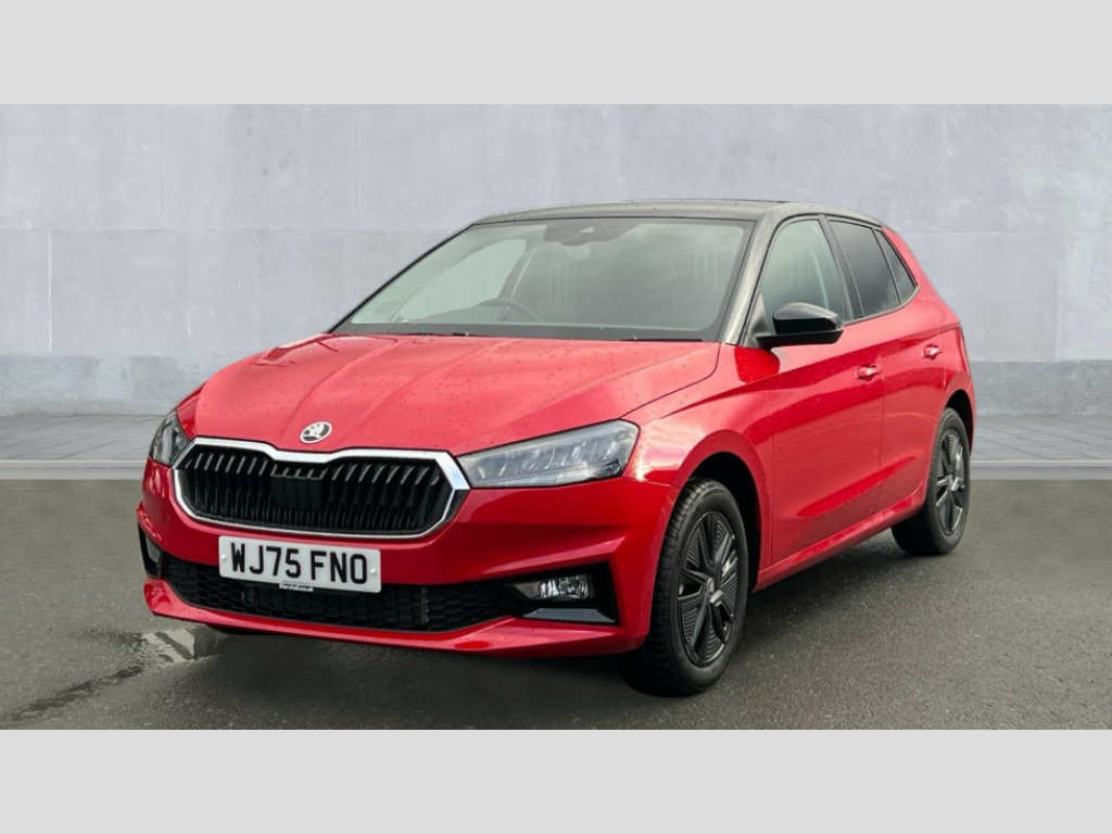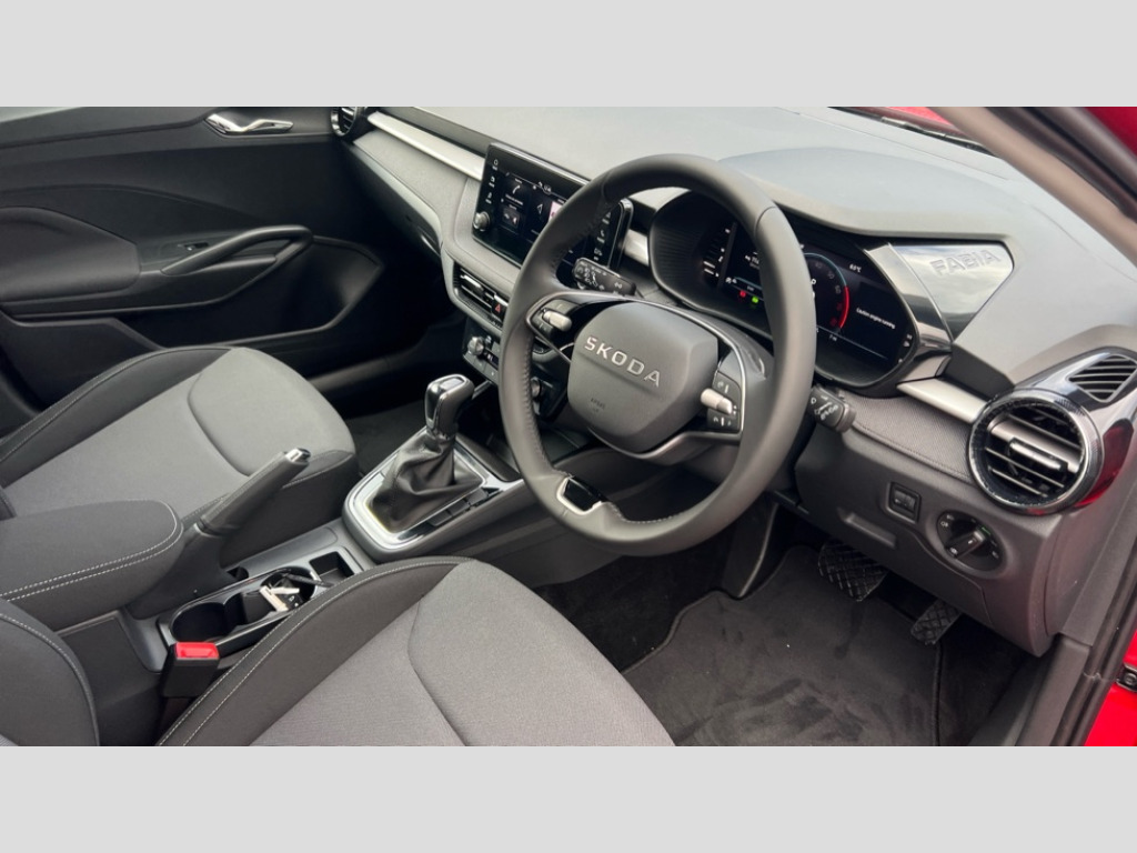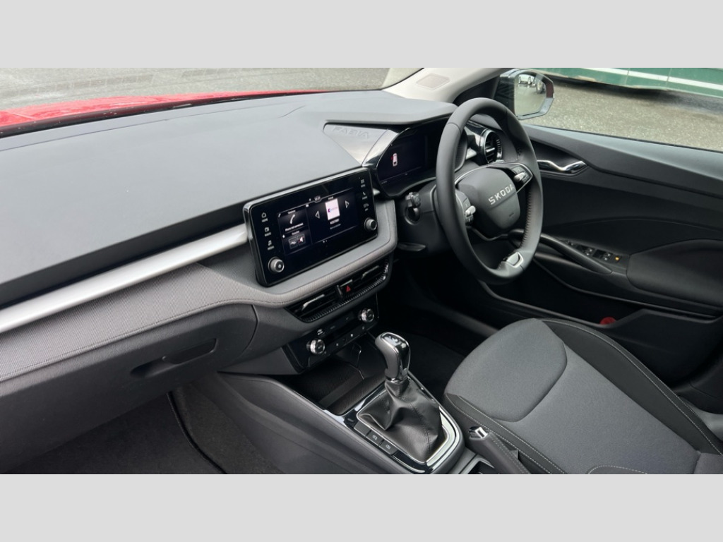 Skoda Fabia 1.0 TSI 116 Design Edition 5dr DSG Advanced driver attention and drowsiness monitor, Bluetooth connection, Driver alert system, Electromechanical power steering, Exterior temperature gauge, Service interval indicator, Traffic sign recognition, Virtual cockpit with 10.25" colour display, Wireless SmartLink for Apple CarPlay and Android Auto, 6 Speakers (4 in front and 2 in rear), Auxiliary socket for external MP3 player, DAB digital radio reception, Auto dimming rear view mirror, Body coloured bumpers, Door mirror integrated indicators, Front and rear electric windows, Front window wiper intermittent control, Headlight range control - Automatic, Ice scraper in fuel cap, LED 3rd brake light, LED daytime running lights with coming and leaving home feature, LED rear lights, Privacy glass, Rear LED fog light, Rear side wing doors, Rear window wiper with washing nozzles, Roof mounted spoiler, SKODA tailgate lettering in chrome, Unique dark chrome design logo on alloy wheels, 2 reading lights in front and 2 reading lights in rear, 3 rear headrests, Backrest split and folding, Central console with removable cup holder and storage box, Chrome handbrake release button, Dual zone air conditioning with climatronic electronic control, Fabric upholstery, Front centre armrest, Gearshift knob/handle in leather, Grain satin black interior door handles, Hand brake lever handle in leather, Height adjustable front headrests, Height adjustable front seats, Height adjustable steering wheel, ISOFIX and TopTether anchorage points to the outer rear seats, ISOFIX and TopTether on the front passenger seat, Luggage compartment lighting, Manually adjustable lumbar support in front seats, Pollen filter, Rear seat bench unsplit, Single front passenger seat, Skoda lettering on steering wheel, Storm grey headlining, Sun visors with mirror and airbag label on passenger side, Textile floor mats, Ticket holder, Ambient lighting pack - Fabia Hatchback, 3-point height adjustable front seats belts with pretensioner and force limiter, Automatic warning lights in case of crash, Driver and passengers airbag with switch off function, e-Call+, ESC including ABS, MSR, ASR, EDS, HBA and XDS, Front and rear seat belt warning, FRONT ASSIST (AEB City and AEB Inter Urban), Front side airbags, Head airbags, Hill hold control, One tone horn, Pedestrian protection, Three rear 3-points safety seat belts with pretensioner and force limiter including stop function for outer rear seat belts, Tyre pressure monitoring system, Anti-theft alarm system including immobiliser, interior monitoring, backup horn, and towing protection, Central locking with radio remote control, interior controls, SAFE function and 2 foldable keys, Colour Edition air vents, Grain satin black central console cover, Metallic grey upper decorative trim, Satin black door and side trim panel in front, Textile Kota grey lower decorative inserts, Anti-theft wheel bolts protection, Super-low rolling resistance tyres