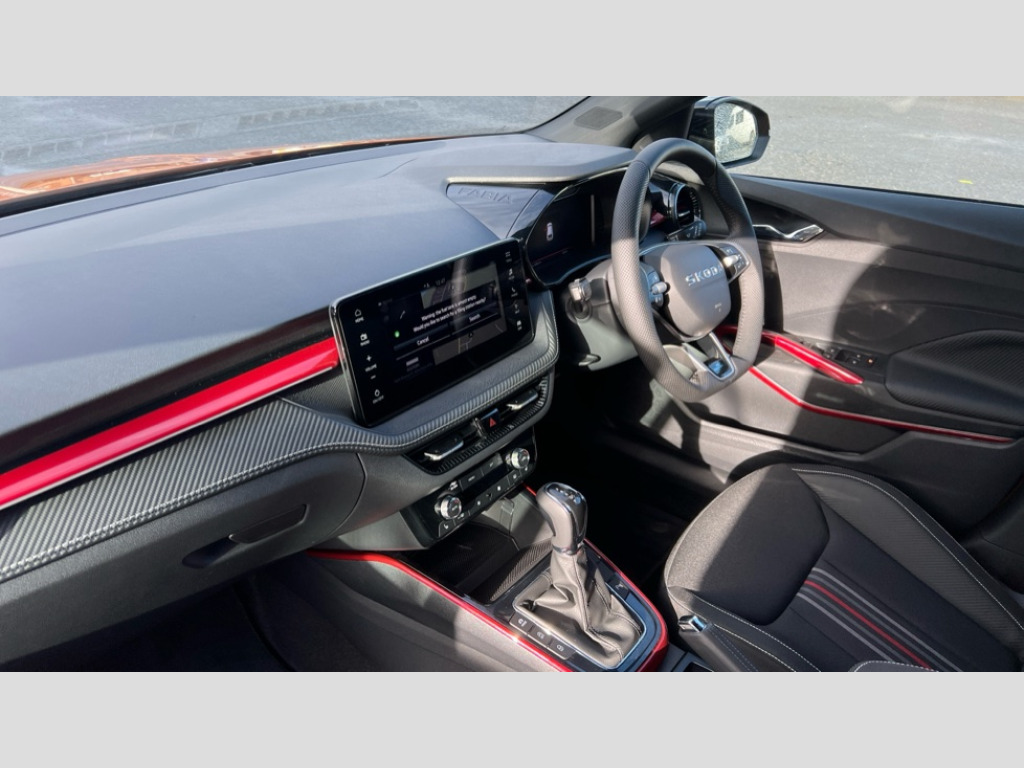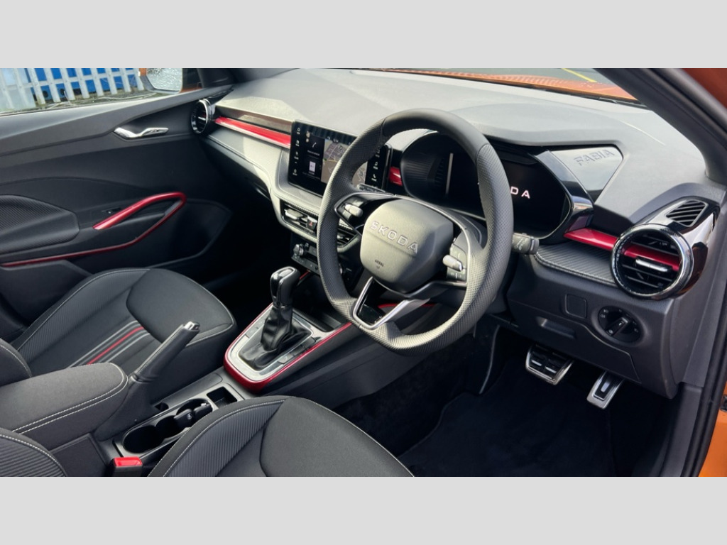 Skoda Fabia 1.0 TSI 116 Monte Carlo Edition 5dr DSG Advanced driver attention and drowsiness monitor, Bluetooth connection, Driver alert system, Electromechanical power steering, Exterior temperature gauge, Service interval indicator, Traffic sign recognition, Virtual cockpit with 10.25" colour display, Wireless SmartLink for Apple CarPlay and Android Auto, 6 Speakers (4 in front and 2 in rear), 9.2" colour display skoda navigation system with voice control and web radio, Auxiliary socket for external MP3 player, DAB digital radio reception, Auto dimming rear view mirror, Black radiator grille, Body coloured bumpers, Chrome window surround, Door mirror integrated indicators, Dynamic headlight range control, Front and rear electric windows, Front window wiper intermittent control, Ice scraper in fuel cap, LED 3rd brake light, LED daytime running lights with coming and leaving home feature, LED rear lights, Monte Carlo badging, Privacy glass, Rear LED fog light, Rear side wing doors, Rear window wiper with washing nozzles, Roof mounted spoiler, SKODA tailgate lettering in black, Sports bumpers, Unique dark chrome design logo on alloy wheels, 2 LED reading lights in front and rear, 3 rear headrests, Aluminium pedals, Backrest split and folding, Black headlining, Central console with fixed cup holder and storage box, Chrome handbrake release button, Door sills with fabia badging, Dual zone air conditioning with climatronic electronic control, Fabric/artificial leather upholstery, Front centre armrest, Front sports seats, Gearshift knob/handle in leather, Hand brake lever handle in leather, Height adjustable front headrests, Height adjustable front seats, Height adjustable steering wheel, ISOFIX and TopTether anchorage points to the outer rear seats, ISOFIX and TopTether on the front passenger seat, Luggage compartment lighting, Manually adjustable lumbar support in front seats, Metallic red interior door handles, Pollen filter, Rear seat bench unsplit, Single front passenger seat, Skoda lettering on steering wheel, Sun visors with mirror and airbag label on passenger side, Textile floor mats, Ticket holder, Umbrella in drivers door, Ambient lighting pack - Fabia Hatchback, Convenience pack - Fabia, Light and view pack plus - Fabia, 3-point height adjustable front seats belts with pretensioner and force limiter, Automatic warning lights in case of crash, Driver and passengers airbag with switch off function, e-Call+, ESC including ABS, MSR, ASR, EDS, HBA and XDS, Front and rear seat belt warning, FRONT ASSIST (AEB City and AEB Inter Urban), Front side airbags, Head airbags, Hill hold control, One tone horn, Pedestrian protection, Three rear 3-points safety seat belts with pretensioner and force limiter including stop function for outer rear seat belts, Tyre pressure monitoring system, Anti-theft alarm system including immobiliser, interior monitoring, backup horn, and towing protection, Central locking with radio remote control, interior controls, SAFE function and 2 foldable keys, Carbon effect door and side trim panels, Carbon effect lower decorative trim with white stitching, Grain satin black central console cover, Monte carlo air vents, Red metallic upper decorative trim, Anti-theft wheel bolts protection, Super-low rolling resistance tyres