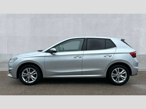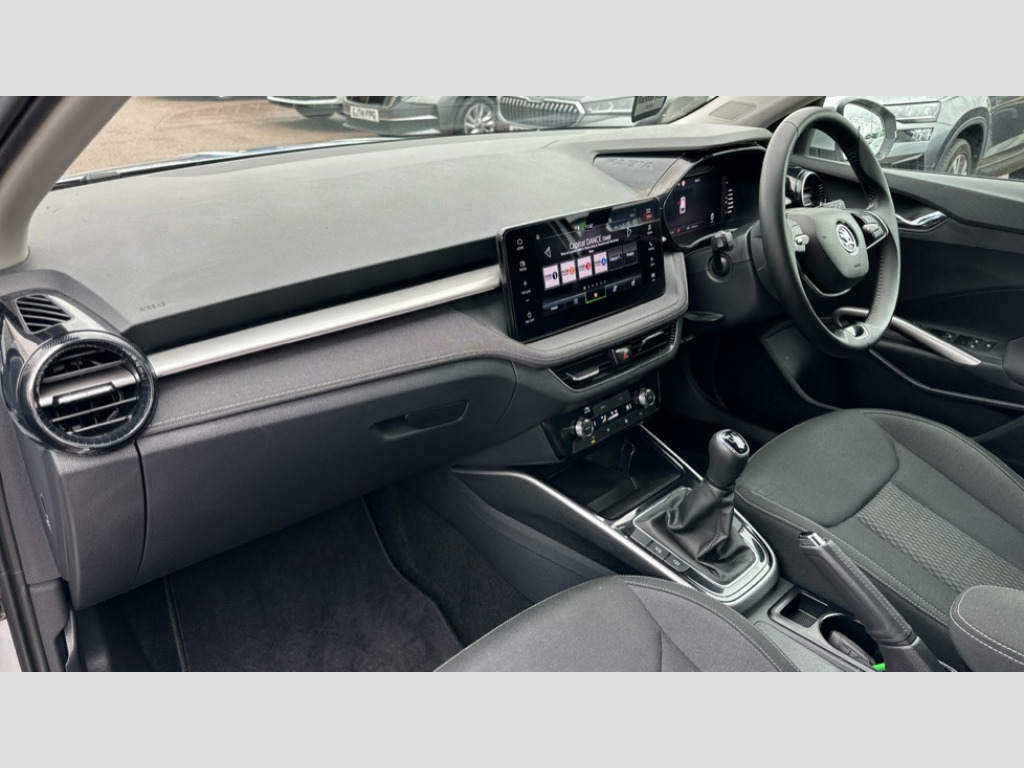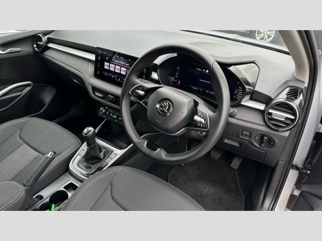 Skoda Fabia 1.0 TSI 116 SE L 5dr Advanced driver attention and drowsiness monitor, Bluetooth connection, Electromechanical power steering, Exterior temperature gauge, Service interval indicator, Traffic sign recognition, Virtual cockpit with 10.25" colour display, Wireless SmartLink for Apple CarPlay and Android Auto, 6 Speakers (4 in front and 2 in rear), 9.2" colour display skoda navigation system with voice control and web radio, Auxiliary socket for external MP3 player, DAB digital radio reception, Auto dimming rear view mirror, Body colour door mirrors, Body coloured bumpers, Chrome window surround, Door mirror integrated indicators, Front and rear electric windows, Front window wiper intermittent control, Headlight range control - Automatic, Ice scraper in fuel cap, LED daytime running lights with coming and leaving home feature, LED rear lights, Privacy glass, Rear LED fog light, Rear side wing doors, Rear window wiper with washing nozzles, Roof mounted spoiler, SKODA tailgate lettering in chrome, Third brake light, 2 reading lights in front and 2 reading lights in rear, 3 rear headrests, Backrest split and folding, Central console with removable cup holder and storage box, Chrome handbrake release button, Comfort seats, Door sills with fabia badging, Dual zone air conditioning with climatronic electronic control, Fabric upholstery, Front centre armrest, Gearshift knob/handle in leather, Hand brake lever handle in leather, Height adjustable front headrests, Height adjustable front seats, Height adjustable steering wheel, ISOFIX and TopTether anchorage points to the outer rear seats, ISOFIX and TopTether on the front passenger seat, Luggage compartment lighting, Manually adjustable lumbar support in front seats, Metallic grey interior door handles, Pollen filter, Rear seat bench unsplit, Single front passenger seat, Storm grey headlining, Sun visors with mirror and airbag label on passenger side, Textile floor mats, Ticket holder, Umbrella in drivers door, 3-point height adjustable front seats belts with pretensioner and force limiter, Automatic warning lights in case of crash, Driver and passengers airbag with switch off function, e-Call+, ESC including ABS, MSR, ASR, EDS, HBA and XDS, Front and rear seat belt warning, FRONT ASSIST (AEB City and AEB Inter Urban), Front side airbags, Head airbags, One tone horn, Pedestrian protection, Three rear 3-points safety seat belts with pretensioner and force limiter including stop function for outer rear seat belts, Tyre pressure monitoring system, Anti-theft alarm system including immobiliser, interior monitoring, backup horn, and towing protection, Central locking with radio remote control, interior controls, SAFE function and 2 foldable keys, Chrome edged air vents, Metallic grey central console cover, Metallic grey upper decorative trim, Satin black door and side trim panel in front, Textile microsuede grey lower decorative trim with art grey stitching, Anti-theft wheel bolts protection, Super-low rolling resistance tyres