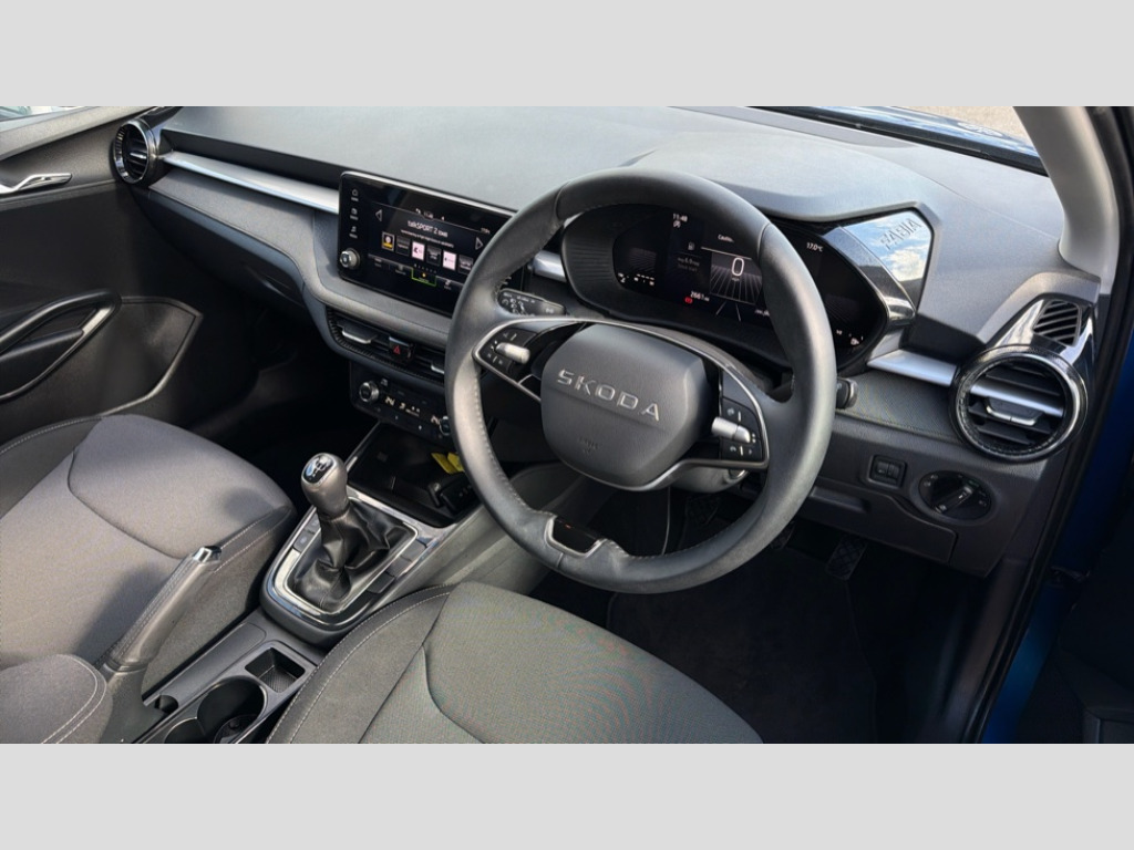 Skoda Fabia 1.0 TSI SE Edition 5dr 8" Digital instrument display, Advanced driver attention and drowsiness monitor, Bluetooth connection, Electromechanical power steering, Exterior temperature gauge, Service interval indicator, Traffic sign recognition, Wireless SmartLink for Apple CarPlay and Android Auto, 6 Speakers (4 in front and 2 in rear), 8.25" Skoda infotainment touchscreen display, Auxiliary socket for external MP3 player, DAB digital radio reception, Auto dimming rear view mirror, Body colour door mirrors, Body coloured bumpers, Door mirror integrated indicators, Front and rear electric windows, Front window wiper intermittent control, Headlight range control - Automatic, Ice scraper in fuel cap, LED 3rd brake light, LED daytime running lights with coming and leaving home feature, LED rear lights, Rear LED fog light, Rear side wing doors, Rear window wiper with washing nozzles, Roof mounted spoiler, SKODA tailgate lettering in chrome, Unique dark chrome design logo on alloy wheels, 2 reading lights in front and 2 reading lights in rear, 3 rear headrests, Backrest split and folding, Central console with removable cup holder and storage box, Chrome handbrake release button, Dual zone air conditioning with climatronic electronic control, Fabric upholstery, Front centre armrest, Gearshift knob/handle in leather, Grain satin black interior door handles, Hand brake lever handle in leather, Height adjustable front headrests, Height adjustable front seats, Height adjustable steering wheel, ISOFIX and TopTether anchorage points to the outer rear seats, ISOFIX and TopTether on the front passenger seat, Luggage compartment lighting, Manually adjustable lumbar support in front seats, Pollen filter, Rear seat bench unsplit, Single front passenger seat, Skoda lettering on steering wheel, Storm grey headlining, Sun visors with mirror and airbag label on passenger side, Textile floor mats, Ticket holder, Umbrella in drivers door, 3-point height adjustable front seats belts with pretensioner and force limiter, Automatic warning lights in case of crash, Driver and passengers airbag with switch off function, e-Call+, ESC including ABS, MSR, ASR, EDS, HBA and XDS, Front and rear seat belt warning, FRONT ASSIST (AEB City and AEB Inter Urban), Front side airbags, Head airbags, One tone horn, Pedestrian protection, Three rear 3-points safety seat belts with pretensioner and force limiter including stop function for outer rear seat belts, Tyre pressure monitoring system, Anti-theft alarm system including immobiliser, interior monitoring, backup horn, and towing protection, Central locking with radio remote control, interior controls, SAFE function and 2 foldable keys, Black painted air vents, Grain satin black central console cover, Metallic grey upper decorative trim, Satin black door and side trim panel in front, Textile Kota grey lower decorative inserts, Anti-theft wheel bolts protection, Super-low rolling resistance tyres