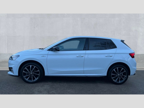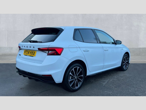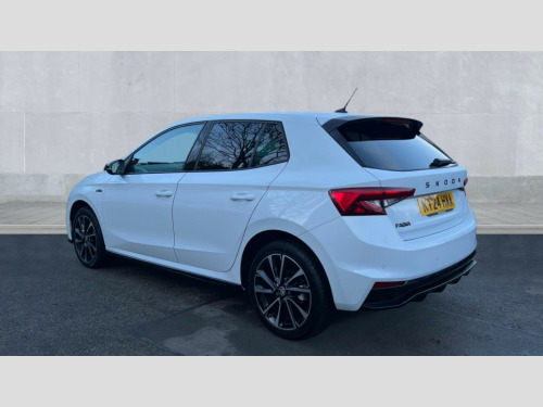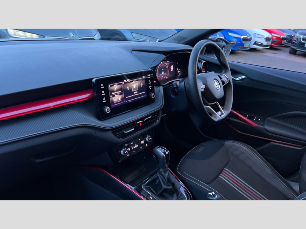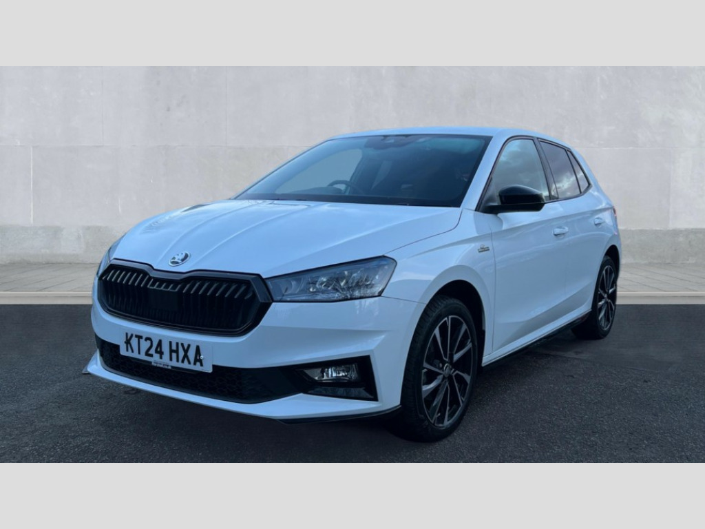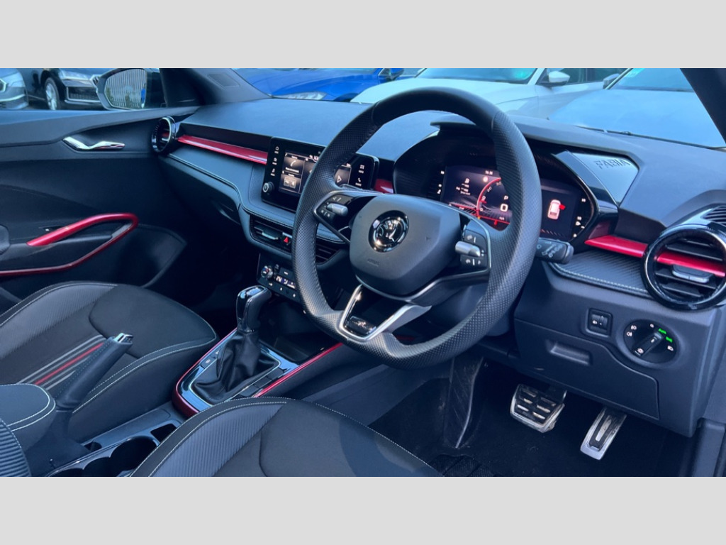 Skoda Fabia 1.5 TSI 150 Monte Carlo 5dr DSG Advanced driver attention and drowsiness monitor, Bluetooth connection, Electromechanical power steering, Exterior temperature gauge, Service interval indicator, Traffic sign recognition, Virtual cockpit with 10.25" colour display, Wireless SmartLink for Apple CarPlay and Android Auto, 6 Speakers (4 in front and 2 in rear), Auxiliary socket for external MP3 player, DAB digital radio reception, Auto dimming rear view mirror, Black radiator grille, Body coloured bumpers, Door mirror integrated indicators, Front and rear electric windows, Front window wiper intermittent control, Headlight range control - Automatic, Ice scraper in fuel cap, LED daytime running lights with coming and leaving home feature, LED rear lights, Monte Carlo badging, Privacy glass, Rear LED fog light, Rear side wing doors, Rear window wiper with washing nozzles, Roof mounted spoiler, SKODA tailgate lettering in black, Sports bumpers, Third brake light, 3 rear headrests, Aluminium pedals, Backrest split and folding, Black headlining, Central console with removable cup holder and storage box, Chrome handbrake release button, Door sills with fabia badging, Fabric/artificial leather upholstery, Front centre armrest, Front sports seats, Gearshift knob/handle in leather, Hand brake lever handle in leather, Height adjustable front headrests, Height adjustable front seats, Height adjustable steering wheel, ISOFIX and TopTether anchorage points to the outer rear seats, ISOFIX and TopTether on the front passenger seat, Luggage compartment lighting, Manually adjustable lumbar support in front seats, Metallic painted red central console cover, Metallic red interior door handles, Pollen filter, Rear seat bench unsplit, Single front passenger seat, Sun visors with mirror and airbag label on passenger side, Textile floor mats, Ticket holder, Umbrella in drivers door, 3-point height adjustable front seats belts with pretensioner and force limiter, Automatic warning lights in case of crash, Driver and passengers airbag with switch off function, e-Call+, ESC including ABS, MSR, ASR, EDS, HBA and XDS, Front and rear seat belt warning, FRONT ASSIST (AEB City and AEB Inter Urban), Front side airbags, Head airbags, Hill hold control, One tone horn, Pedestrian protection, Three rear 3-points safety seat belts with pretensioner and force limiter including stop function for outer rear seat belts, Tyre pressure monitoring system, Anti-theft alarm system including immobiliser, interior monitoring, backup horn, and towing protection, Central locking with radio remote control, interior controls, SAFE function and 2 foldable keys, Carbon effect door and side trim panels, Carbon effect lower decorative trim with white stitching, Red metallic upper decorative trim, Anti-theft wheel bolts protection, Super-low rolling resistance tyres