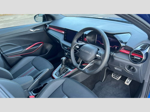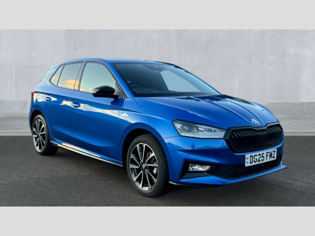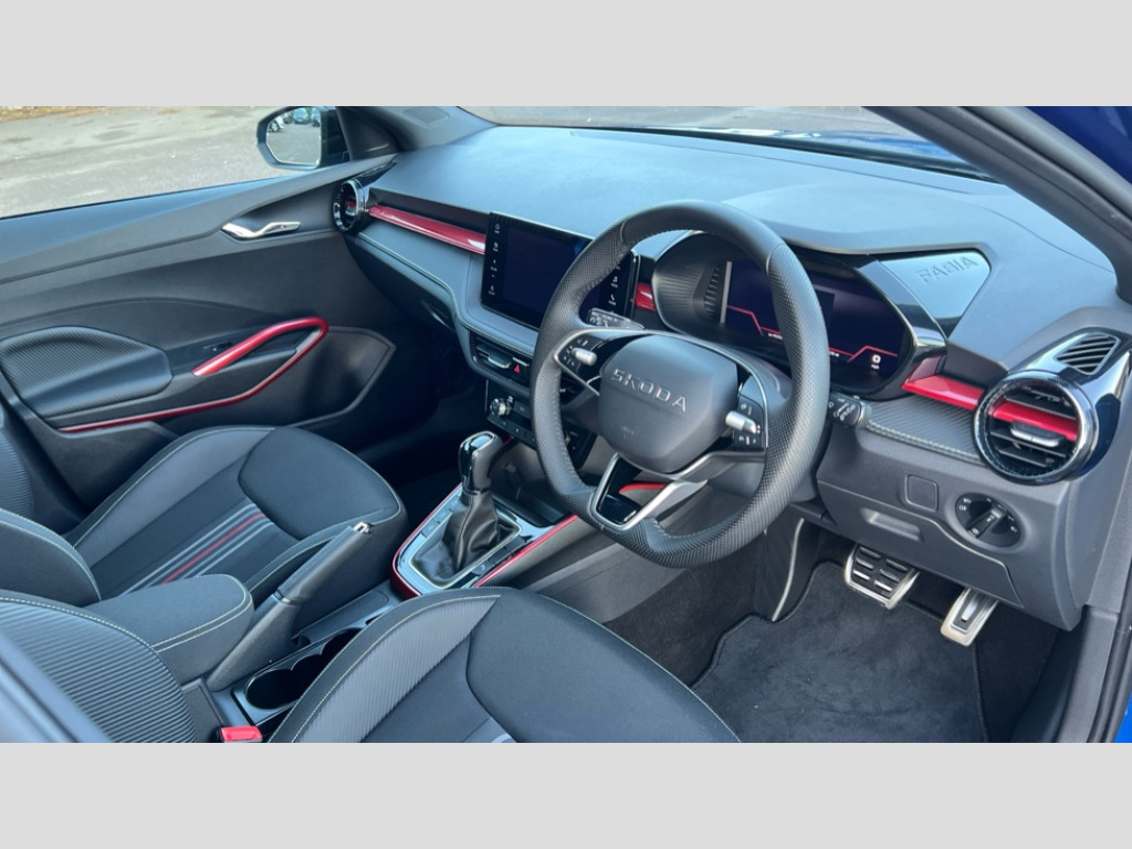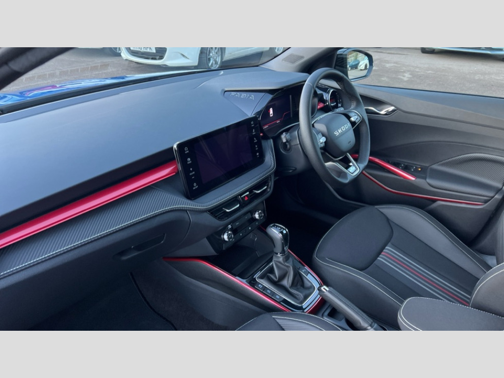 Skoda Fabia 1.5 TSI 150 Monte Carlo Edition 5dr DSG Advanced driver attention and drowsiness monitor, Bluetooth connection, Electromechanical power steering, Exterior temperature gauge, Service interval indicator, Traffic sign recognition, Virtual cockpit with 10.25" colour display, Wireless SmartLink for Apple CarPlay and Android Auto, 6 Speakers (4 in front and 2 in rear), 9.2" colour display skoda navigation system with voice control and web radio, Auxiliary socket for external MP3 player, DAB digital radio reception, Auto dimming rear view mirror, Black radiator grille, Body coloured bumpers, Door mirror integrated indicators, Dynamic headlight range control, Front and rear electric windows, Front window wiper intermittent control, Ice scraper in fuel cap, LED 3rd brake light, LED daytime running lights with coming and leaving home feature, LED rear lights, Monte Carlo badging, Privacy glass, Rear LED fog light, Rear side wing doors, Rear window wiper with washing nozzles, Roof mounted spoiler, SKODA tailgate lettering in black, Sports bumpers, Unique dark chrome design logo on alloy wheels, 2 LED reading lights in front and rear, 3 rear headrests, Aluminium pedals, Backrest split and folding, Black headlining, Central console with removable cup holder and storage box, Chrome handbrake release button, Door sills with fabia badging, Dual zone air conditioning with climatronic electronic control, Fabric/artificial leather upholstery, Front centre armrest, Front sports seats, Gearshift knob/handle in leather, Hand brake lever handle in leather, Height adjustable front headrests, Height adjustable front seats, Height adjustable steering wheel, ISOFIX and TopTether anchorage points to the outer rear seats, ISOFIX and TopTether on the front passenger seat, Luggage compartment lighting, Manually adjustable lumbar support in front seats, Metallic painted red central console cover, Metallic red interior door handles, Pollen filter, Rear seat bench unsplit, Single front passenger seat, Skoda lettering on steering wheel, Sun visors with mirror and airbag label on passenger side, Textile floor mats, Ticket holder, Umbrella in drivers door, Convenience pack - Fabia, Light and view pack plus - Fabia, 3-point height adjustable front seats belts with pretensioner and force limiter, Automatic warning lights in case of crash, Driver and passengers airbag with switch off function, e-Call+, ESC including ABS, MSR, ASR, EDS, HBA and XDS, Front and rear seat belt warning, FRONT ASSIST (AEB City and AEB Inter Urban), Front side airbags, Head airbags, Hill hold control, One tone horn, Pedestrian protection, Three rear 3-points safety seat belts with pretensioner and force limiter including stop function for outer rear seat belts, Tyre pressure monitoring system, Anti-theft alarm system including immobiliser, interior monitoring, backup horn, and towing protection, Central locking with radio remote control, interior controls, SAFE function and 2 foldable keys, Black painted air vents, Carbon effect door and side trim panels, Carbon effect lower decorative trim with white stitching, Red metallic upper decorative trim, Anti-theft wheel bolts protection, Super-low rolling resistance tyres