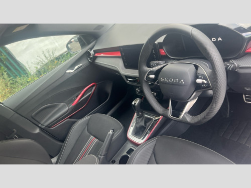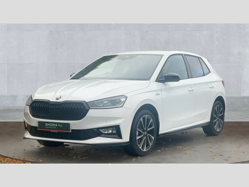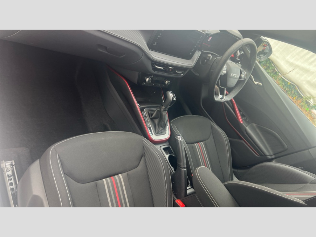 Skoda Fabia 1.5 TSI 150 Monte Carlo Edition 5dr DSG Advanced driver attention and drowsiness monitor, Bluetooth connection, Electromechanical power steering, Exterior temperature gauge, Service interval indicator, Traffic sign recognition, Virtual cockpit with 10.25" colour display, Wireless SmartLink for Apple CarPlay and Android Auto, 6 Speakers (4 in front and 2 in rear), 9.2" colour display skoda navigation system with voice control and web radio, Auxiliary socket for external MP3 player, DAB digital radio reception, Auto dimming rear view mirror, Black radiator grille, Body coloured bumpers, Door mirror integrated indicators, Dynamic headlight range control, Front and rear electric windows, Front window wiper intermittent control, Ice scraper in fuel cap, LED 3rd brake light, LED daytime running lights with coming and leaving home feature, LED rear lights, Monte Carlo badging, Privacy glass, Rear LED fog light, Rear side wing doors, Rear window wiper with washing nozzles, Roof mounted spoiler, SKODA tailgate lettering in black, Sports bumpers, Unique dark chrome design logo on alloy wheels, 2 LED reading lights in front and rear, 3 rear headrests, Aluminium pedals, Backrest split and folding, Black headlining, Central console with removable cup holder and storage box, Chrome handbrake release button, Door sills with fabia badging, Dual zone air conditioning with climatronic electronic control, Fabric/artificial leather upholstery, Front centre armrest, Front sports seats, Gearshift knob/handle in leather, Hand brake lever handle in leather, Height adjustable front headrests, Height adjustable front seats, Height adjustable steering wheel, ISOFIX and TopTether anchorage points to the outer rear seats, ISOFIX and TopTether on the front passenger seat, Luggage compartment lighting, Manually adjustable lumbar support in front seats, Metallic painted red central console cover, Metallic red interior door handles, Pollen filter, Rear seat bench unsplit, Single front passenger seat, Skoda lettering on steering wheel, Sun visors with mirror and airbag label on passenger side, Textile floor mats, Ticket holder, Umbrella in drivers door, Convenience pack - Fabia, Light and view pack plus - Fabia, 3-point height adjustable front seats belts with pretensioner and force limiter, Automatic warning lights in case of crash, Driver and passengers airbag with switch off function, e-Call+, ESC including ABS, MSR, ASR, EDS, HBA and XDS, Front and rear seat belt warning, FRONT ASSIST (AEB City and AEB Inter Urban), Front side airbags, Head airbags, Hill hold control, One tone horn, Pedestrian protection, Three rear 3-points safety seat belts with pretensioner and force limiter including stop function for outer rear seat belts, Tyre pressure monitoring system, Anti-theft alarm system including immobiliser, interior monitoring, backup horn, and towing protection, Central locking with radio remote control, interior controls, SAFE function and 2 foldable keys, Black painted air vents, Carbon effect door and side trim panels, Carbon effect lower decorative trim with white stitching, Red metallic upper decorative trim, Anti-theft wheel bolts protection, Super-low rolling resistance tyres