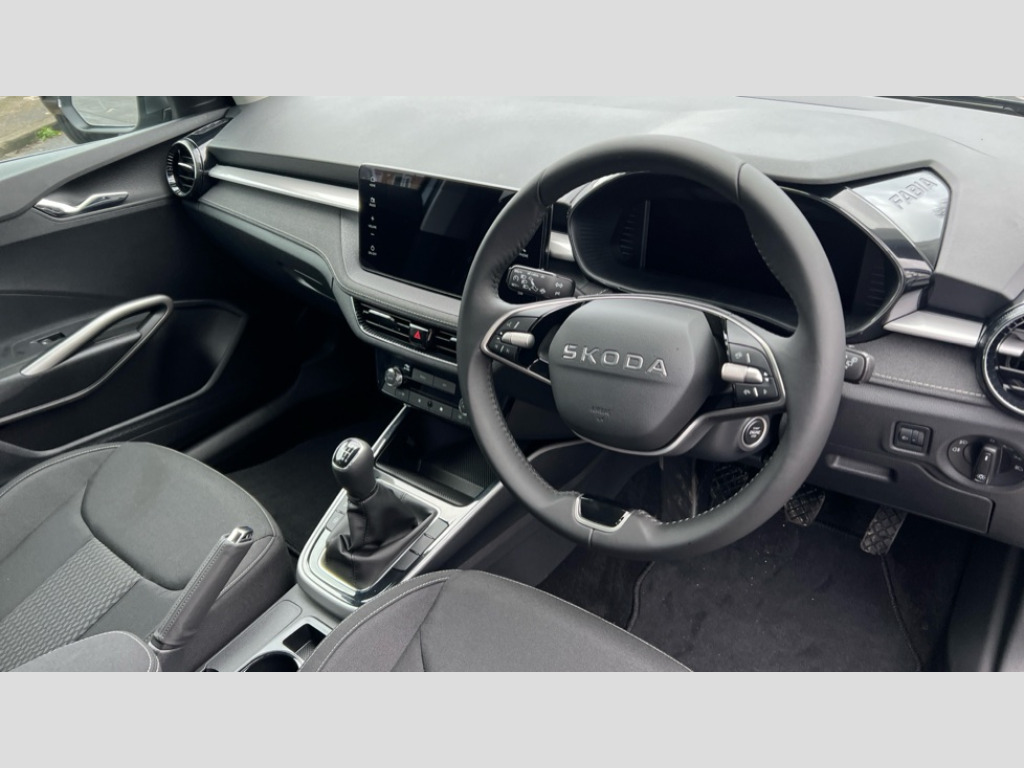 Skoda Fabia 1.0 TSI 116 SE L Edition 5dr Advanced driver attention and drowsiness monitor, Bluetooth connection, Driver alert system, Electromechanical power steering, Exterior temperature gauge, Service interval indicator, Traffic sign recognition, Virtual cockpit with 10.25" colour display, Wireless SmartLink for Apple CarPlay and Android Auto, 6 Speakers (4 in front and 2 in rear), 9.2" colour display skoda navigation system with voice control and web radio, Auxiliary socket for external MP3 player, DAB digital radio reception, Auto dimming rear view mirror, Body colour door mirrors, Body coloured bumpers, Chrome window surround, Door mirror integrated indicators, Front and rear electric windows, Front window wiper intermittent control, Headlight range control - Automatic, Ice scraper in fuel cap, LED 3rd brake light, LED daytime running lights with coming and leaving home feature, LED rear lights, Privacy glass, Rear LED fog light, Rear side wing doors, Rear window wiper with washing nozzles, Roof mounted spoiler, SKODA tailgate lettering in chrome, Unique dark chrome design logo on alloy wheels, 2 LED reading lights in front and rear, 3 rear headrests, Backrest split and folding, Central console with fixed cup holder and storage box, Chrome handbrake release button, Comfort seats, Door sills with fabia badging, Dual zone air conditioning with climatronic electronic control, Fabric upholstery, Front centre armrest, Gearshift knob/handle in leather, Grain satin black interior door handles, Hand brake lever handle in leather, Height adjustable front headrests, Height adjustable front seats, Height adjustable steering wheel, ISOFIX and TopTether anchorage points to the outer rear seats, ISOFIX and TopTether on the front passenger seat, Luggage compartment lighting, Manually adjustable lumbar support in front seats, Pollen filter, Rear seat bench unsplit, Single front passenger seat, Skoda lettering on steering wheel, Storm grey headlining, Sun visors with mirror and airbag label on passenger side, Textile floor mats, Ticket holder, Ambient lighting pack - Fabia Hatchback, 3-point height adjustable front seats belts with pretensioner and force limiter, Automatic warning lights in case of crash, Driver and passengers airbag with switch off function, e-Call+, ESC including ABS, MSR, ASR, EDS, HBA and XDS, Front and rear seat belt warning, FRONT ASSIST (AEB City and AEB Inter Urban), Front side airbags, Head airbags, One tone horn, Pedestrian protection, Three rear 3-points safety seat belts with pretensioner and force limiter including stop function for outer rear seat belts, Tyre pressure monitoring system, Anti-theft alarm system including immobiliser, interior monitoring, backup horn, and towing protection, Central locking with radio remote control, interior controls, SAFE function and 2 foldable keys, Chrome edged air vents, Grain satin black central console cover, Metallic grey upper decorative trim, Satin black door and side trim panel in front, Textile microsuede grey lower decorative trim with art grey stitching, Anti-theft wheel bolts protection, Super-low rolling resistance tyres