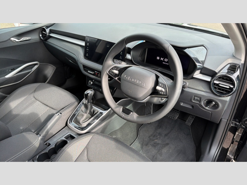 Skoda Fabia 1.0 TSI 116 SE L Edition 5dr DSG Advanced driver attention and drowsiness monitor, Bluetooth connection, Driver alert system, Electromechanical power steering, Exterior temperature gauge, Service interval indicator, Traffic sign recognition, Virtual cockpit with 10.25" colour display, Wireless SmartLink for Apple CarPlay and Android Auto, 6 Speakers (4 in front and 2 in rear), 9.2" colour display skoda navigation system with voice control and web radio, Auxiliary socket for external MP3 player, DAB digital radio reception, Auto dimming rear view mirror, Body colour door mirrors, Body coloured bumpers, Chrome window surround, Door mirror integrated indicators, Front and rear electric windows, Front window wiper intermittent control, Headlight range control - Automatic, Ice scraper in fuel cap, LED 3rd brake light, LED daytime running lights with coming and leaving home feature, LED rear lights, Privacy glass, Rear LED fog light, Rear side wing doors, Rear window wiper with washing nozzles, Roof mounted spoiler, SKODA tailgate lettering in chrome, Unique dark chrome design logo on alloy wheels, 2 LED reading lights in front and rear, 3 rear headrests, Backrest split and folding, Central console with fixed cup holder and storage box, Chrome handbrake release button, Comfort seats, Door sills with fabia badging, Dual zone air conditioning with climatronic electronic control, Fabric upholstery, Front centre armrest, Gearshift knob/handle in leather, Grain satin black interior door handles, Hand brake lever handle in leather, Height adjustable front headrests, Height adjustable front seats, Height adjustable steering wheel, ISOFIX and TopTether anchorage points to the outer rear seats, ISOFIX and TopTether on the front passenger seat, Luggage compartment lighting, Manually adjustable lumbar support in front seats, Pollen filter, Rear seat bench unsplit, Single front passenger seat, Skoda lettering on steering wheel, Storm grey headlining, Sun visors with mirror and airbag label on passenger side, Textile floor mats, Ticket holder, Umbrella in drivers door, Ambient lighting pack - Fabia Hatchback, 3-point height adjustable front seats belts with pretensioner and force limiter, Automatic warning lights in case of crash, Driver and passengers airbag with switch off function, e-Call+, ESC including ABS, MSR, ASR, EDS, HBA and XDS, Front and rear seat belt warning, FRONT ASSIST (AEB City and AEB Inter Urban), Front side airbags, Head airbags, Hill hold control, One tone horn, Pedestrian protection, Three rear 3-points safety seat belts with pretensioner and force limiter including stop function for outer rear seat belts, Tyre pressure monitoring system, Anti-theft alarm system including immobiliser, interior monitoring, backup horn, and towing protection, Central locking with radio remote control, interior controls, SAFE function and 2 foldable keys, Chrome edged air vents, Grain satin black central console cover, Metallic grey upper decorative trim, Satin black door and side trim panel in front, Textile microsuede grey lower decorative trim with art grey stitching, Anti-theft wheel bolts protection, Super-low rolling resistance tyres