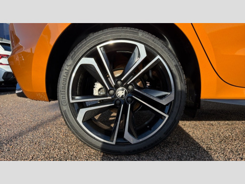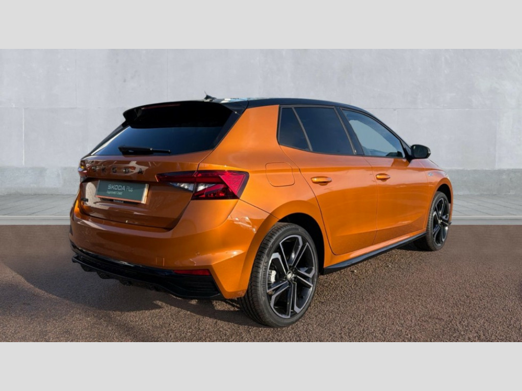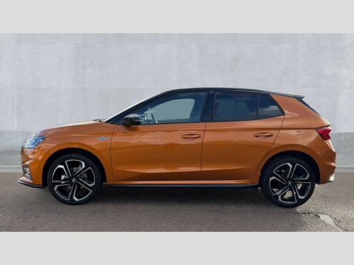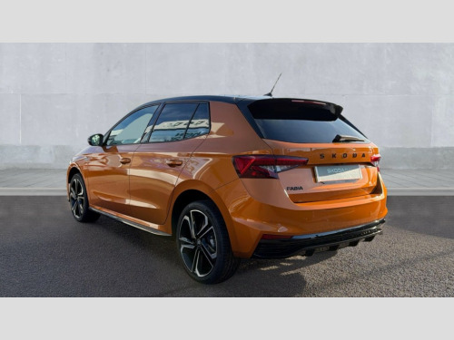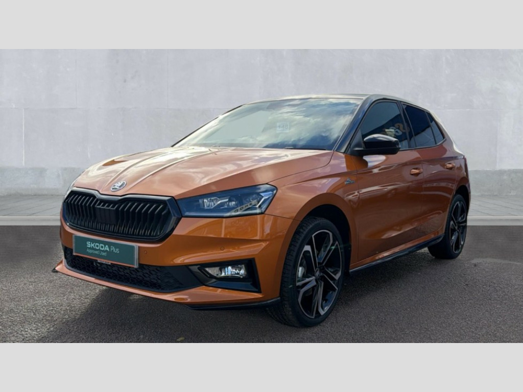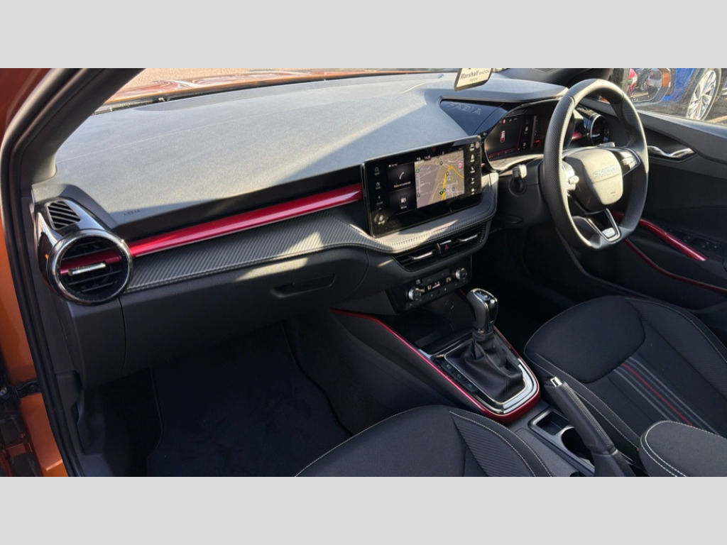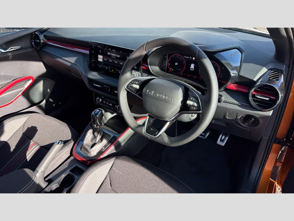 Skoda Fabia 1.5 TSI 150 Monte Carlo Edition 5dr DSG Advanced driver attention and drowsiness monitor, Bluetooth connection, Driver alert system, Electromechanical power steering, Exterior temperature gauge, Service interval indicator, Traffic sign recognition, Virtual cockpit with 10.25" colour display, Wireless SmartLink for Apple CarPlay and Android Auto, 6 Speakers (4 in front and 2 in rear), 9.2" colour display skoda navigation system with voice control and web radio, Auxiliary socket for external MP3 player, DAB digital radio reception, Auto dimming rear view mirror, Black radiator grille, Body coloured bumpers, Chrome window surround, Door mirror integrated indicators, Dynamic headlight range control, Front and rear electric windows, Front window wiper intermittent control, Ice scraper in fuel cap, LED 3rd brake light, LED daytime running lights with coming and leaving home feature, LED rear lights, Monte Carlo badging, Privacy glass, Rear LED fog light, Rear side wing doors, Rear window wiper with washing nozzles, Roof mounted spoiler, SKODA tailgate lettering in black, Sports bumpers, Unique dark chrome design logo on alloy wheels, 2 LED reading lights in front and rear, 3 rear headrests, Aluminium pedals, Backrest split and folding, Black headlining, Central console with fixed cup holder and storage box, Chrome handbrake release button, Door sills with fabia badging, Dual zone air conditioning with climatronic electronic control, Fabric/artificial leather upholstery, Front centre armrest, Front sports seats, Gearshift knob/handle in leather, Hand brake lever handle in leather, Height adjustable front headrests, Height adjustable front seats, Height adjustable steering wheel, ISOFIX and TopTether anchorage points to the outer rear seats, ISOFIX and TopTether on the front passenger seat, Luggage compartment lighting, Manually adjustable lumbar support in front seats, Metallic red interior door handles, Pollen filter, Rear seat bench unsplit, Single front passenger seat, Skoda lettering on steering wheel, Sun visors with mirror and airbag label on passenger side, Textile floor mats, Ticket holder, Umbrella in drivers door, Ambient lighting pack - Fabia Hatchback, Convenience pack - Fabia, Light and view pack plus - Fabia, 3-point height adjustable front seats belts with pretensioner and force limiter, Automatic warning lights in case of crash, Driver and passengers airbag with switch off function, e-Call+, ESC including ABS, MSR, ASR, EDS, HBA and XDS, Front and rear seat belt warning, FRONT ASSIST (AEB City and AEB Inter Urban), Front side airbags, Head airbags, Hill hold control, One tone horn, Pedestrian protection, Three rear 3-points safety seat belts with pretensioner and force limiter including stop function for outer rear seat belts, Tyre pressure monitoring system, Anti-theft alarm system including immobiliser, interior monitoring, backup horn, and towing protection, Central locking with radio remote control, interior controls, SAFE function and 2 foldable keys, Carbon effect door and side trim panels, Carbon effect lower decorative trim with white stitching, Grain satin black central console cover, Monte carlo air vents, Red metallic upper decorative trim, Anti-theft wheel bolts protection, Super-low rolling resistance tyres