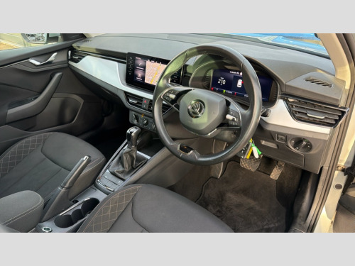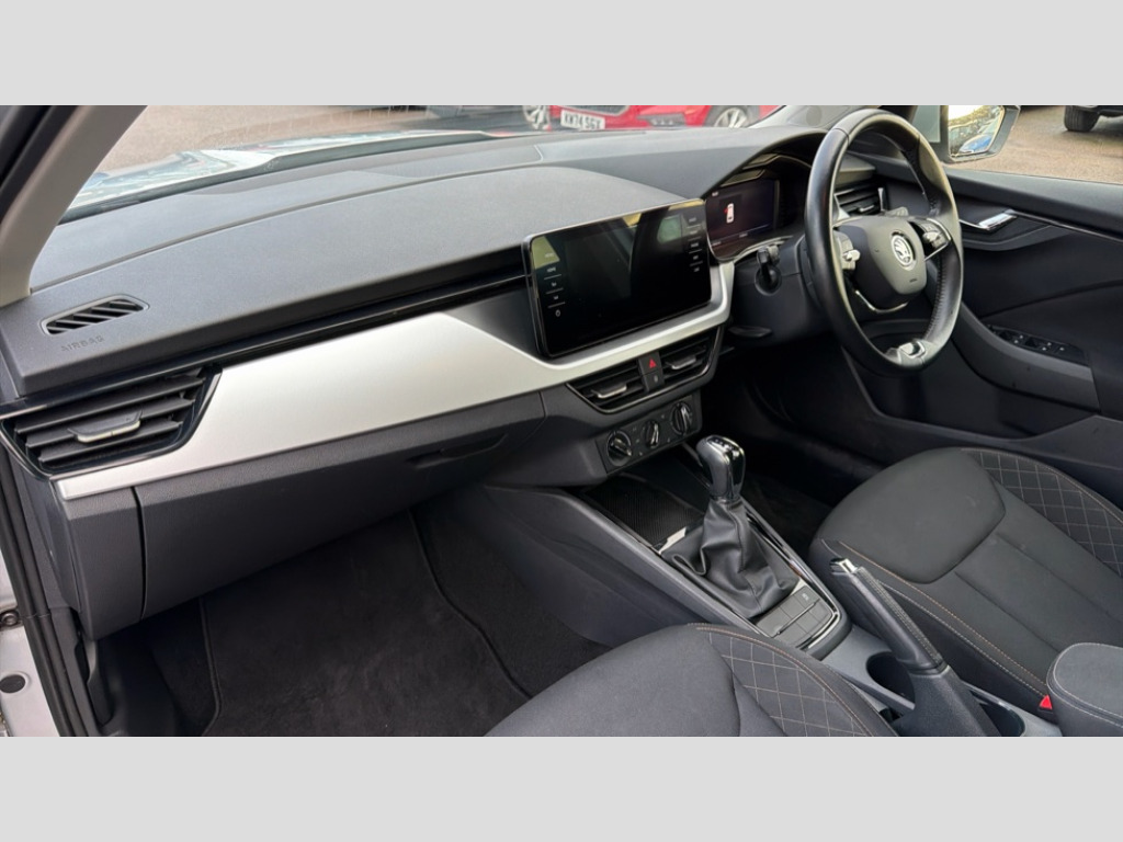 Skoda Kamiq 1.0 TSI 110 SE Drive 5dr DSG Amundsen satellite navigation with 9.2" glass colour touchscreen display, web radio, voice control and traffic sign recognition, Bluetooth system, E-call, Front assist system, Gesture control, PAS, Service indicator, Speed limiter, Wireless SmartLink for apple car play, android auto and mirrorlink, 8 Speakers, Auxiliary input socket, DAB Digital radio, Body colour bumpers, Body colour door mirrors and handles, Chrome grille surround, Dimming rear view mirror with black surround, Electrically adjustable and heated door mirrors, Front and rear electric windows, Headlight range control, Heated rear window, LED rear lights - low functionality, LED third brake light, Light sensors, Privacy glass, Rear fog lights, Rear side wing doors, Rear wiper, 12V Accessory socket in centre console, 3 seat bench in 2nd row, Chrome inner door handles, Cloth upholstery, Front head restraints, Glove compartment with illumination, Height adjustable driver and front passenger seats - manual, Ice scraper, Isofix child seat fittings on outer rear seats, ISOFIX on front passenger seat, Manual lumbar support for front seats, Rake/reach adjustable steering wheel, Reading lights, Single front passenger seat, Sun visors with illumination on front passenger, Textile floor mats, Third rear headrest, Top tether for front passenger seat, Umbrella in driver's door, 3x3 point rear seatbelts, Airbags - driver and front passenger, ESP, Front passenger airbag deactivation switch, Front side airbags with curtain airbags, Hill hold control, Manual parking brake, Manual rear child locks, One tone horn, Rear disc brakes, Seatbelt reminder for driver an co-driver, Traction control, Tyre pressure monitor, Anti-theft alarm system with interior monitoring, backup horn, towing protection and remote central locking with SAFE system, Anti-theft wheel bolts, Electronic engine immobilizer, Silver haptic decorative insert on the dashboard with hot stamping in glossy black