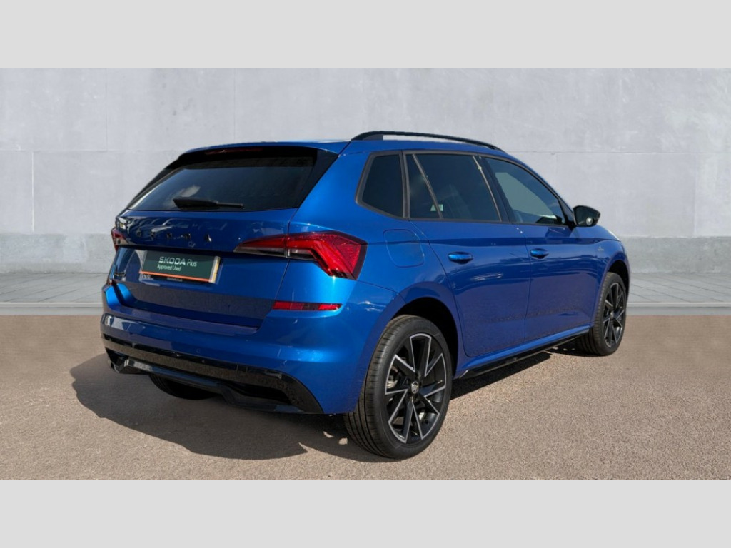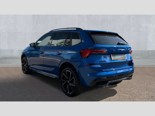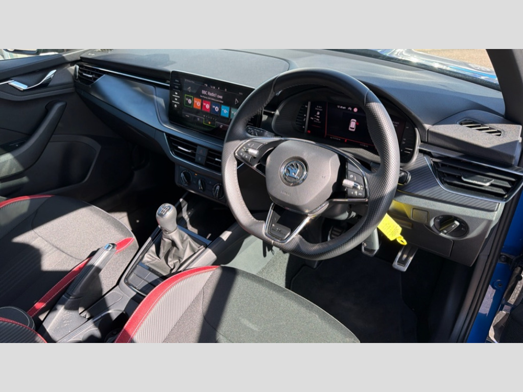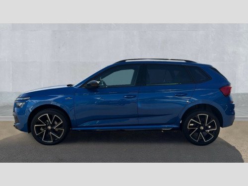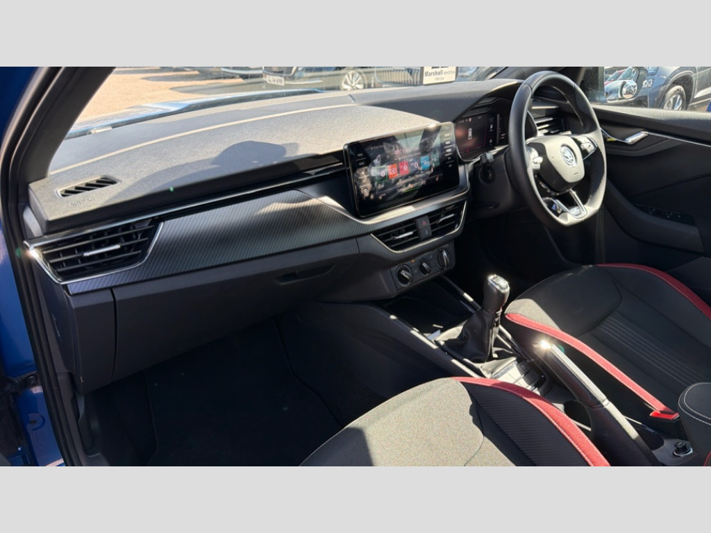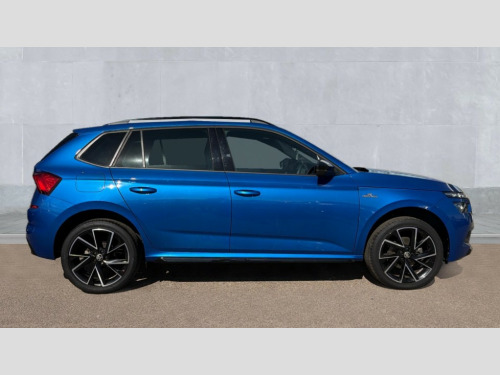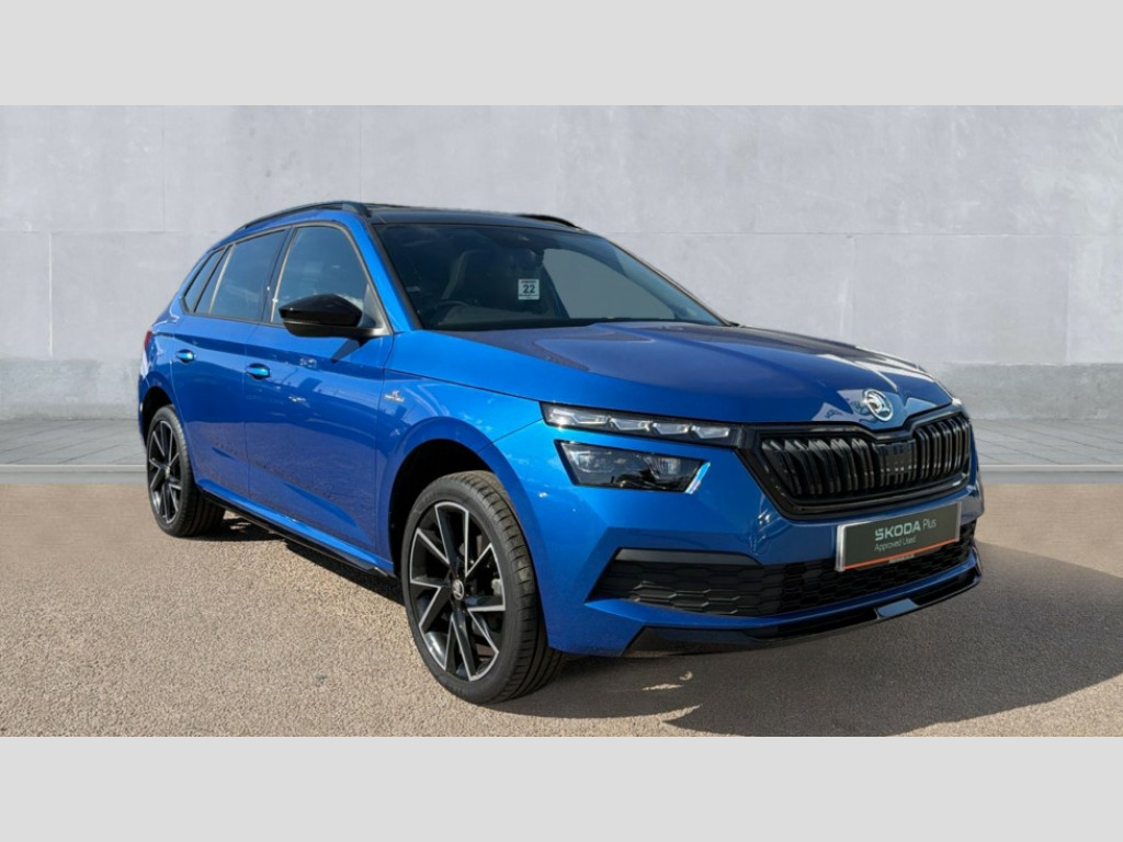 Skoda Kamiq 1.5 TSI Monte Carlo 5dr Amundsen satellite navigation with 9.2" glass colour touchscreen display, web radio, voice control and traffic sign recognition, Bluetooth system, E-call, Front assist system, Gesture control, PAS, Service indicator, Speed limiter, Wireless Smartlink for Apple CarPlay (wired for Android Auto), 8 Speakers, Auxiliary input socket, DAB Digital radio, Black door mirrors, Black radiator grille, Black rear diffuser, Body colour bumpers, Body colour door handles, Body colour roof spoiler, Boot lettering in black, Chrome grille surround, Dimming rear view mirror with black surround, Electrically adjustable and heated door mirrors, Fixed panoramic sunroof with black roof rails, Front and rear electric windows, Front sport bumper, Full LED headlights with adaptive front light system, cornering function, fog lights and dynamic indicators, Headlight range control, Heated rear window, High functionality rear led lights with dynamic indicators, KAMIQ Door sills, LED daytime running lights, LED third brake light, Light sensors, Monte carlo plaque, Privacy glass, Rain sensor, Rear fog lights, Rear side wing doors, Rear wiper, 12V Accessory socket in centre console, 3 seat bench in 2nd row, Aluminium pedals, Black ceiling for black/beige interior, Black roof lining, Chrome inner door handles, Cloth upholstery, Front head restraints, Glove compartment with illumination, Ice scraper, Isofix child seat fittings on outer rear seats, ISOFIX on front passenger seat, Leather gear lever, Manual lumbar support for front seats, Rake/reach adjustable steering wheel, Reading lights, Single front passenger seat, Sports seats, Sun visors with illumination on front passenger, Textile floor mats, Third rear headrest, Top tether for front passenger seat, Umbrella in driver's door, 3x3 point rear seatbelts, Airbags - driver and front passenger, ESP, Front passenger airbag deactivation switch, Front side airbags with curtain airbags, Hill hold control, Manual parking brake, Manual rear child locks, One tone horn, Rear disc brakes, Seatbelt reminder for driver an co-driver, Traction control, Tyre pressure monitor, Anti-theft alarm system with interior monitoring, backup horn, towing protection and remote central locking with SAFE system, Anti-theft wheel bolts, Electronic engine immobilizer, Chrome air vent surrounds, 18" Vega alloy wheels in black