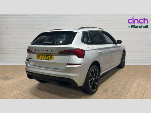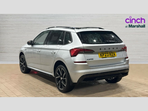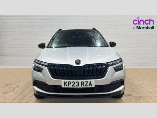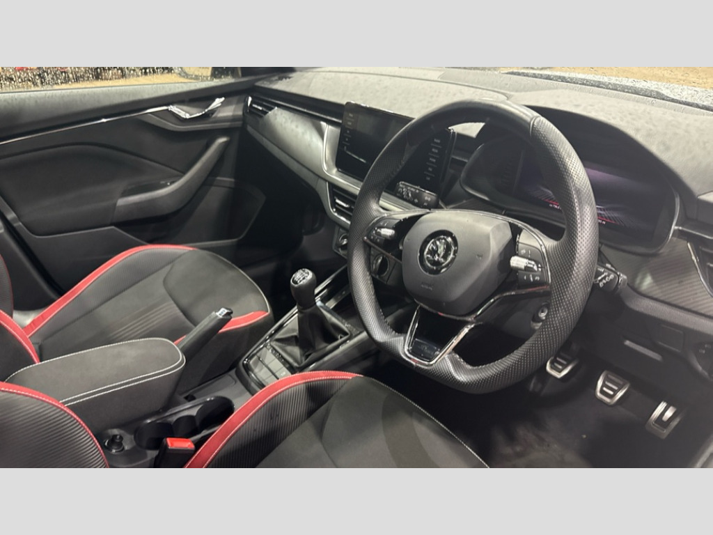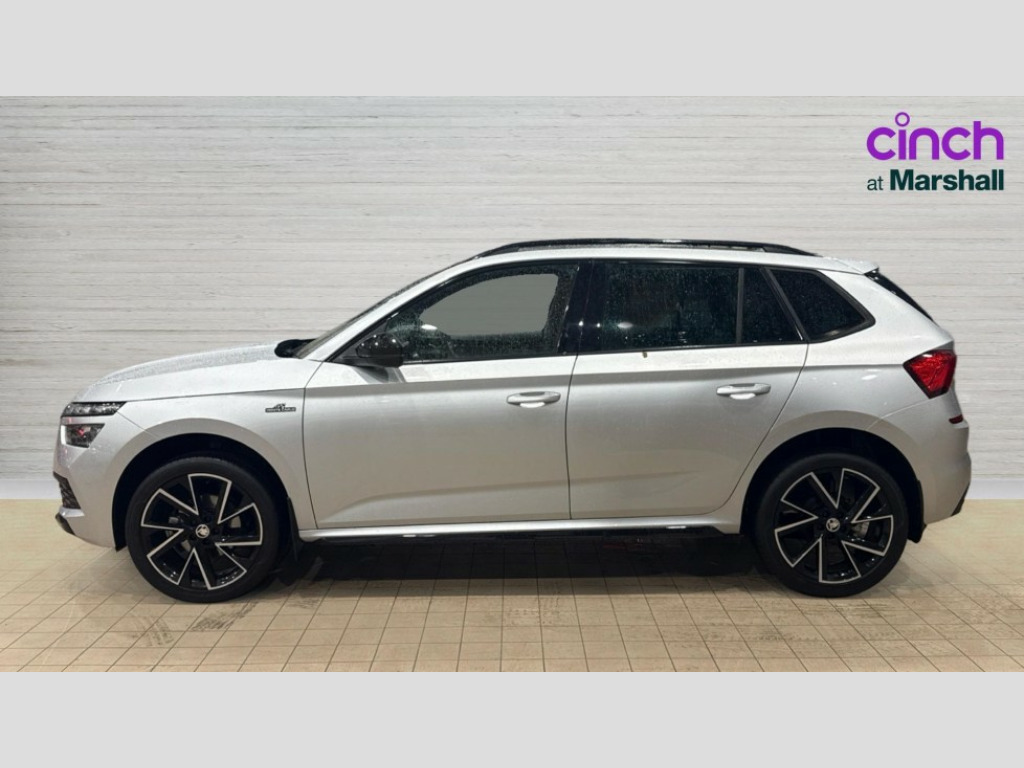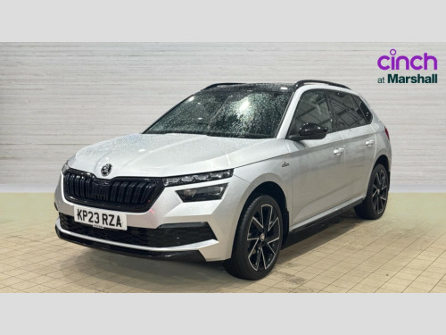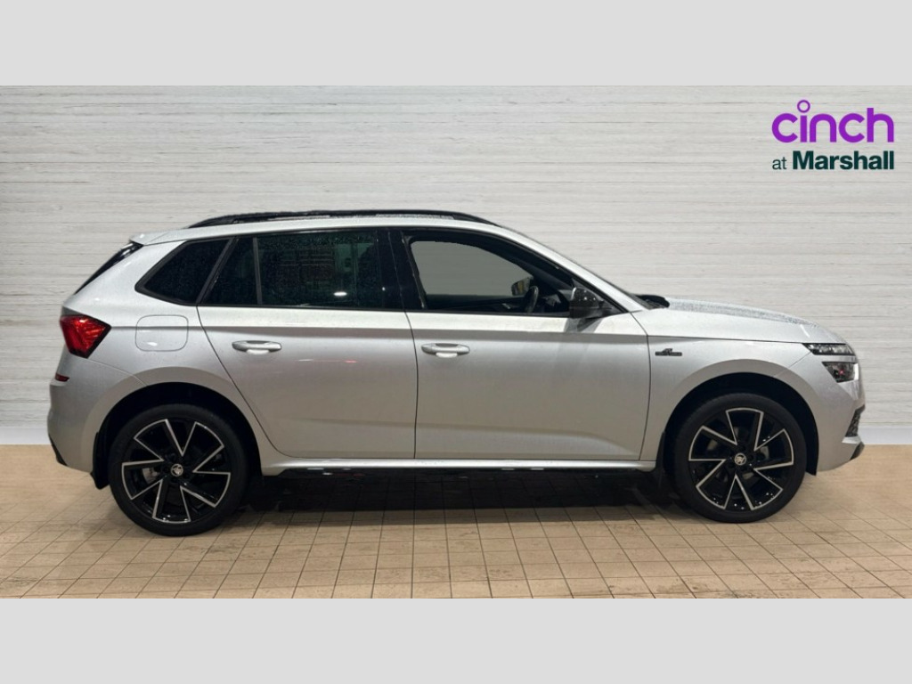Skoda Kamiq 1.5 TSI Monte Carlo 5dr Amundsen satellite navigation with 9.2" glass colour touchscreen display, web radio, voice control and traffic sign recognition, Bluetooth system, E-call, Front assist system, Gesture control, PAS, Service indicator, Speed limiter, Wireless Smartlink for Apple CarPlay (wired for Android Auto), 8 Speakers, Auxiliary input socket, DAB Digital radio, Black door mirrors, Black radiator grille, Black rear diffuser, Body colour bumpers, Body colour door handles, Body colour roof spoiler, Boot lettering in black, Chrome grille surround, Dimming rear view mirror with black surround, Electrically adjustable and heated door mirrors, Fixed panoramic sunroof with black roof rails, Front and rear electric windows, Front sport bumper, Full LED headlights with adaptive front light system, cornering function, fog lights and dynamic indicators, Headlight range control, Heated rear window, High functionality rear led lights with dynamic indicators, KAMIQ Door sills, LED daytime running lights, LED third brake light, Light sensors, Monte carlo plaque, Privacy glass, Rain sensor, Rear fog lights, Rear side wing doors, Rear wiper, 12V Accessory socket in centre console, 3 seat bench in 2nd row, Aluminium pedals, Black ceiling for black/beige interior, Black roof lining, Chrome inner door handles, Cloth upholstery, Front head restraints, Glove compartment with illumination, Ice scraper, Isofix child seat fittings on outer rear seats, ISOFIX on front passenger seat, Leather gear lever, Manual lumbar support for front seats, Rake/reach adjustable steering wheel, Reading lights, Single front passenger seat, Sports seats, Sun visors with illumination on front passenger, Textile floor mats, Third rear headrest, Top tether for front passenger seat, Umbrella in driver's door, 3x3 point rear seatbelts, Airbags - driver and front passenger, ESP, Front passenger airbag deactivation switch, Front side airbags with curtain airbags, Hill hold control, Manual parking brake, Manual rear child locks, One tone horn, Rear disc brakes, Seatbelt reminder for driver an co-driver, Traction control, Tyre pressure monitor, Anti-theft alarm system with interior monitoring, backup horn, towing protection and remote central locking with SAFE system, Anti-theft wheel bolts, Electronic engine immobilizer, Chrome air vent surrounds, 18" Vega alloy wheels in black