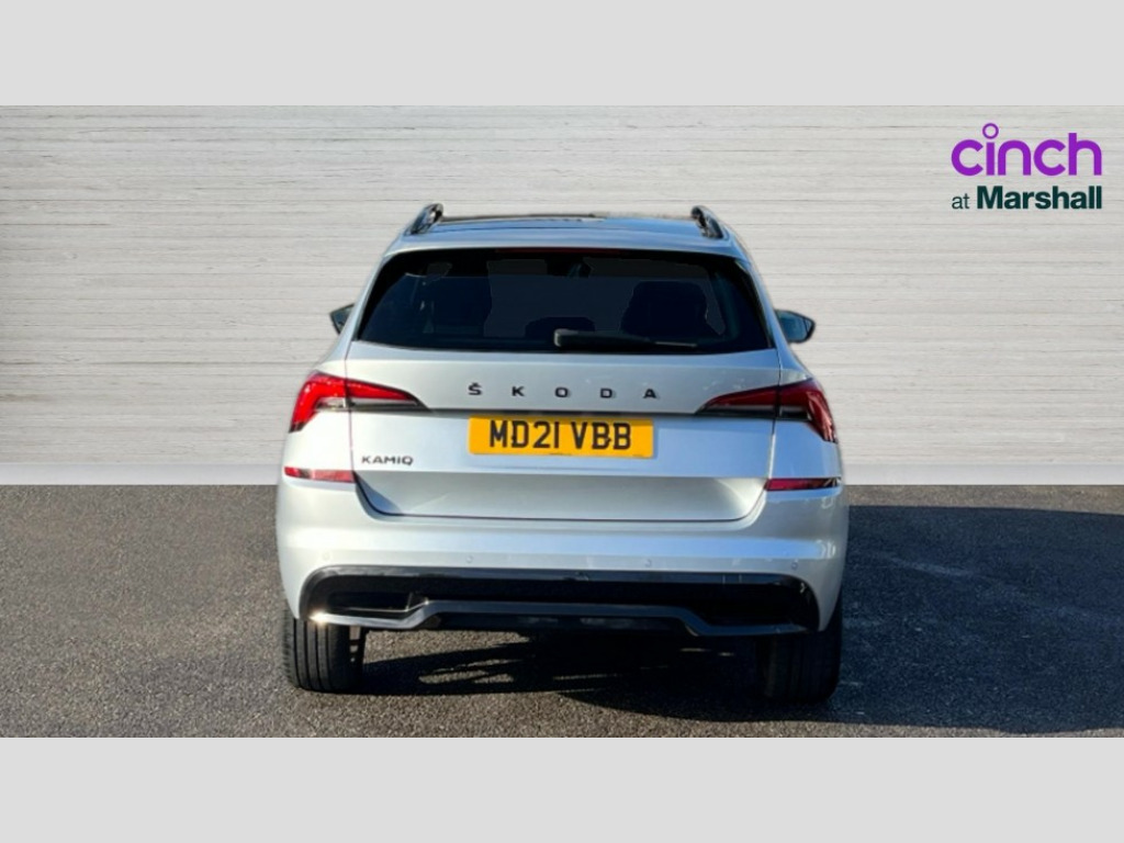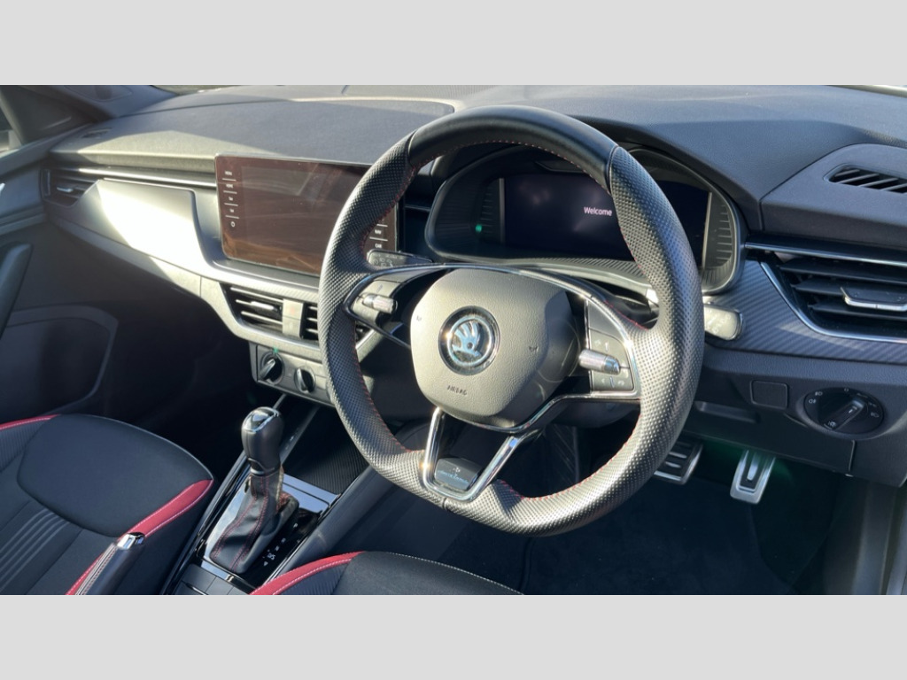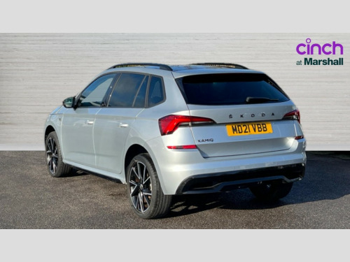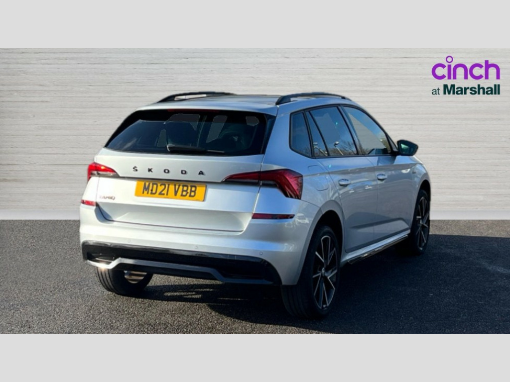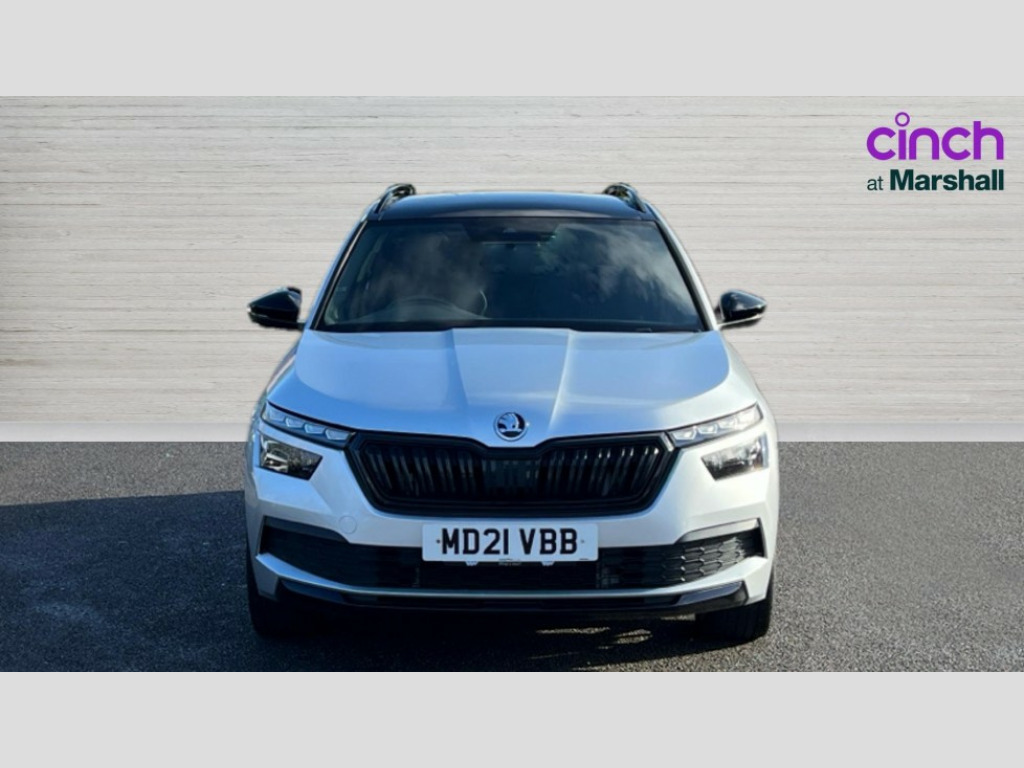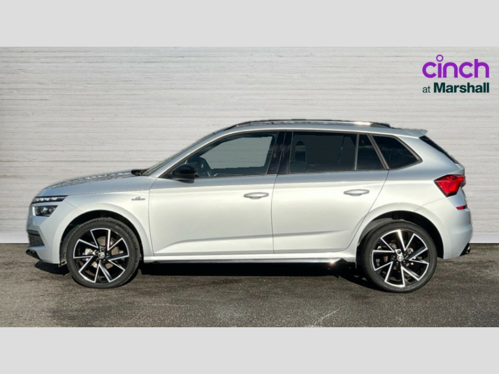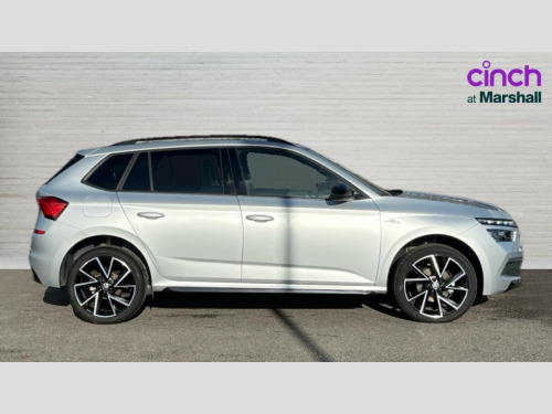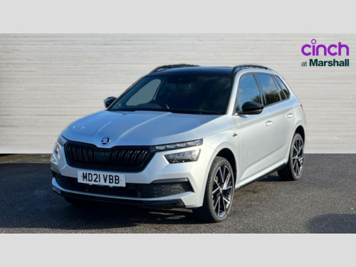 Skoda Kamiq 1.5 TSI Monte Carlo 5dr DSG Amundsen satellite navigation with 9.2" touchscreen display, voice control, virtual cockpit and web radio, Bluetooth system, E-call, Front assist system, Lane assist, PAS, Service indicator, Speed limiter, Trip computer, Virtual cockpit with 10.25" display, Wireless SmartLink for apple car play, android auto and mirrorlink, 2 USB - C ports with 1x adaptor cable, Auxiliary input socket, DAB Digital radio, Auto dimming rear view mirror, Black door mirrors, Black radiator grille, Black rear diffuser, Body colour bumpers, Body colour roof spoiler, Boot lettering in black, Chrome grille surround, Electrically adjustable and heated door mirrors, Fixed panoramic sunroof with black roof rails, Front and rear electric windows, Front sport bumper, Full LED headlights with adaptive front light system, dynamic indicators, cornering function and fog lights, Headlight range control, Heated rear window, High functionality rear led lights with dynamic indicators, KAMIQ Door sills, Monte carlo plaque, Privacy glass, Rear fog lights, Rear wiper, 12V Accessory socket in centre console, Aluminium pedals, Black ceiling for black/beige interior, Chrome inner door handles, Cloth upholstery, Front gesture control, Front head restraints, Glove compartment with illumination, Height adjustable passenger seat, Ice scraper, Isofix child seat fittings on outer rear seats, ISOFIX on front passenger seat, Leather gear lever, Manual lumbar support for front seats, Rake/reach adjustable steering wheel, Reading lights for driver and front passenger, Sports seats, Sun visor with make up mirror for front passenger, Textile floor mats, Third rear headrest, Top tether for front passenger seat, Umbrella in driver's door, 3x3 point rear seatbelts, Airbags - driver and front passenger, ESP, Front passenger airbag deactivation switch, Front side airbags with curtain airbags, Hill hold control, Manual parking brake, One tone horn, Rear disc brakes, Seatbelt reminder for driver an co-driver, Traction control, Tyre pressure monitor, Alarm with interior monitoring, back up horn and tilt sensor with safe function and towing protection, Anti-theft wheel bolts, Immobiliser, Remote central locking with SAFE system, Chrome air vent surrounds, 18" Vega alloy wheels in black