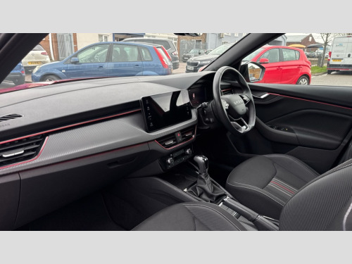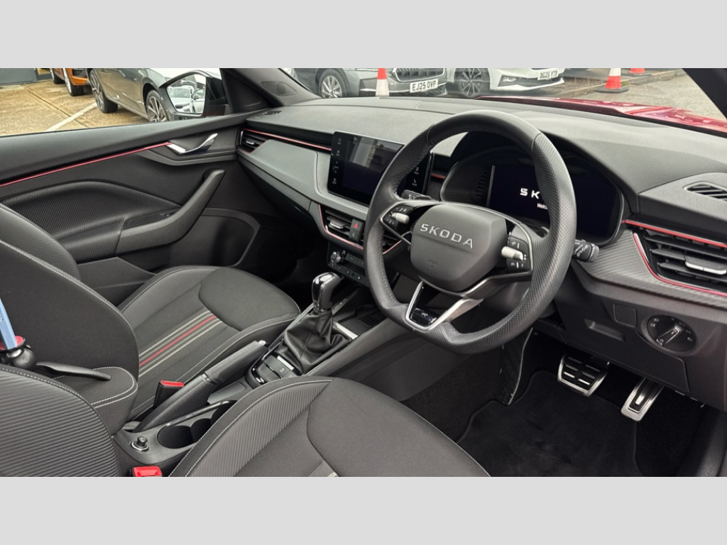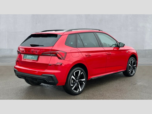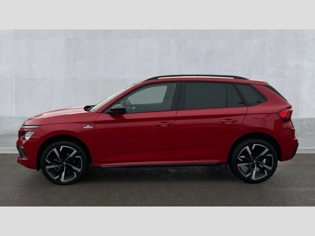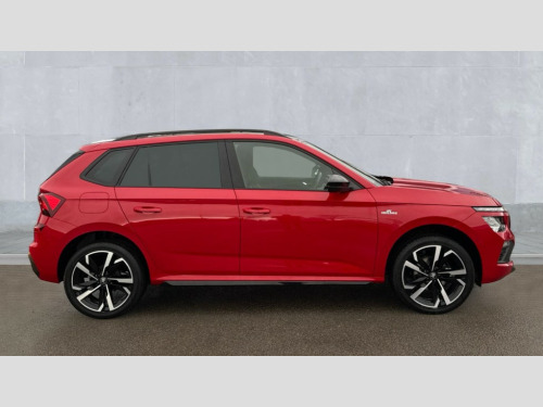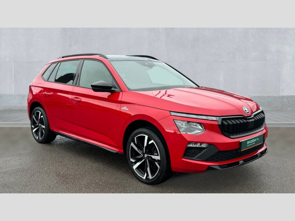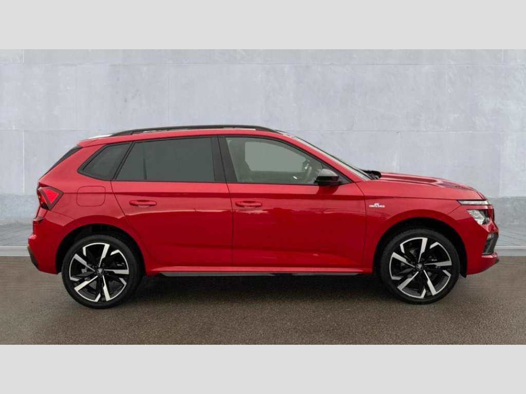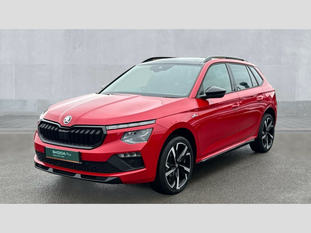 Skoda Kamiq 1.5 TSI Monte Carlo Edition 5dr DSG Advanced driver attention and drowsiness monitor, Bluetooth system, E-call, Front assist system, PAS, Rear parking sensors, Rear view camera, Service indicator, Speed limiter, Traffic sign recognition, Virtual cockpit with 10.25" display, Voice control system, Wireless smartlink, 4 USB C ports, 8 Speakers, 9.2" Skoda navigation display, DAB Digital radio, Auto dimming rear view mirror, Automatic headlight control with coming home and leaving home feature, Black door mirrors, Black radiator grille, Black rear diffuser, Black roof spoiler, Body colour bumpers, Body colour door handles, Boot lettering in black, Extended tailgate glass, Fixed panoramic sunroof with black roof rails, Front and rear electric windows, Heated rear window, LED daytime running lights, LED high beam, LED low beam, LED third brake light, Light sensors, Monte carlo plaque, Privacy glass, Rear side wing doors, Rear wiper, Ticket holder inside windscreen, 12V socket in luggage compartment, 3 seat bench in 2nd row, Aluminium pedals, Ambient lighting in white/red, Art leather carbon decor inserts, Art leather carbon door inserts, Black roof lining, Cargo elements, Chrome inner door handles, Driver and passenger sun visors with vanity mirror, Dual zone climate control, Front and rear roof lights, Front centre armrest, Front head restraints, Glove compartment with illumination, Height adjustable driver seat, Height adjustable front passenger seat, Ice scraper, Inner circulation control with pollen filter, ISOFIX on front passenger seat, Isofix preparation for back seats, Leather gearknob and handbrake lever, Manual lumbar support for front seats, Monte Carlo cloth upholstery, Net package and top tether hooks in boot space, Net under rear shelf, Pocket on the back of both front seats include mobile phone pockets, Rake/reach adjustable steering wheel, Reading lights, Rear centre armrests, Red hotstamping, Single front passenger seat, Sports seats, Textile floor mats, Third rear headrest, Top tether for front passenger seat, Umbrella in driver's door, Light and view plus package - Kamiq, 3x3 point rear seatbelts, Airbags - driver and front passenger, Disc brakes, ESP, Extended and predictive pedestrian/cyclist protection, Front passenger airbag deactivation switch, Front side airbags with curtain airbags, Hill hold control, Manual leather parking brake, Manual rear child locks, One tone horn, Seatbelt reminder for driver an co-driver, Traction control, Tyre pressure monitor, Anti-theft alarm system with interior monitoring, backup horn, towing protection and remote central locking with SAFE system, Anti-theft wheel bolts, Electronic engine immobilizer, 18" Ursa black diamond cut alloy wheels