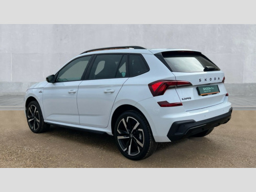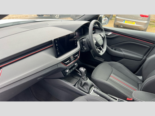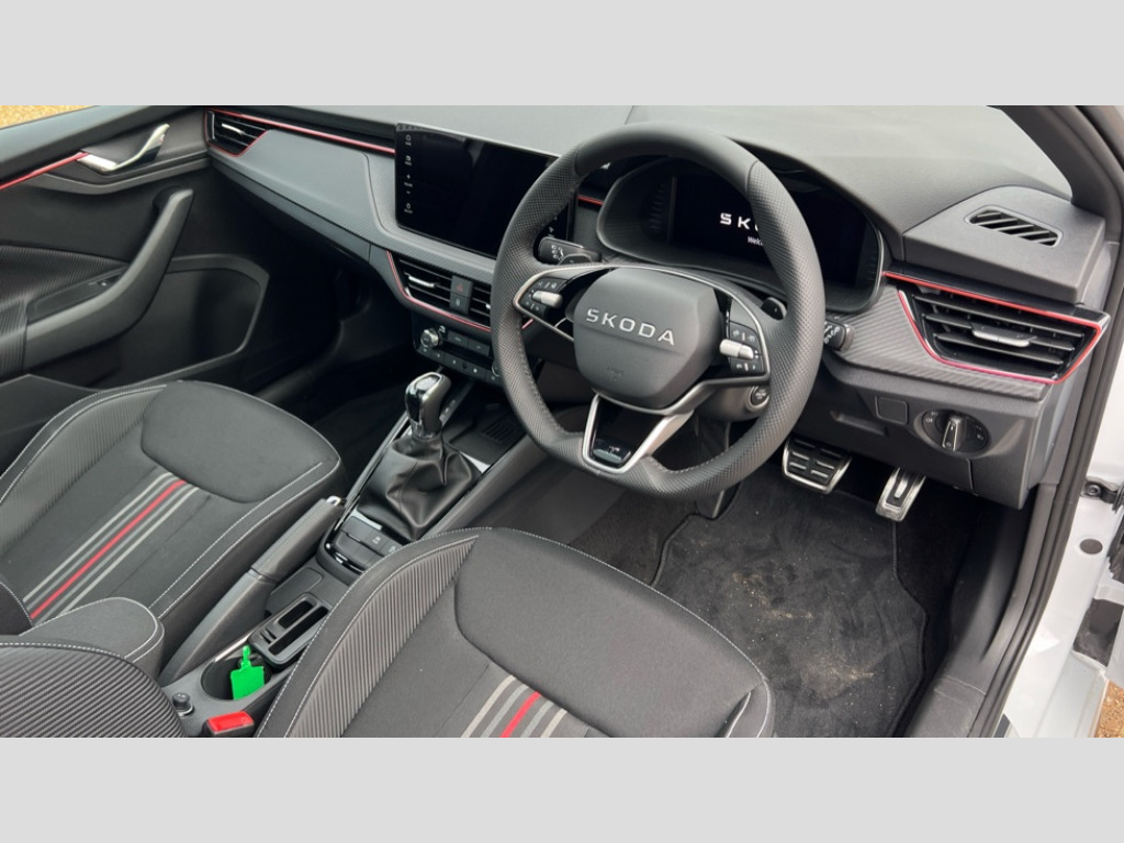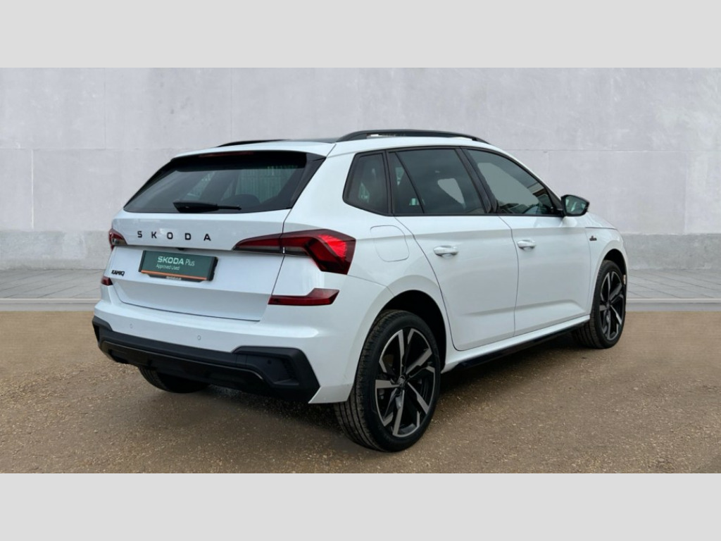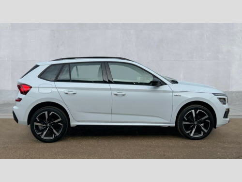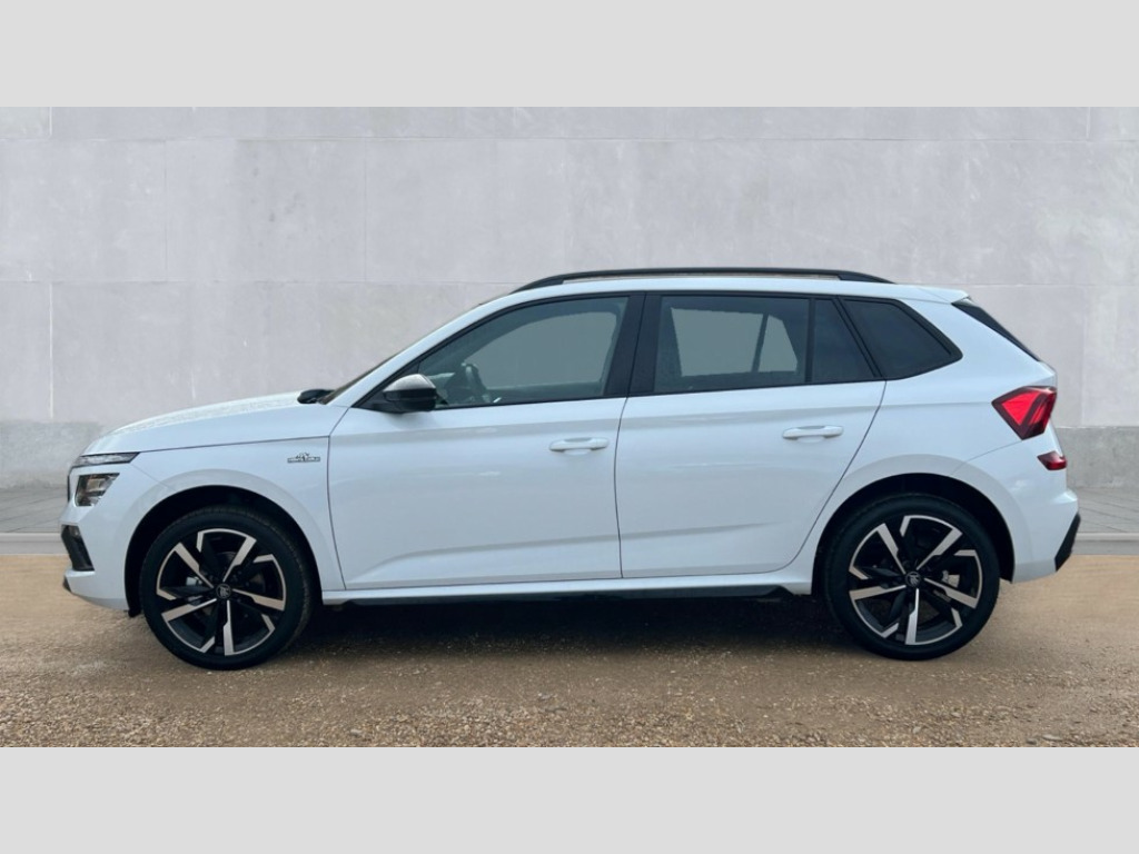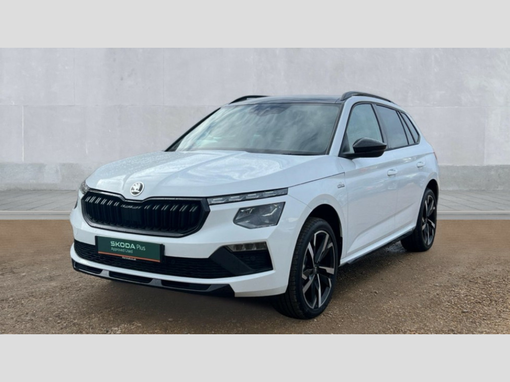 Skoda Kamiq 1.5 TSI Monte Carlo Edition 5dr DSG Advanced driver attention and drowsiness monitor, Bluetooth system, E-call, Front assist system, PAS, Rear parking sensors, Rear view camera, Service indicator, Speed limiter, Traffic sign recognition, Virtual cockpit with 10.25" display, Voice control system, Wireless smartlink, 4 USB C ports, 8 Speakers, 9.2" Skoda navigation display, DAB Digital radio, Auto dimming rear view mirror, Automatic headlight control with coming home and leaving home feature, Black radiator grille, Black rear diffuser, Black roof spoiler, Body colour bumpers, Body colour door handles, Boot lettering in black, Extended tailgate glass, Fixed panoramic sunroof with black roof rails, Front and rear electric windows, Heated rear window, LED daytime running lights, LED high beam, LED low beam, LED third brake light, Light sensors, Monte carlo plaque, Privacy glass, Rear side wing doors, Rear wiper, Ticket holder inside windscreen, 12V socket in luggage compartment, 3 seat bench in 2nd row, Aluminium pedals, Ambient lighting in white/red, Art leather carbon decor inserts, Art leather carbon door inserts, Black roof lining, Cargo elements, Chrome inner door handles, Driver and passenger sun visors with vanity mirror, Dual zone climate control, Front and rear roof lights, Front centre armrest, Front head restraints, Glove compartment with illumination, Height adjustable driver seat, Height adjustable front passenger seat, Ice scraper, Inner circulation control with pollen filter, ISOFIX on front passenger seat, Isofix preparation for back seats, Leather gearknob and handbrake lever, Manual lumbar support for front seats, Monte Carlo cloth upholstery, Net package and top tether hooks in boot space, Net under rear shelf, Pocket on the back of both front seats include mobile phone pockets, Rake/reach adjustable steering wheel, Reading lights, Rear centre armrests, Red hotstamping, Single front passenger seat, Sports seats, Textile floor mats, Third rear headrest, Top tether for front passenger seat, Umbrella in driver's door, Light and view plus package - Kamiq, 3x3 point rear seatbelts, Airbags - driver and front passenger, Disc brakes, ESP, Extended and predictive pedestrian/cyclist protection, Front passenger airbag deactivation switch, Front side airbags with curtain airbags, Hill hold control, Manual leather parking brake, Manual rear child locks, One tone horn, Seatbelt reminder for driver an co-driver, Traction control, Tyre pressure monitor, Anti-theft alarm system with interior monitoring, backup horn, towing protection and remote central locking with SAFE system, Anti-theft wheel bolts, Electronic engine immobilizer, 18" Ursa black diamond cut alloy wheels