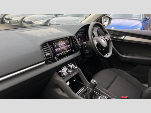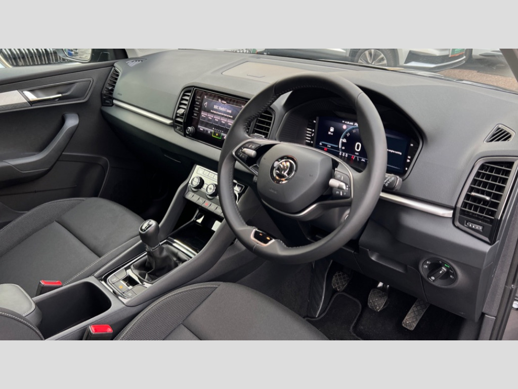 Skoda Karoq 1.0 TSI 116 SE Drive 5dr 8" Digital display, Advanced driver attention and drowsiness monitor, Amundsen navigation system with 8" touchscreen display and integrated WLAN and web radio, Electro-mechanical PAS, Emergency services call system, Lane assist, Outside temperature gauge, Sensor for driver assistance systems, Service interval indicator, SmartLink wireless for Apple and wired for Android, Start/stop system with regenerative braking, Traffic sign recognition, USB C Port x 2 in front centre console, Virtual Cockpit - 10.25" digital display, Wireless smartphone charging, 8 Speakers, DAB radio with Bluetooth, USB connection, Acoustic glass, Aero front windscreen wipers with intermittent function, Auto dimming rear view mirror with light and rain sensors, Black electric window control buttons, Body colour door mirrors and handles, Electric front and rear windows with child proof lock, Electrically adjustable heated folding and auto dimming door mirrors, Front fog lights, Headlight range control, Heated rear windscreen, LED daytime running lights, LED Headlights, LED rear lights with high functionality welcome effect and dynamic indicators, Light assistant (coming/leaving home/tunnel light), Plastic scuff plates in door apertures, Privacy glass, Rear side wing doors, Rear window wiper with washer system and intermittent control, Safety reflectors on front doors, Third brake light, 1.5 litre bottle holders in driver and front passenger door panels, 12V socket in boot, 12v socket in front centre armrest with storage compartment and rear air vents, 2 x Tablet holder, 3 rear height adjustable headrests, 3 seat bench in 2nd row, 4 foldable roof handles with rear coat hooks, Black floor carpet, Chrome inner door handles, Driver/front passenger reading lights, Foldable hooks in the boot, Folding tables on the front seat backrests, Front head restraints, Height adjustable driver and passenger seat, Height adjustable front three point seats belts with tensioners, Height/reach adjust steering wheel, Ice scraper, Illuminated glovebox, Illuminated luggage compartment, Interior noise suppression, Isofix child seat preparation for front passenger seat, Isofix child seat preparation outer rear, Loft fabric upholstery, Manual lumbar support for front seats, Pearl grey interior ceiling, Pen holder, Pollen filter, Rear boot cover, Rear reading lights, Rubbish bin door, Safety vest holder, Single front passenger seat, Storage box in upper central dashboard closed, Sunvisors with illuminated vanity mirrors, Textile floor mats, Ticket holder, Umbrella under passenger seat, Under passenger seat storage compartment, Non Smokers pack, Automatic door unlocking in case of crash, Automatic fuel cut off in case of crash, Driver airbag, Electronic parking brake with auto hold function, Emergency rear braking signal, ESC (incl. ABS+MSR+ASR+EDS+HBA+DSR+RBS+MKB), Front assist, Front side airbags, Head airbags, Hill hold control, Knee airbags, Passenger airbag with switch-off function, Pedestrian monitor, Seatbelt reminder signalisation and pretensioner for all seats, Three point seatbelts rear, Two tone horn, Tyre pressure monitor, Alarm with interior monitoring, back up horn and tilt sensor with safe function, Electronic engine immobiliser, Remote central locking with 2 remote folding keys, Anodized cross door decor, Black centre console, Chrome framed air vents, Satin black dashboard, Satin black door trim, Anti-theft wheel bolts protection, Breakdown and tool kit