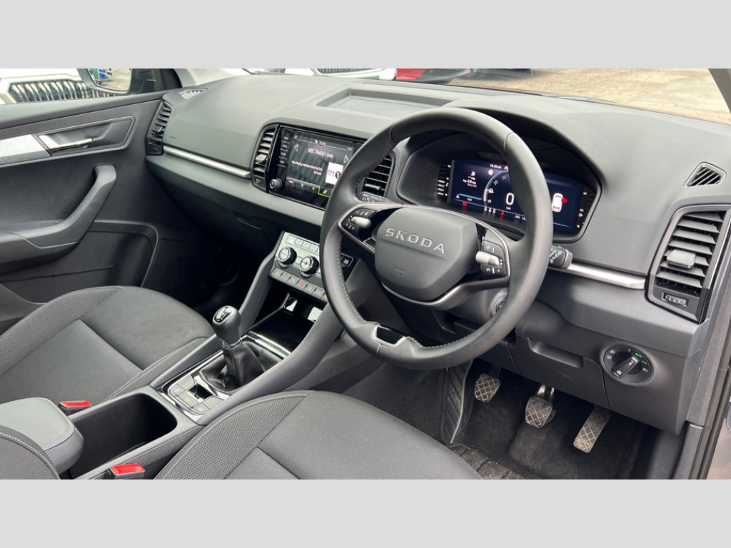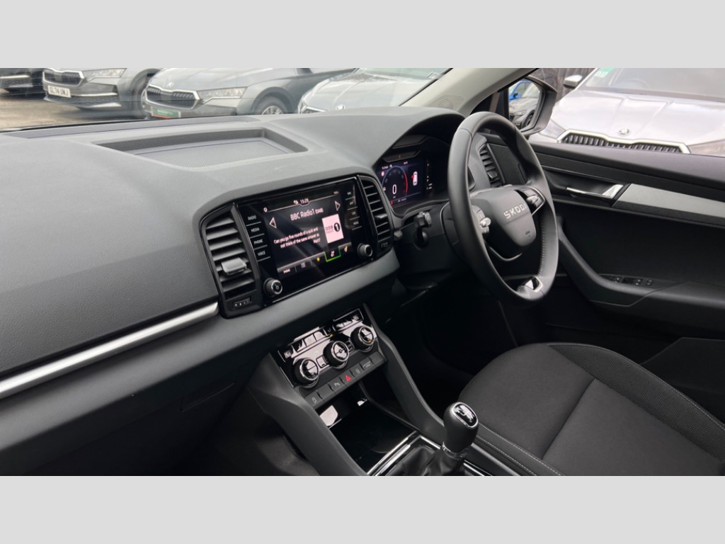 Skoda Karoq 1.0 TSI 116 SE Edition 5dr Advanced driver attention and drowsiness monitor, Amundsen navigation system with 8" touchscreen display and integrated WLAN and web radio, Electro-mechanical PAS, Emergency services call system, Lane assist, Outside temperature gauge, Sensor for driver assistance systems, Service interval indicator, SmartLink wireless for Apple and wired for Android, Start/stop system with regenerative braking, Traffic sign recognition, USB C Port x 2 in front centre console, Virtual Cockpit - 10.25" digital display, Wireless smartphone charging, 8 Speakers, DAB radio with Bluetooth, USB connection, Acoustic glass, Aero front windscreen wipers with intermittent function, Auto dimming rear view mirror with light and rain sensors, Black electric window control buttons, Body colour door mirrors and handles, Electric front and rear windows with child proof lock, Electrically adjustable heated folding and auto dimming door mirrors, Front fog lights, Headlight range control, Heated rear windscreen, LED daytime running lights, LED Headlights, LED rear lights with high functionality welcome effect and dynamic indicators, Light assistant (coming/leaving home/tunnel light), Plastic scuff plates in door apertures, Privacy glass, Rear side wing doors, Rear window wiper with washer system and intermittent control, Safety reflectors on front doors, Third brake light, Unique dark chrome design logo on alloy wheels, 1.5 litre bottle holders in driver and front passenger door panels, 12V socket in boot, 12v socket in front centre armrest with storage compartment and rear air vents, 2 spoke leather heated multifunction steering wheel, 2 x Tablet holder, 3 rear height adjustable headrests, 3 seat bench in 2nd row, 4 foldable roof handles with rear coat hooks, Black floor carpet, Cargo elements in boot, Chrome inner door handles, Driver/front passenger reading lights, Foldable hooks in the boot, Folding tables on the front seat backrests, Front head restraints, Height adjustable driver and passenger seat, Height adjustable front three point seats belts with tensioners, Height/reach adjust steering wheel, Ice scraper, Illuminated glovebox, Illuminated luggage compartment, Interior noise suppression, Isofix child seat preparation for front passenger seat, Isofix child seat preparation outer rear, Loft fabric upholstery, Manual lumbar support for front seats, Pearl grey interior ceiling, Pen holder, Pollen filter, Rear boot cover, Rear package tray, Rear reading lights, Rubbish bin door, Safety vest holder, Single front passenger seat, Skoda lettering on steering wheel, Storage box in upper central dashboard closed, Sunvisors with illuminated vanity mirrors, Textile floor mats, Ticket holder, Umbrella under passenger seat, Under passenger seat storage compartment, Non Smokers pack, Parking pack - Karoq, Winter pack with heated front seats - Karoq, Automatic door unlocking in case of crash, Automatic fuel cut off in case of crash, Driver airbag, Electronic parking brake with auto hold function, Emergency rear braking signal, ESC (incl. ABS+MSR+ASR+EDS+HBA+DSR+RBS+MKB), Front assist, Front side airbags, Head airbags, Hill hold control, Knee airbags, Passenger airbag with switch-off function, Pedestrian monitor, Seatbelt reminder signalisation and pretensioner for all seats, Three point seatbelts rear, Two tone horn, Tyre pressure monitor, Alarm with interior monitoring, back up horn and tilt sensor with safe function, Electronic engine immobiliser, Keyless entry and start/stop, Remote central locking with 2 remote folding keys, Anodized cross door decor, Black centre console, Chrome framed air vents, Satin black dashboard, Satin black door trim, Anti-theft wheel bolts protection, Breakdown and tool kit