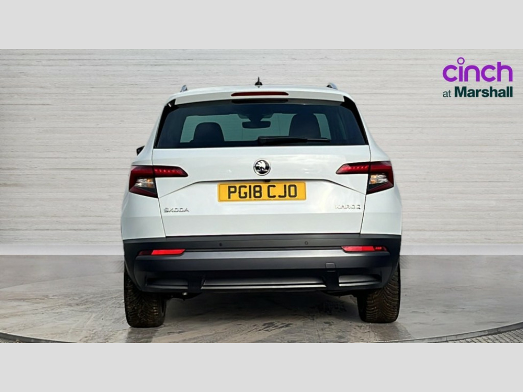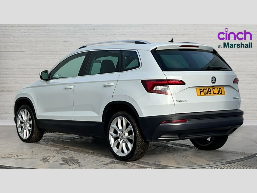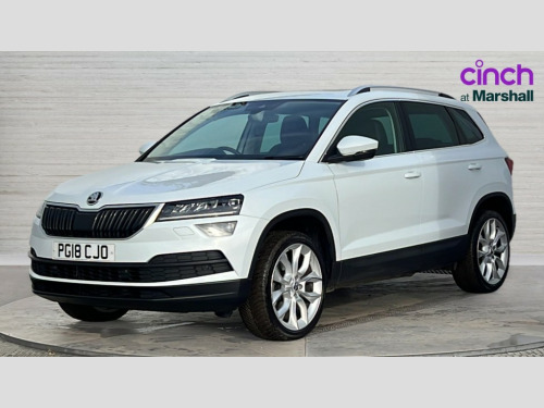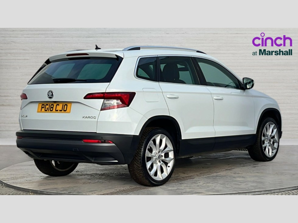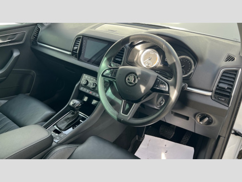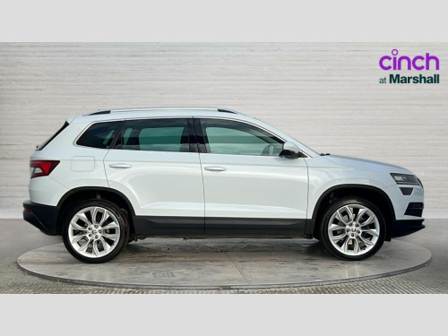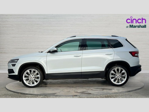 Skoda Karoq 1.5 TSI Edition 5dr DSG Columbus satellite navigation with 9.2" touch screen and integrated Wi-Fi, Drive mode selector, Driver alert system, Driver profile selection, Electro-mechanical PAS, Fatigue detection system, Front and rear parking sensors, Multifunction colour trip computer, Outside temperature gauge, Power boot opening and closing, Rear view camera, Service interval indicator, Speed limiter, Travel assist with traffic sign recognition, Voice control system, Bolero Radio, DAB Digital radio, SD card slot, USB connection, Aero wiper + intermittent function, Aluminium window surround, Automatic headlight control system, Body colour door handles, Body colour door mirrors, Body coloured bumpers, Chrome roof rails, Electric adjustable heated door mirrors with boarding spots and memory function, Electric folding door mirrors, Electric front windows, Electric rear windows with child safety lock, Front doors reflectors, Full LED headlights + adaptive front light system + LED daytime running lights and front cornering fog lights, Headlight washers, Heated rear window, Light assistant (coming home/tunnel light), Panoramic sunroof, Privacy glass, 12V Accessory socket in centre console, 12V power point in luggage area, 3 rear height adjustable headrests, 4 lashing points on luggage floor, 60/40 split fold rear seat back, Bottle holders, Chrome inner door handles, Driver's lumbar support, Dual zone automatic air conditioning with humidity sensor and control, Electrically adjustable front seats + drivers door mirror with memory, Floor mats, Folding tables on the front seat backrests, Front centre armrest with storage compartment, Front seat and rear pockets, Front/rear reading lights, Height adjustable front head restraints, Height/reach adjust steering wheel, Illuminated air conditioned glovebox, Illuminated luggage compartment, Isofix system on outer rear seats, Leather upholstery, Luggage compartment cover, Parcel shelf - retractable, Passenger lumbar support, Passenger side net compartment on centre console, Pollen filter, Removable LED light in boot, Storage box in dash, Storage under front passenger seat, Sunglasses storage, Sunvisors with illuminated vanity mirrors, Umbrella under front passenger seat, Varioflex individually removeable/folding rear seats, LED Interior lighting pack - Karoq, 3 point front/outer rear seatbelts+pre-tensioners, 3x3 point rear seatbelts, ABS, Automatic unlocking of doors in case of impact, Curtain airbags, Driver and passenger airbags, Driver and passenger side airbags, Drivers knee airbag, Electronic parking brake, ESP including MBA, MSR, ASR, EDL, HBA, Front assist including city emergency braking, Fuel supply cut off, Head airbags, Hill hold control, Passenger airbag deactivate switch, Seatbelt warning lamp, Two tone horn, Tyre pressure monitor, Alarm with interior monitoring and tilt sensor, Anti-theft wheel bolts, Electronic immobiliser, Keyless entry and keyless start, Remote central locking, Chrome air vent surrounds, 19" Crater silver alloy wheels