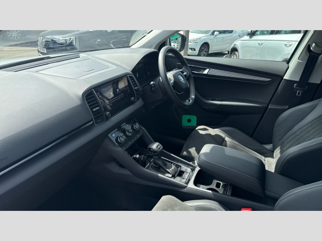 Up to 2 years Servicing, 2 years Warranty, 2 years Roadside Assistance, 2 MOT's and up to £250 deposit contribution for vehicles 13-36 months old at 11.4% APR Representative ** 8" Digital display, Advanced driver attention and drowsiness monitor, Emergency services call system, Outside temperature gauge, Sensor for driver assistance systems, Service interval indicator, SmartLink wireless for Apple and wired for Android, Start/stop system with regenerative braking, USB C Port x 2 in front centre console, Virtual Cockpit - 10.25" digital display, Wireless smartphone charging, DAB radio with Bluetooth, USB connection, Acoustic glass, Aero front windscreen wipers with intermittent function, Auto dimming rear view mirror with light and rain sensors, Black electric window control buttons, Body colour door mirrors and handles, Electric front and rear windows with child proof lock, Heated rear windscreen, LED daytime running lights, LED rear lights with high functionality welcome effect and dynamic indicators, Light assistant (coming/leaving home/tunnel light), Plastic scuff plates in door apertures, Privacy glass, Rear side wing doors, Rear spoiler, Rear window wiper with washer system and intermittent control, Safety reflectors on front doors, Third brake light, 1.5 litre bottle holders in driver and front passenger door panels, 12V socket in boot, 12v socket in front centre armrest with storage compartment and rear air vents, 2 spoke leather heated multifunction steering wheel with DSG paddles, 2 x Tablet holder, 3 rear height adjustable headrests, 3 seat bench in 2nd row, 4 foldable roof handles with rear coat hooks, Black floor carpet, Chrome inner door handles, Foldable hooks in the boot, Front head restraints, Height adjustable front three point seats belts with tensioners, Height/reach adjust steering wheel, Ice scraper, Illuminated glovebox, Illuminated luggage compartment, Interior noise suppression, Isofix child seat preparation for front passenger seat, Isofix child seat preparation outer rear, Manual lumbar support for front seats, Pearl grey interior ceiling, Pen holder, Pollen filter, Rear boot cover, Rear reading lights, Rubbish bin door, Safety vest holder, Single front passenger seat, Storage box in upper central dashboard closed, Sunvisors with illuminated vanity mirrors, Textile floor mats, Ticket holder, Design Pack - Karoq, Non Smokers pack, Parking pack - Karoq, Automatic door unlocking in case of crash, Automatic fuel cut off in case of crash, Driver airbag, Electronic parking brake with auto hold function, Emergency rear braking signal, ESC (incl. ABS+MSR+ASR+EDS+HBA+DSR+RBS+MKB), Front side airbags, Head airbags, Hill hold control, Knee airbags, Passenger airbag with switch-off function, Pedestrian monitor, Seatbelt reminder signalisation and pretensioner for all seats, Three point seatbelts rear, Two tone horn, Tyre pressure monitor, Alarm with interior monitoring, back up horn and tilt sensor with safe function, Electronic engine immobiliser, Keyless entry and start/stop, Remote central locking with 2 remote folding keys, Black centre console, Chrome framed air vents, Satin black dashboard, Anti-theft wheel bolts protection, Breakdown and tool kit