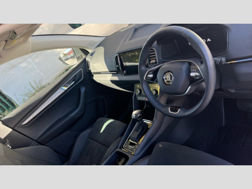 Skoda Karoq 1.5 TSI SE L 5dr DSG 8" Digital display, Advanced driver attention and drowsiness monitor, Emergency services call system, Outside temperature gauge, Sensor for driver assistance systems, Service interval indicator, SmartLink wireless for Apple and wired for Android, Start/stop system with regenerative braking, USB C Port x 2 in front centre console, Virtual Cockpit - 10.25" digital display, Wireless smartphone charging, DAB radio with Bluetooth, USB connection, Acoustic glass, Aero front windscreen wipers with intermittent function, Auto dimming rear view mirror with light and rain sensors, Black electric window control buttons, Body colour door mirrors and handles, Electric front and rear windows with child proof lock, Heated rear windscreen, LED daytime running lights, LED rear lights with high functionality welcome effect and dynamic indicators, Light assistant (coming/leaving home/tunnel light), Plastic scuff plates in door apertures, Privacy glass, Rear side wing doors, Rear spoiler, Rear window wiper with washer system and intermittent control, Safety reflectors on front doors, Third brake light, 1.5 litre bottle holders in driver and front passenger door panels, 12V socket in boot, 12v socket in front centre armrest with storage compartment and rear air vents, 2 spoke leather heated multifunction steering wheel with DSG paddles, 2 x Tablet holder, 3 rear height adjustable headrests, 3 seat bench in 2nd row, 4 foldable roof handles with rear coat hooks, Black floor carpet, Chrome inner door handles, Foldable hooks in the boot, Front head restraints, Height adjustable front three point seats belts with tensioners, Height/reach adjust steering wheel, Ice scraper, Illuminated glovebox, Illuminated luggage compartment, Interior noise suppression, Isofix child seat preparation for front passenger seat, Isofix child seat preparation outer rear, Manual lumbar support for front seats, Pearl grey interior ceiling, Pen holder, Pollen filter, Rear boot cover, Rear reading lights, Rubbish bin door, Safety vest holder, Single front passenger seat, Storage box in upper central dashboard closed, Sunvisors with illuminated vanity mirrors, Textile floor mats, Ticket holder, Design Pack - Karoq, Non Smokers pack, Parking pack - Karoq, Automatic door unlocking in case of crash, Automatic fuel cut off in case of crash, Driver airbag, Electronic parking brake with auto hold function, Emergency rear braking signal, ESC (incl. ABS+MSR+ASR+EDS+HBA+DSR+RBS+MKB), Front side airbags, Head airbags, Hill hold control, Knee airbags, Passenger airbag with switch-off function, Pedestrian monitor, Seatbelt reminder signalisation and pretensioner for all seats, Three point seatbelts rear, Two tone horn, Tyre pressure monitor, Alarm with interior monitoring, back up horn and tilt sensor with safe function, Electronic engine immobiliser, Keyless entry and start/stop, Remote central locking with 2 remote folding keys, Black centre console, Chrome framed air vents, Satin black dashboard, Anti-theft wheel bolts protection, Breakdown and tool kit