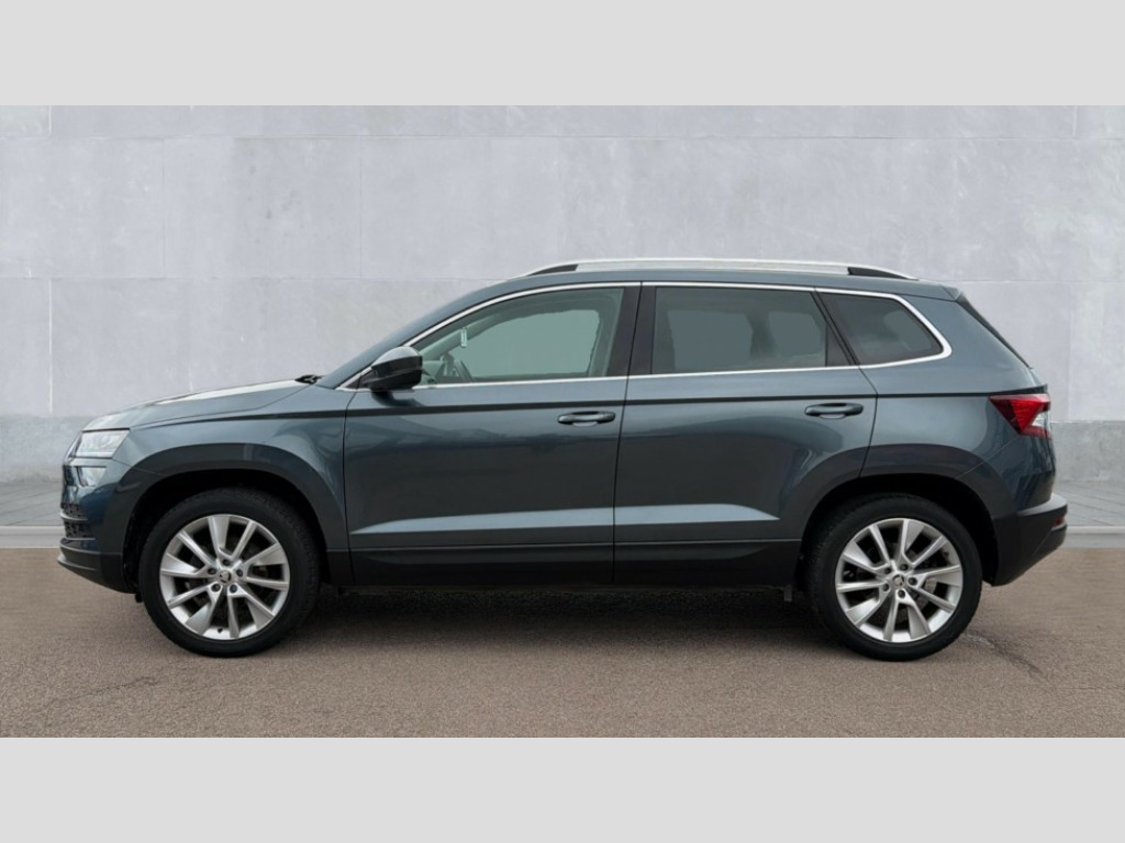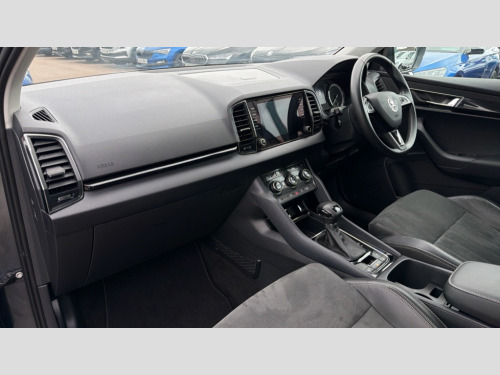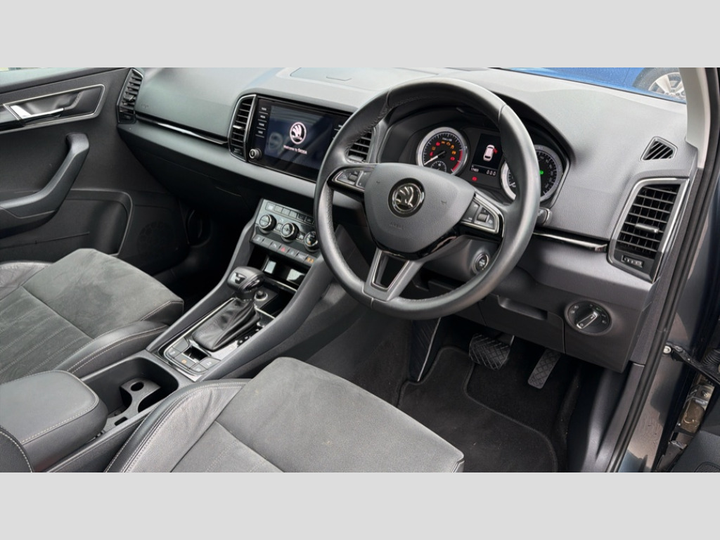 Skoda Karoq 1.5 TSI SE L 5dr DSG Drive mode selector, Driver alert system, Driver fatigue sensor, Driver profile selection, Multifunction colour trip computer, Outside temperature gauge, Rear view camera, Service interval indicator, Start/stop system with regenerative braking, DAB radio with Bluetooth, SD card slot, USB connection, Acoustic glass, Aero front windscreen wipers with intermittent function, Automatic headlight control system, Black electric window control buttons, Body colour door mirrors and handles, Body coloured bumpers, Electric front and rear windows with child proof lock, Full LED headlights + adaptive front light system + LED daytime running lights and front cornering fog lights, Headlight washers, Heated rear windscreen, LED rear lights with high functionality, Light assistant (coming/leaving home/tunnel light), Privacy glass, Safety reflectors on front doors, Third brake light, 1.5 litre bottle holders in driver and front passenger door panels, 12V socket in boot, 12v socket in front centre armrest with storage compartment and rear air vents, 2 Folding hooks and nets in boot, 2 Front readings lights for driver and passenger, 3 rear height adjustable headrests, 4 foldable roof handles with rear coat hooks, 4 lashing points on luggage floor, Backrest release, Cargo elements in boot, Chrome inner door handles, Dual zone climate control, Folding tables on the front seat backrests, Front seat and rear pockets, Height adjustable front three point seats belts with tensioners, Height adjustable passenger seat, Height/reach adjust steering wheel, Ice scraper, Illuminated and cooled glovebox, Illuminated luggage compartment, Isofix child seat preparation outer rear, Net programme in boot, Pen holder, Pollen filter, Rear boot cover, Rear reading lights, Rear seats fixed folding and divided 60:40, Removable LED torch in the boot, Retractable parcel shelf attachable to tailgate, Safety vest holder, Storage box in upper central dashboard closed, Storage compartment below the passenger seat, Sunvisors with illuminated vanity mirrors, Textile floor mats, Umbrella under passenger seat, VarioFlex seats with retractable parcel shelf, Chrome roof rails + chrome pack - Kodiaq, Airbags - Front side, head, knee and curtain, Automatic door unlocking in case of crash, Automatic fuel cut off in case of crash, Driver airbag, Electronic parking brake with auto hold function, Emergency rear braking signal, ESC including ABS, MSR, ASR, EDS, HBA, DSR, RBS, MKB and traction control, Front assist radar scanning of the space in front of the car with automatic braking, Hill hold control, Passenger airbag with switch-off function, Pedestrian monitor, Seatbelt reminder signalisation and pretensioner for all seats, Three point seatbelts rear, Two tone horn, Tyre pressure display, Tyre pressure monitor, Alarm with interior monitoring, back up horn and tilt sensor with safe function, Electronic engine immobiliser, Keyless entry and keyless start with safe system, Remote central locking with 2 remote folding keys, Chrome framed air vents, Storage on wheel cover