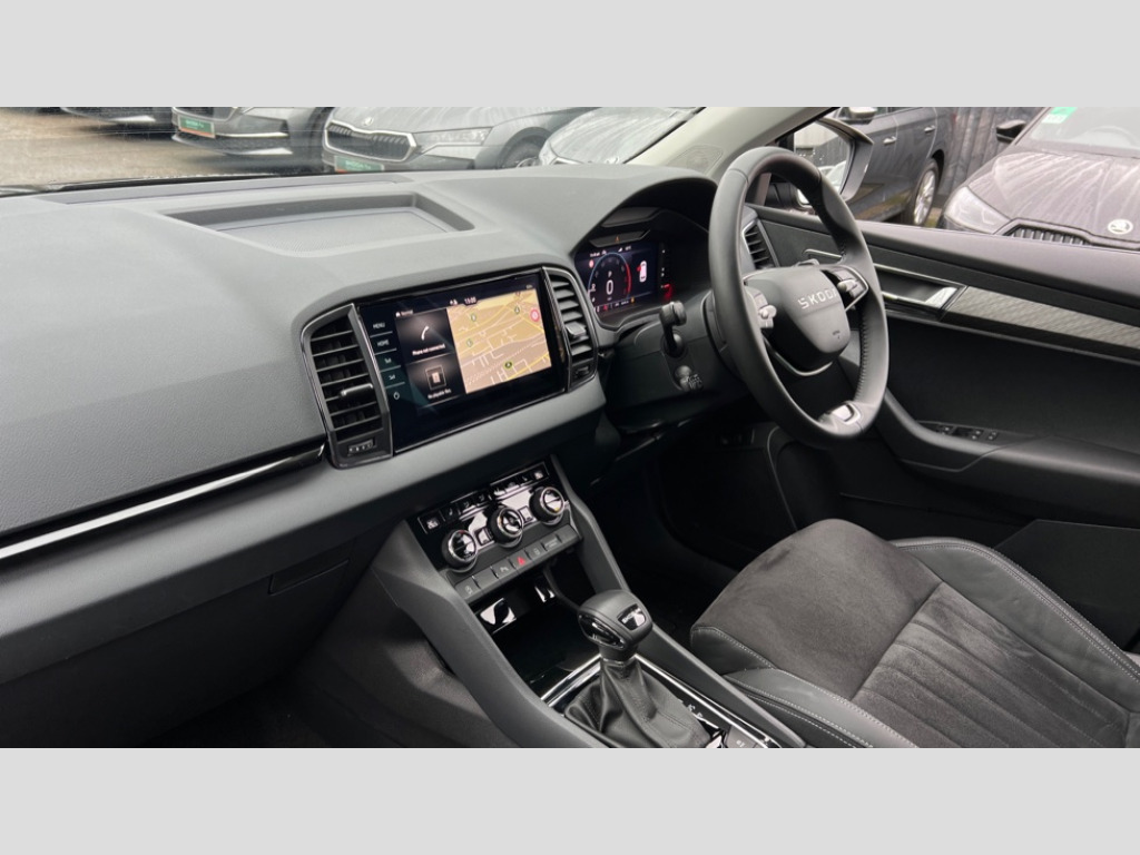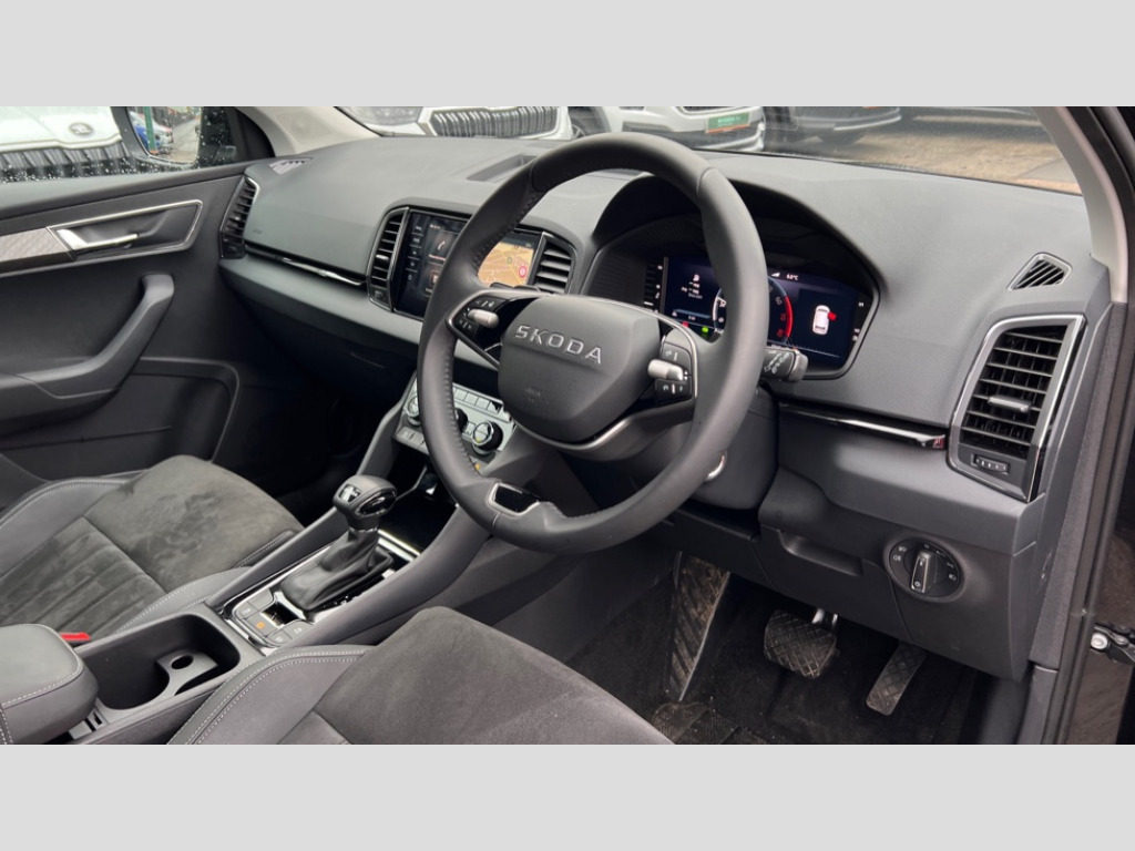 Skoda Karoq 1.5 TSI SE L Edition 5dr DSG Advanced driver attention and drowsiness monitor, Drive Mode Selection including ECO function, Electro-mechanical PAS, Emergency services call system, Outside temperature gauge, Sensor for driver assistance systems, Service interval indicator, SmartLink wireless for Apple and wired for Android, Start/stop system with regenerative braking, Traffic sign recognition, USB C Port x 2 in front centre console, Virtual Cockpit - 10.25" digital display, Virtual pedal with electrically operated boot door, Wireless smartphone charging, DAB radio with Bluetooth, USB connection, Acoustic glass, Aero front windscreen wipers with intermittent function, Auto dimming rear view mirror with light and rain sensors, Black electric window control buttons, Body colour door mirrors and handles, Electric front and rear windows with child proof lock, Extended rear roof spoiler, Heated rear windscreen, LED daytime running lights, LED rear lights with high functionality welcome effect and dynamic indicators, Light assistant (coming/leaving home/tunnel light), Plastic scuff plates in door apertures, Privacy glass, Rear side wing doors, Rear window wiper with washer system and intermittent control, Safety reflectors on front doors, Third brake light, Unique dark chrome design logo on alloy wheels, 1.5 litre bottle holders in driver and front passenger door panels, 12V socket in boot, 12v socket in front centre armrest with storage compartment and rear air vents, 2 spoke leather heated multifunction steering wheel with DSG paddles, 2 x Tablet holder, 3 rear height adjustable headrests, 3 seat bench in 2nd row, 4 foldable roof handles with rear coat hooks, Black floor carpet, Cargo elements in boot, Chrome inner door handles, Foldable hooks in the boot, Front head restraints, Height adjustable front three point seats belts with tensioners, Height/reach adjust steering wheel, Ice scraper, Illuminated glovebox, Illuminated luggage compartment, Interior noise suppression, Isofix child seat preparation for front passenger seat, Isofix child seat preparation outer rear, Manual lumbar support for front seats, Pearl grey interior ceiling, Pen holder, Pollen filter, Rear boot cover, Rear package tray, Rear reading lights, Rubbish bin door, Safety vest holder, Single front passenger seat, Skoda lettering on steering wheel, Storage box in upper central dashboard closed, Sunvisors with illuminated vanity mirrors, Textile floor mats, Ticket holder, Columbus pack - Karoq, Design Pack - Karoq, Non Smokers pack, Parking pack - Karoq, Automatic door unlocking in case of crash, Automatic fuel cut off in case of crash, Driver airbag, Electronic parking brake with auto hold function, Emergency rear braking signal, ESC (incl. ABS+MSR+ASR+EDS+HBA+DSR+RBS+MKB), Front side airbags, Head airbags, Hill hold control, Knee airbags, Passenger airbag with switch-off function, Pedestrian monitor, Seatbelt reminder signalisation and pretensioner for all seats, Three point seatbelts rear, Two tone horn, Tyre pressure monitor, Alarm with interior monitoring, back up horn and tilt sensor with safe function, Electronic engine immobiliser, Keyless entry and start/stop, Remote central locking with 2 remote folding keys, Black centre console, Chrome framed air vents, Satin black dashboard, Anti-theft wheel bolts protection, Breakdown and tool kit