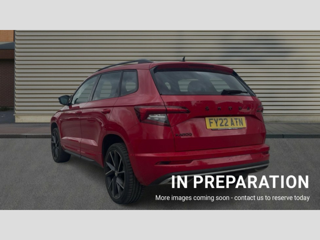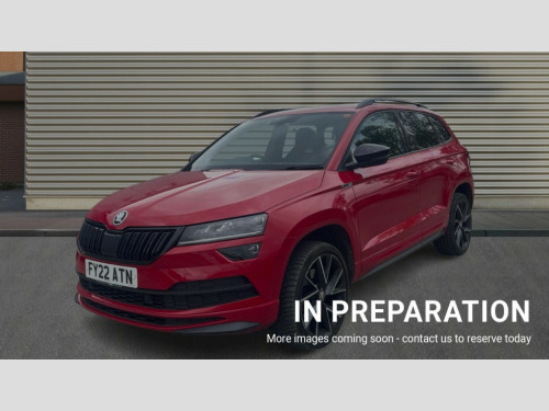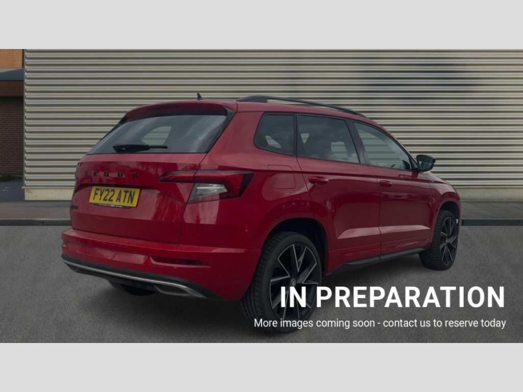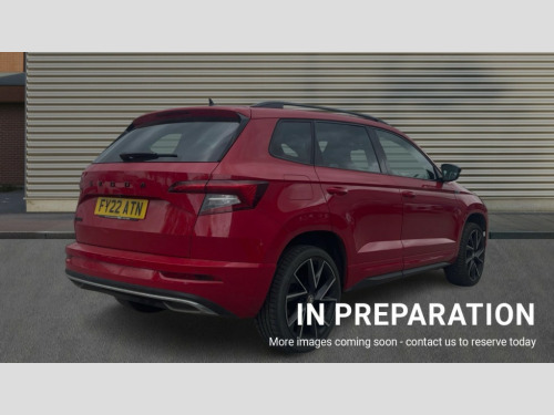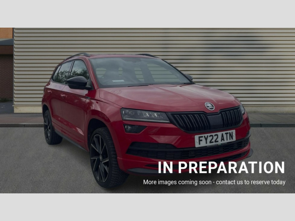 Skoda Karoq 1.5 TSI Sport Line 5dr DSG Care connect, Drive mode selector, Driver fatigue sensor, Multifunction colour trip computer, Outside temperature gauge, Service interval indicator, SmartLink wireless for Apple and wired for Android, Start/stop system with regenerative braking, USB C Port x 2 in front centre console, DAB radio with Bluetooth, USB connection, Wireless charging without wireless aerial connection, Acoustic glass, Aero front windscreen wipers with intermittent function, Automatic headlight control system, Black door mirrors, Black electric window control buttons, Black radiator grille, Black roof rails, Body colour door handles, Body coloured bumpers, Electric front and rear windows with child proof lock, Front door steps with SportLine logo, Full LED headlights + adaptive front light system + LED daytime running lights and front cornering fog lights, Headlight washers, Heated rear windscreen, LED rear lights with high functionality, Light assistant (coming/leaving home/tunnel light), Panoramic sliding sunroof, Privacy glass, Protective door side sills in body colour, Rear diffuser, Safety reflectors on front doors, Skoda lettering on tailgate in black, Sportline badge on front fender, Sportline decorative inserts with badging, Sports front and rear bumpers, Third brake light, 1.5 litre bottle holders in driver and front passenger door panels, 12V socket in boot, 12v socket in front centre armrest with storage compartment and rear air vents, 2 Folding hooks and nets in boot, 2 Front readings lights for driver and passenger, 3 rear height adjustable headrests, 4 foldable roof handles with rear coat hooks, Aluminium pedals, Black roof headlining, Cargo elements in boot, Chrome inner door handles, Door sill scuff plates, Driver and passenger seats height adjust, Front head restraints, Height adjustable front three point seats belts with tensioners, Height/reach adjust steering wheel, Ice scraper, Illuminated and cooled glovebox, Illuminated luggage compartment, Isofix child seat preparation outer rear, Manual lumbar support for front seats, Net programme in boot, Pen holder, Pollen filter, Rear reading lights, Rear seats fixed folding and divided 60:40, Retractable parcel shelf attachable to tailgate, Safety vest holder, Solid rear boot cover, Storage box in upper central dashboard closed, Storage compartment below the passenger seat, Sunvisors with illuminated vanity mirrors, Textile floor mats, Umbrella under passenger seat, Welcome animation with sportline logo, LED Interior lighting pack with Skoda welcome logo - Karoq, Airbags - Front side, head, knee and curtain, Automatic door unlocking in case of crash, Automatic fuel cut off in case of crash, Driver airbag, Electronic parking brake with auto hold function, Emergency rear braking signal, ESC including ABS, MSR, ASR, EDS, HBA, DSR, RBS, MKB and traction control, Front assist radar scanning of the space in front of the car with automatic braking, Hill hold control, Passenger airbag with switch-off function, Pedestrian monitor, Seatbelt reminder signalisation and pretensioner for all seats, Three point seatbelts rear, Two tone horn, Tyre pressure display, Tyre pressure monitor, Alarm with interior monitoring, back up horn and tilt sensor with safe function, Electronic engine immobiliser, Keyless entry and keyless start with safe system, Remote central locking with 2 remote folding keys, Black air vent surround, 19" Vega anthracite alloy wheels, Anti-theft wheel bolts protection, Storage on wheel cover
