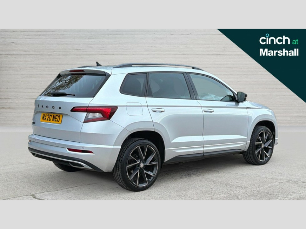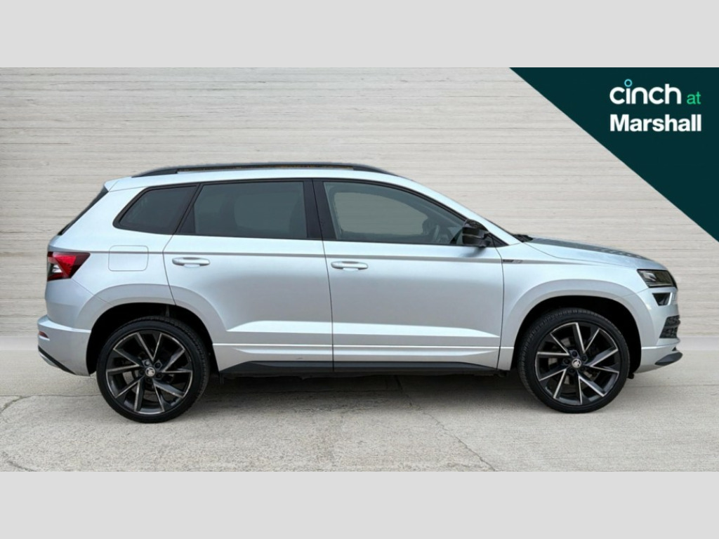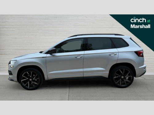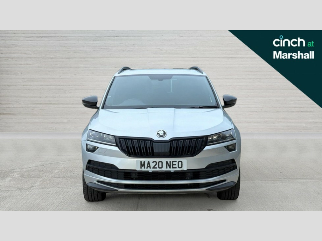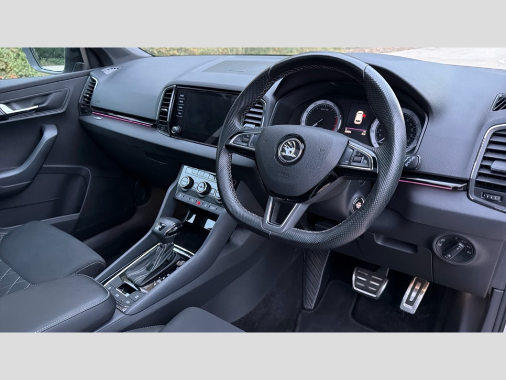 Skoda Karoq 1.5 TSI Sport Line 5dr DSG Drive mode selector, Driver alert system, Driver fatigue sensor, Driver profile selection, Multifunction colour trip computer, Outside temperature gauge, Rear view camera, Service interval indicator, Start/stop system with regenerative braking, DAB radio with Bluetooth, SD card slot, USB connection, Acoustic glass, Aero front windscreen wipers with intermittent function, Automatic headlight control system, Black electric window control buttons, Black roof rails and door mirrors with radiator grille, Body colour door handles, Electric front and rear windows with child proof lock, Front door steps with SportLine logo, Full LED headlights + adaptive front light system + LED daytime running lights and front cornering fog lights, Headlight washers, Heated rear windscreen, LED rear lights with high functionality, Light assistant (coming/leaving home/tunnel light), Panoramic sliding sunroof, Privacy glass, Protective door side sills in body colour, Rear diffuser, Safety reflectors on front doors, Skoda lettering on tailgate in black, Sportline badge on front fender, Sportline decorative inserts with badging, Sports front and rear bumpers, Third brake light, 1.5 litre bottle holders in driver and front passenger door panels, 12V socket in boot, 12v socket in front centre armrest with storage compartment and rear air vents, 2 Folding hooks and nets in boot, 2 Front readings lights for driver and passenger, 3 rear height adjustable headrests, 3 spoke sports leather multi-function steering wheel with silver stitching + paddle shift, 4 foldable roof handles with rear coat hooks, 4 lashing points on luggage floor, Aluminium pedals, Backrest release, Black roof headlining, Cargo elements in boot, Chrome inner door handles, Driver and passenger seats height adjust, Dual zone climate control, Front head restraints, Front seat and rear pockets, Height adjustable front three point seats belts with tensioners, Height/reach adjust steering wheel, Ice scraper, Illuminated and cooled glovebox, Illuminated luggage compartment, Isofix child seat preparation outer rear, Manual lumbar support for front seats, Net programme in boot, Pen holder, Pollen filter, Rear boot cover, Rear reading lights, Rear seats fixed folding and divided 60:40, Retractable parcel shelf attachable to tailgate, Safety vest holder, Storage box in upper central dashboard closed, Storage compartment below the passenger seat, Sunvisors with illuminated vanity mirrors, Textile floor mats, Umbrella under passenger seat, Welcome animation with sportline logo, LED Interior lighting pack with Skoda welcome logo - Karoq, Airbags - Front side, head, knee and curtain, Automatic door unlocking in case of crash, Automatic fuel cut off in case of crash, Driver airbag, Electronic parking brake with auto hold function, Emergency rear braking signal, ESC including ABS, MSR, ASR, EDS, HBA, DSR, RBS, MKB and traction control, Front assist radar scanning of the space in front of the car with automatic braking, Hill hold control, Passenger airbag with switch-off function, Pedestrian monitor, Seatbelt reminder signalisation and pretensioner for all seats, Three point seatbelts rear, Two tone horn, Tyre pressure display, Tyre pressure monitor, Alarm with interior monitoring, back up horn and tilt sensor with safe function, Electronic engine immobiliser, Keyless entry and keyless start with safe system, Remote central locking with 2 remote folding keys, Black air vent surround, 19" Vega anthracite alloy wheels, Anti-theft wheel bolts protection, Storage on wheel cover