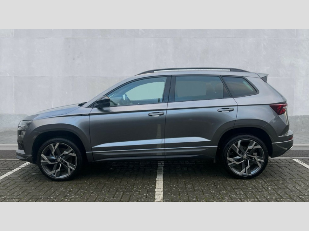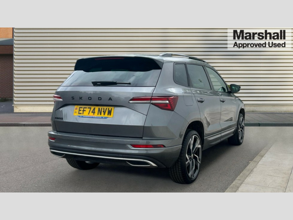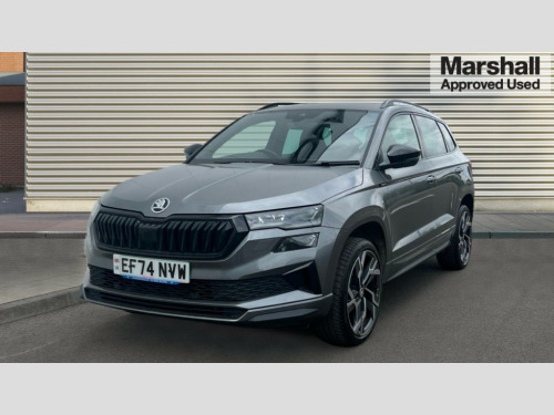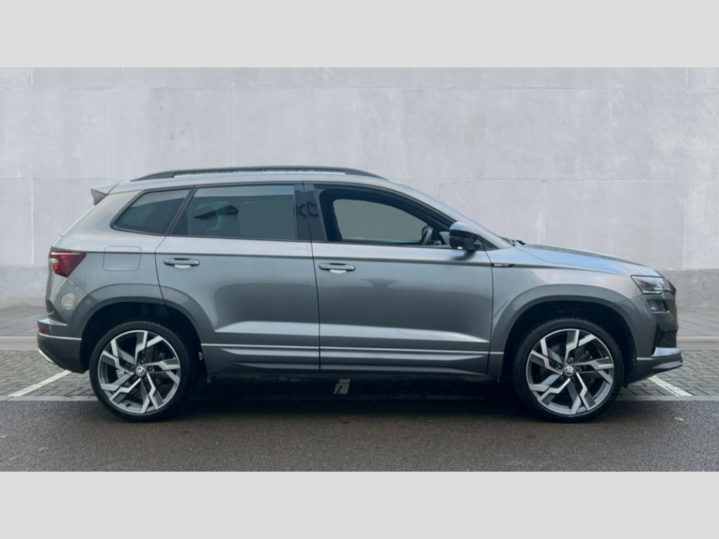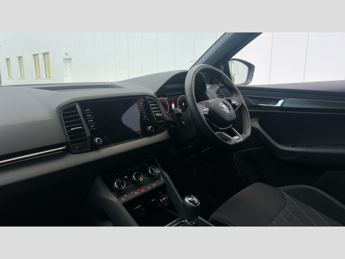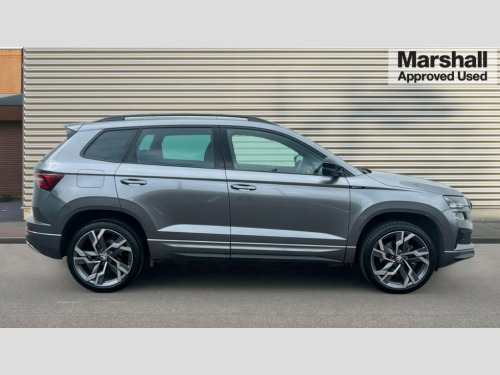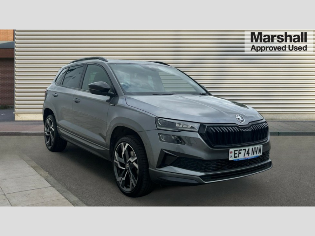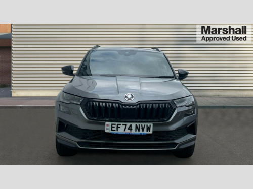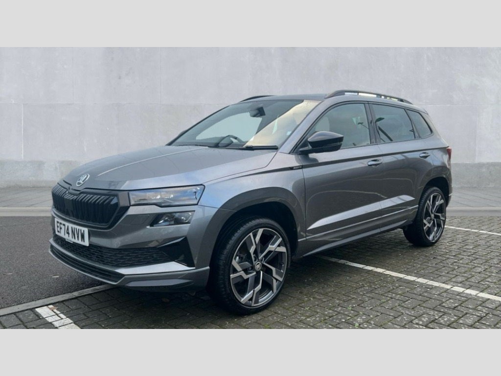 Skoda Karoq 1.5 TSI Sportline 5dr 8" Digital display, Advanced driver attention and drowsiness monitor, Emergency services call system, Outside temperature gauge, Sensor for driver assistance systems, Service interval indicator, SmartLink wireless for Apple and wired for Android, Start/stop system with regenerative braking, USB C Port x 2 in front centre console, Virtual Cockpit - 10.25" digital display, Virtual pedal with electrically operated boot door, Wireless smartphone charging, DAB radio with Bluetooth, USB connection, Acoustic glass, Aero front windscreen wipers with intermittent function, Auto dimming rear view mirror with light and rain sensors, Black door mirrors, Black electric window control buttons, Black radiator grille, Black roof rails, Body colour door handles, Electric front and rear windows with child proof lock, Front door steps with SportLine logo, Heated rear windscreen, LED daytime running lights, LED rear lights with high functionality welcome effect and dynamic indicators, Light assistant (coming/leaving home/tunnel light), Panoramic sliding sunroof, Plastic scuff plates in door apertures, Privacy glass, Protective door side sills in body colour, Rear diffuser, Rear side wing doors, Rear spoiler, Rear window wiper with washer system and intermittent control, Safety reflectors on front doors, Skoda lettering on tailgate in black, Sportline badge on front fender, Sportline decorative inserts with badging, Sports front and rear bumpers, Third brake light, 1.5 litre bottle holders in driver and front passenger door panels, 12V socket in boot, 12v socket in front centre armrest with storage compartment and rear air vents, 2 x Tablet holder, 3 rear height adjustable headrests, 3 seat bench in 2nd row, 3 spoke sports leather heated multifunction steering wheel, 4 foldable roof handles with rear coat hooks, Black floor carpet, Black roof headlining, Chrome inner door handles, Foldable hooks in the boot, Front head restraints, Height adjustable front three point seats belts with tensioners, Height/reach adjust steering wheel, Ice scraper, Illuminated glovebox, Illuminated luggage compartment, Isofix child seat preparation for front passenger seat, Isofix child seat preparation outer rear, Manual lumbar support for front seats, Pen holder, Pollen filter, Rear boot cover, Rear reading lights, Rear seats fixed folding and divided 60:40, Rubbish bin door, Safety vest holder, Single front passenger seat, Storage box in upper central dashboard closed, Sunvisors with illuminated vanity mirrors, Textile floor mats, Ticket holder, Titan black interior ceiling, Umbrella under passenger seat, Under passenger seat storage compartment, LED Interior lighting pack with Skoda welcome logo - Karoq, Light Pack - Karoq, Non Smokers pack, Automatic door unlocking in case of crash, Automatic fuel cut off in case of crash, Driver airbag, Electronic parking brake with auto hold function, Emergency rear braking signal, ESC (incl. ABS+MSR+ASR+EDS+HBA+DSR+RBS+MKB), Front side airbags, Head airbags, Hill hold control, Knee airbags, Passenger airbag with switch-off function, Pedestrian monitor, Seatbelt reminder signalisation and pretensioner for all seats, Three point seatbelts rear, Two tone horn, Tyre pressure monitor, Alarm with interior monitoring, back up horn and tilt sensor with safe function, Electronic engine immobiliser, Keyless entry and start/stop, Remote central locking with 2 remote folding keys, Black air vent surround, Black centre console, carbon door decor, Satin black dashboard, Satin black door trim, 19" Sagittarius anthracite alloy wheels, Anti-theft wheel bolts protection, Breakdown and tool kit