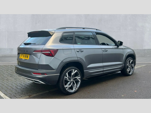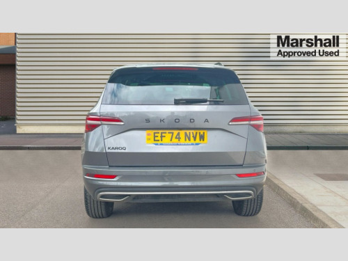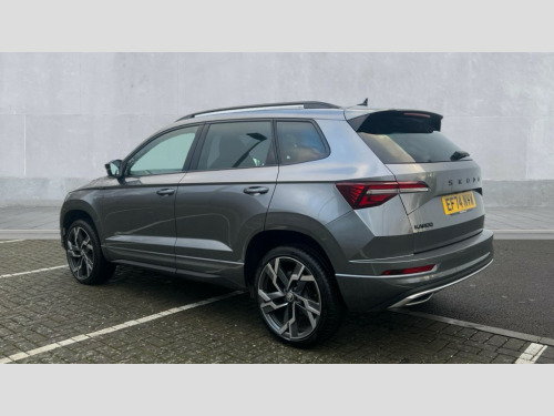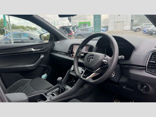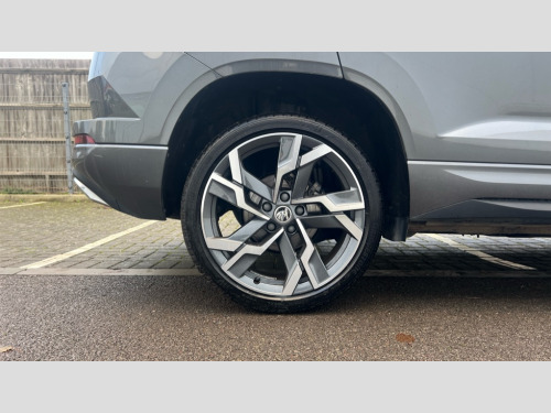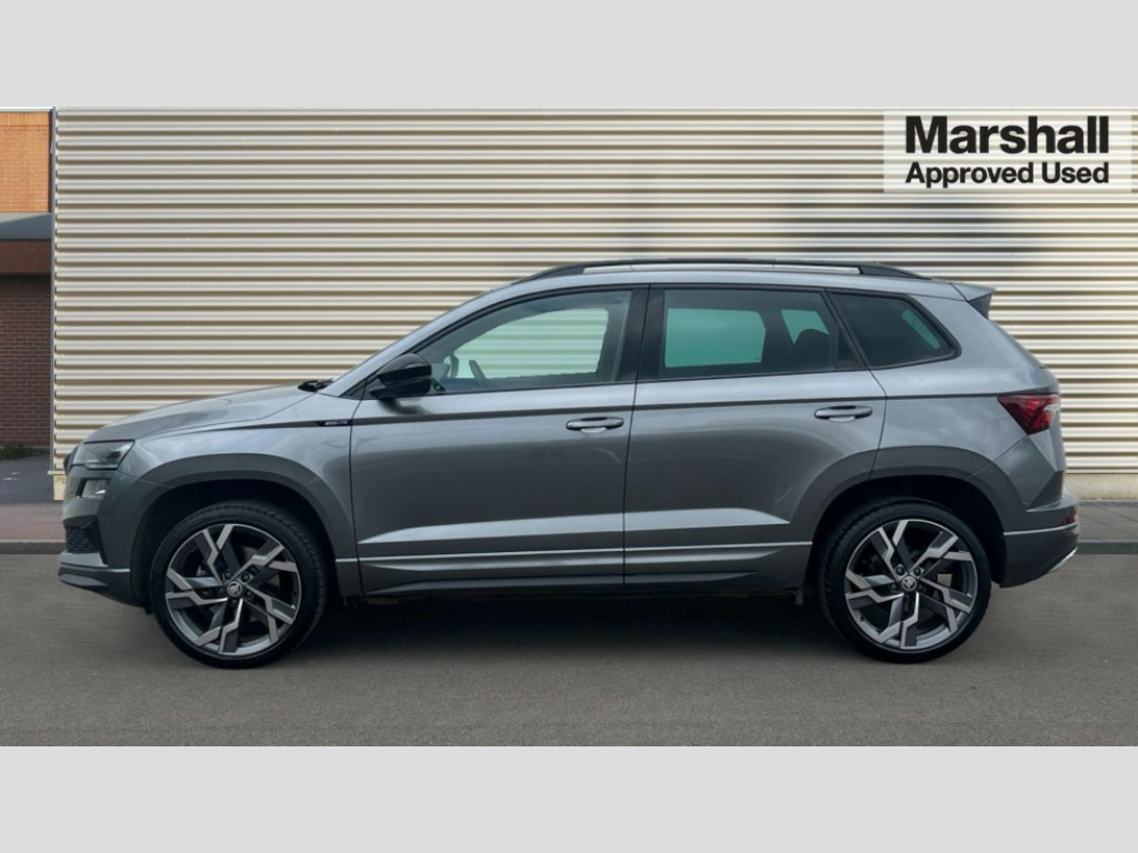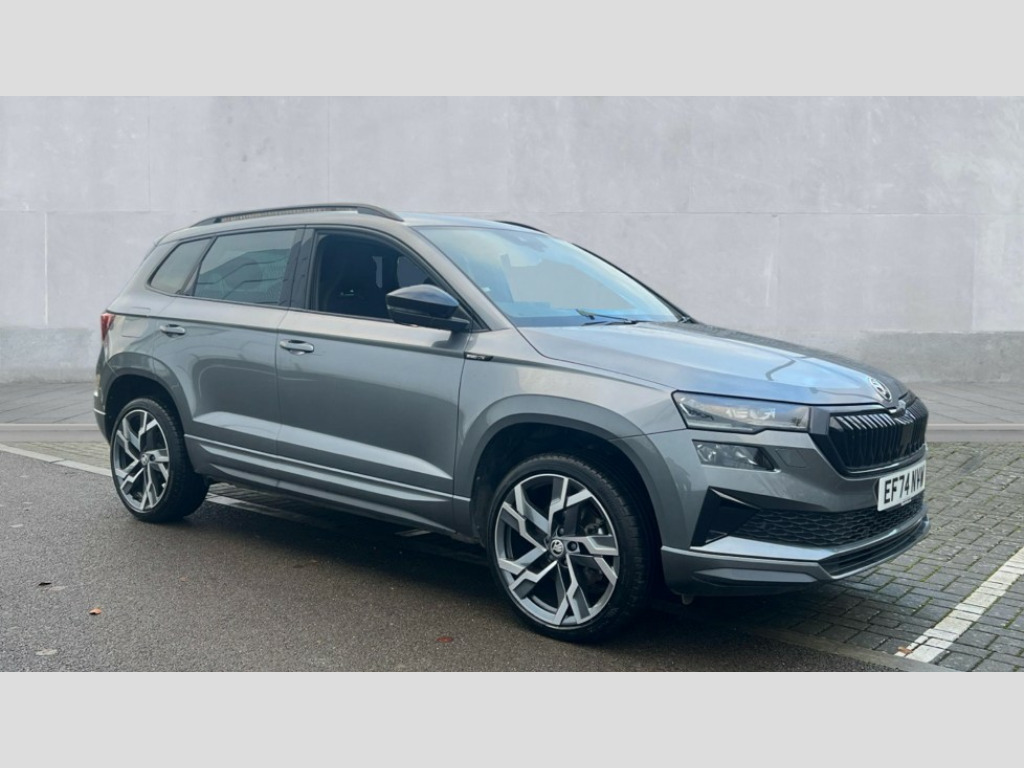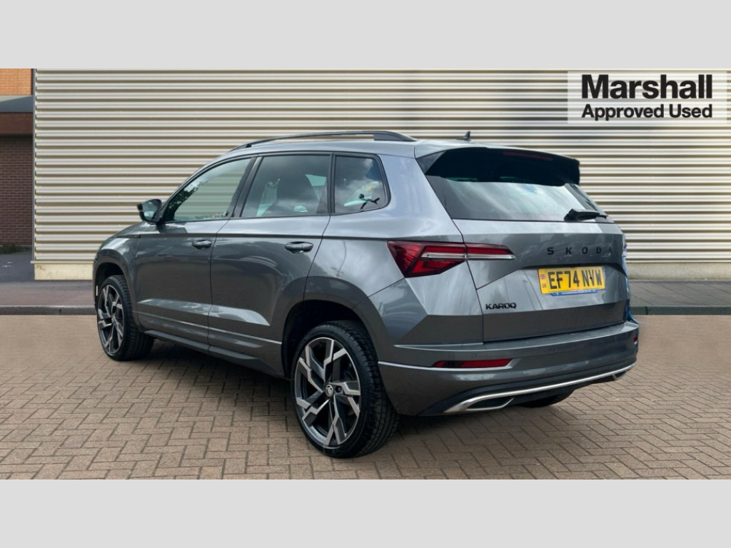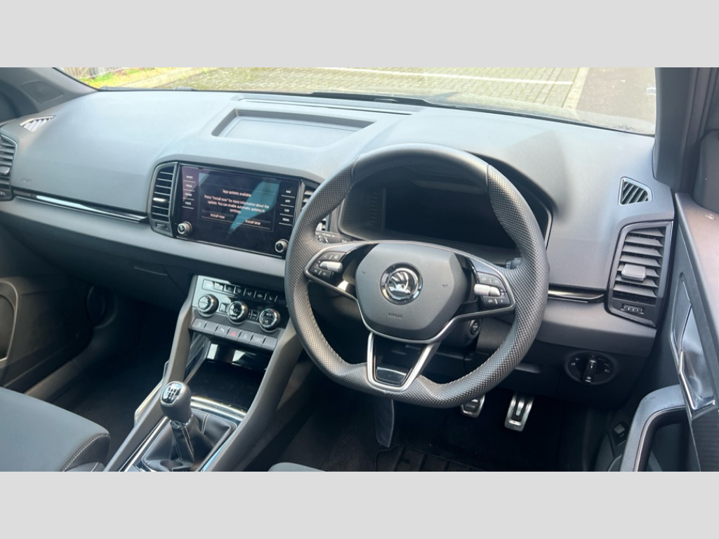 Skoda Karoq 1.5 TSI Sportline 5dr 8" Digital display, Advanced driver attention and drowsiness monitor, Emergency services call system, Outside temperature gauge, Sensor for driver assistance systems, Service interval indicator, SmartLink wireless for Apple and wired for Android, Start/stop system with regenerative braking, USB C Port x 2 in front centre console, Virtual Cockpit - 10.25" digital display, Virtual pedal with electrically operated boot door, Wireless smartphone charging, DAB radio with Bluetooth, USB connection, Acoustic glass, Aero front windscreen wipers with intermittent function, Auto dimming rear view mirror with light and rain sensors, Black door mirrors, Black electric window control buttons, Black radiator grille, Black roof rails, Body colour door handles, Electric front and rear windows with child proof lock, Front door steps with SportLine logo, Heated rear windscreen, LED daytime running lights, LED rear lights with high functionality welcome effect and dynamic indicators, Light assistant (coming/leaving home/tunnel light), Panoramic sliding sunroof, Plastic scuff plates in door apertures, Privacy glass, Protective door side sills in body colour, Rear diffuser, Rear side wing doors, Rear spoiler, Rear window wiper with washer system and intermittent control, Safety reflectors on front doors, Skoda lettering on tailgate in black, Sportline badge on front fender, Sportline decorative inserts with badging, Sports front and rear bumpers, Third brake light, 1.5 litre bottle holders in driver and front passenger door panels, 12V socket in boot, 12v socket in front centre armrest with storage compartment and rear air vents, 2 x Tablet holder, 3 rear height adjustable headrests, 3 seat bench in 2nd row, 3 spoke sports leather heated multifunction steering wheel, 4 foldable roof handles with rear coat hooks, Black floor carpet, Black roof headlining, Chrome inner door handles, Foldable hooks in the boot, Front head restraints, Height adjustable front three point seats belts with tensioners, Height/reach adjust steering wheel, Ice scraper, Illuminated glovebox, Illuminated luggage compartment, Isofix child seat preparation for front passenger seat, Isofix child seat preparation outer rear, Manual lumbar support for front seats, Pen holder, Pollen filter, Rear boot cover, Rear reading lights, Rear seats fixed folding and divided 60:40, Rubbish bin door, Safety vest holder, Single front passenger seat, Storage box in upper central dashboard closed, Sunvisors with illuminated vanity mirrors, Textile floor mats, Ticket holder, Titan black interior ceiling, Umbrella under passenger seat, Under passenger seat storage compartment, LED Interior lighting pack with Skoda welcome logo - Karoq, Light Pack - Karoq, Non Smokers pack, Automatic door unlocking in case of crash, Automatic fuel cut off in case of crash, Driver airbag, Electronic parking brake with auto hold function, Emergency rear braking signal, ESC (incl. ABS+MSR+ASR+EDS+HBA+DSR+RBS+MKB), Front side airbags, Head airbags, Hill hold control, Knee airbags, Passenger airbag with switch-off function, Pedestrian monitor, Seatbelt reminder signalisation and pretensioner for all seats, Three point seatbelts rear, Two tone horn, Tyre pressure monitor, Alarm with interior monitoring, back up horn and tilt sensor with safe function, Electronic engine immobiliser, Keyless entry and start/stop, Remote central locking with 2 remote folding keys, Black air vent surround, Black centre console, carbon door decor, Satin black dashboard, Satin black door trim, 19" Sagittarius anthracite alloy wheels, Anti-theft wheel bolts protection, Breakdown and tool kit