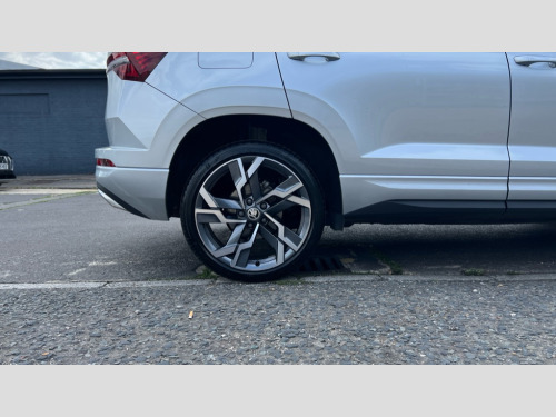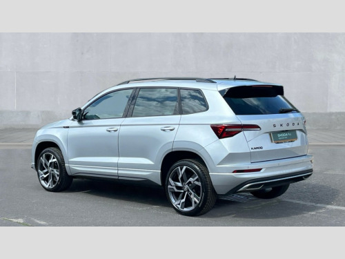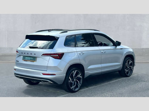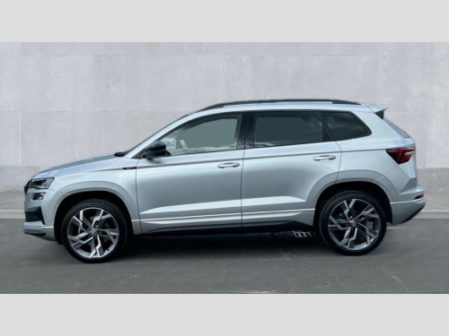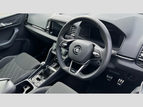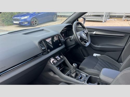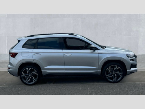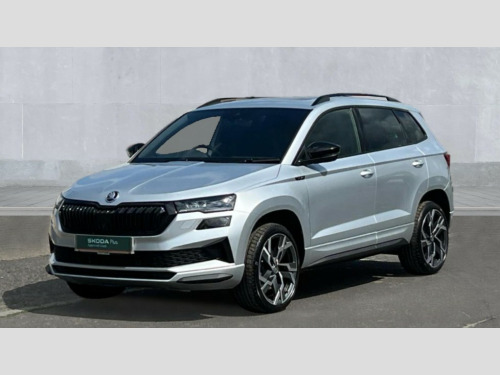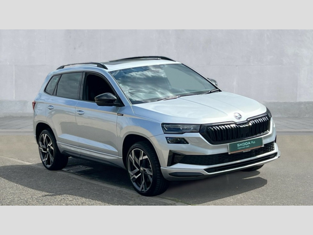 Skoda Karoq 1.5 TSI Sportline 5dr 8" Digital display, Advanced driver attention and drowsiness monitor, Emergency services call system, Outside temperature gauge, Sensor for driver assistance systems, Service interval indicator, SmartLink wireless for Apple and wired for Android, Start/stop system with regenerative braking, USB C Port x 2 in front centre console, Virtual Cockpit - 10.25" digital display, Virtual pedal with electrically operated boot door, Wireless smartphone charging, DAB radio with Bluetooth, USB connection, Acoustic glass, Aero front windscreen wipers with intermittent function, Auto dimming rear view mirror with light and rain sensors, Black door mirrors, Black electric window control buttons, Black radiator grille, Black roof rails, Body colour door handles, Electric front and rear windows with child proof lock, Front door steps with SportLine logo, Heated rear windscreen, LED daytime running lights, LED rear lights with high functionality welcome effect and dynamic indicators, Light assistant (coming/leaving home/tunnel light), Panoramic sliding sunroof, Plastic scuff plates in door apertures, Privacy glass, Protective door side sills in body colour, Rear diffuser, Rear side wing doors, Rear spoiler, Rear window wiper with washer system and intermittent control, Safety reflectors on front doors, Skoda lettering on tailgate in black, Sportline badge on front fender, Sportline decorative inserts with badging, Sports front and rear bumpers, Third brake light, 1.5 litre bottle holders in driver and front passenger door panels, 12V socket in boot, 12v socket in front centre armrest with storage compartment and rear air vents, 2 x Tablet holder, 3 rear height adjustable headrests, 3 seat bench in 2nd row, 3 spoke sports leather heated multifunction steering wheel, 4 foldable roof handles with rear coat hooks, Black floor carpet, Black roof headlining, Chrome inner door handles, Foldable hooks in the boot, Front head restraints, Height adjustable front three point seats belts with tensioners, Height/reach adjust steering wheel, Ice scraper, Illuminated glovebox, Illuminated luggage compartment, Isofix child seat preparation for front passenger seat, Isofix child seat preparation outer rear, Manual lumbar support for front seats, Pen holder, Pollen filter, Rear boot cover, Rear reading lights, Rear seats fixed folding and divided 60:40, Rubbish bin door, Safety vest holder, Single front passenger seat, Storage box in upper central dashboard closed, Sunvisors with illuminated vanity mirrors, Textile floor mats, Ticket holder, Titan black interior ceiling, Umbrella under passenger seat, Under passenger seat storage compartment, LED Interior lighting pack with Skoda welcome logo - Karoq, Light Pack - Karoq, Non Smokers pack, Automatic door unlocking in case of crash, Automatic fuel cut off in case of crash, Driver airbag, Electronic parking brake with auto hold function, Emergency rear braking signal, ESC (incl. ABS+MSR+ASR+EDS+HBA+DSR+RBS+MKB), Front side airbags, Head airbags, Hill hold control, Knee airbags, Passenger airbag with switch-off function, Pedestrian monitor, Seatbelt reminder signalisation and pretensioner for all seats, Three point seatbelts rear, Two tone horn, Tyre pressure monitor, Alarm with interior monitoring, back up horn and tilt sensor with safe function, Electronic engine immobiliser, Keyless entry and start/stop, Remote central locking with 2 remote folding keys, Black air vent surround, Black centre console, carbon door decor, Satin black dashboard, Satin black door trim, 19" Sagittarius anthracite alloy wheels, Anti-theft wheel bolts protection, Breakdown and tool kit