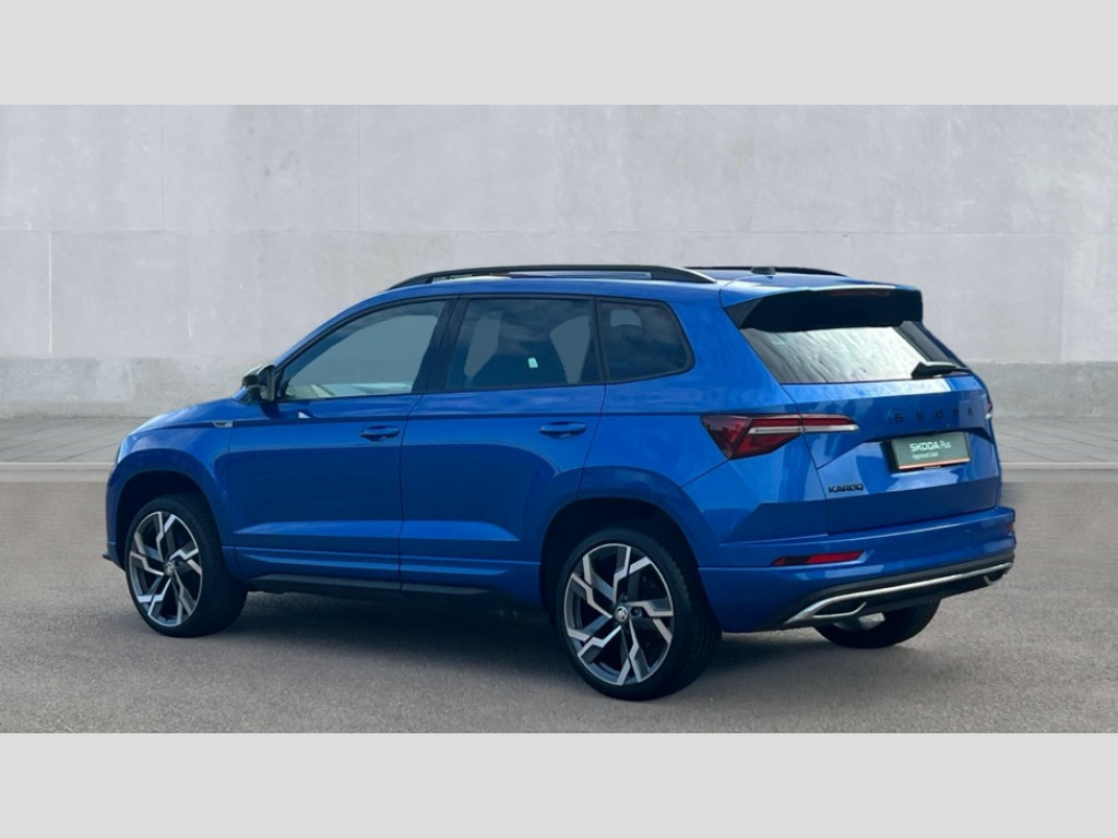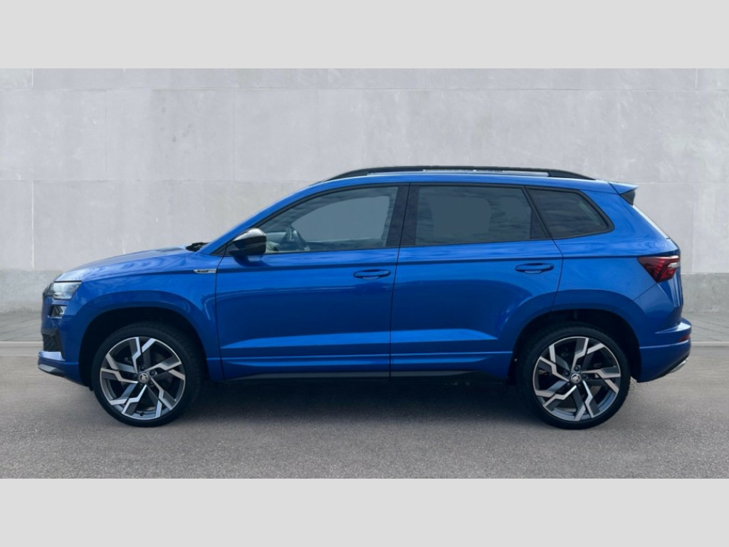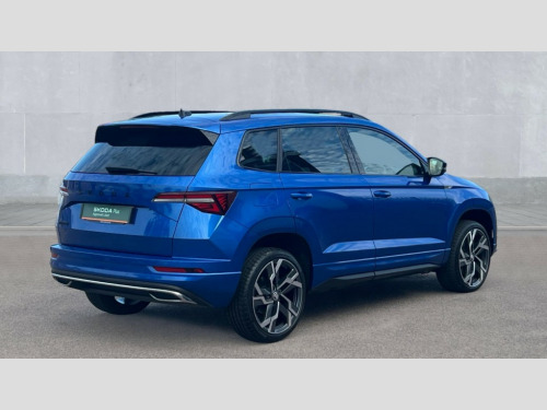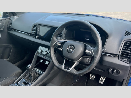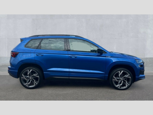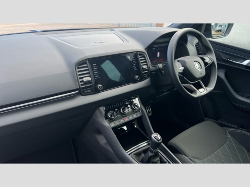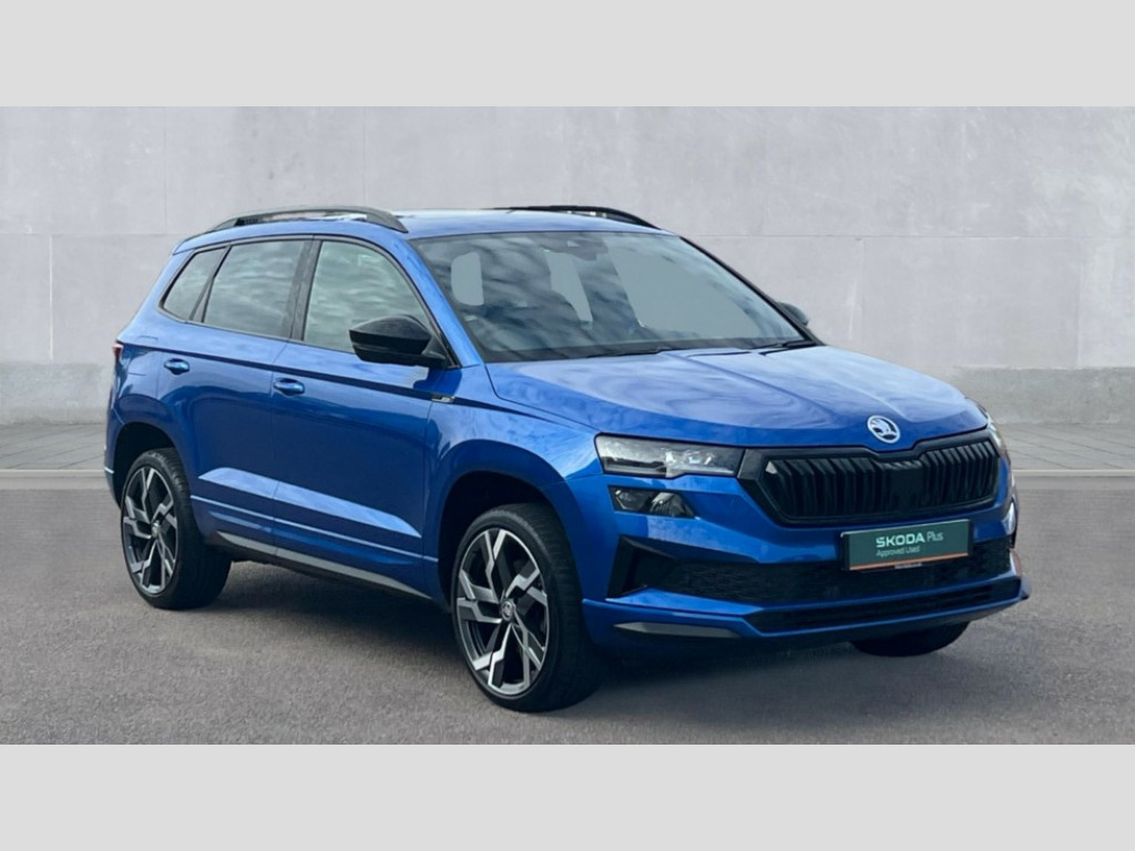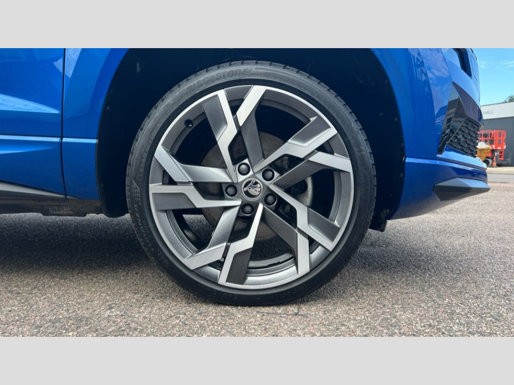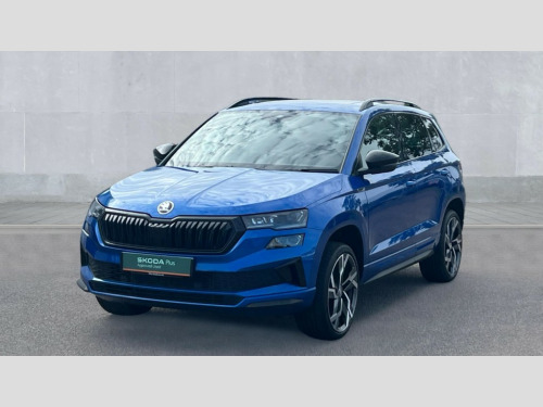 Skoda Karoq 1.5 TSI Sportline 5dr 8" Digital display, Advanced driver attention and drowsiness monitor, Emergency services call system, Outside temperature gauge, Sensor for driver assistance systems, Service interval indicator, SmartLink wireless for Apple and wired for Android, Start/stop system with regenerative braking, USB C Port x 2 in front centre console, Virtual Cockpit - 10.25" digital display, Virtual pedal with electrically operated boot door, Wireless smartphone charging, DAB radio with Bluetooth, USB connection, Acoustic glass, Aero front windscreen wipers with intermittent function, Auto dimming rear view mirror with light and rain sensors, Black door mirrors, Black electric window control buttons, Black radiator grille, Black roof rails, Body colour door handles, Electric front and rear windows with child proof lock, Front door steps with SportLine logo, Heated rear windscreen, LED daytime running lights, LED rear lights with high functionality welcome effect and dynamic indicators, Light assistant (coming/leaving home/tunnel light), Panoramic sliding sunroof, Plastic scuff plates in door apertures, Privacy glass, Protective door side sills in body colour, Rear diffuser, Rear side wing doors, Rear spoiler, Rear window wiper with washer system and intermittent control, Safety reflectors on front doors, Skoda lettering on tailgate in black, Sportline badge on front fender, Sportline decorative inserts with badging, Sports front and rear bumpers, Third brake light, 1.5 litre bottle holders in driver and front passenger door panels, 12V socket in boot, 12v socket in front centre armrest with storage compartment and rear air vents, 2 x Tablet holder, 3 rear height adjustable headrests, 3 seat bench in 2nd row, 3 spoke sports leather heated multifunction steering wheel, 4 foldable roof handles with rear coat hooks, Black floor carpet, Black roof headlining, Chrome inner door handles, Foldable hooks in the boot, Front head restraints, Height adjustable front three point seats belts with tensioners, Height/reach adjust steering wheel, Ice scraper, Illuminated glovebox, Illuminated luggage compartment, Isofix child seat preparation for front passenger seat, Isofix child seat preparation outer rear, Manual lumbar support for front seats, Pen holder, Pollen filter, Rear boot cover, Rear reading lights, Rear seats fixed folding and divided 60:40, Rubbish bin door, Safety vest holder, Single front passenger seat, Storage box in upper central dashboard closed, Sunvisors with illuminated vanity mirrors, Textile floor mats, Ticket holder, Titan black interior ceiling, Umbrella under passenger seat, Under passenger seat storage compartment, LED Interior lighting pack with Skoda welcome logo - Karoq, Light Pack - Karoq, Non Smokers pack, Automatic door unlocking in case of crash, Automatic fuel cut off in case of crash, Driver airbag, Electronic parking brake with auto hold function, Emergency rear braking signal, ESC (incl. ABS+MSR+ASR+EDS+HBA+DSR+RBS+MKB), Front side airbags, Head airbags, Hill hold control, Knee airbags, Passenger airbag with switch-off function, Pedestrian monitor, Seatbelt reminder signalisation and pretensioner for all seats, Three point seatbelts rear, Two tone horn, Tyre pressure monitor, Alarm with interior monitoring, back up horn and tilt sensor with safe function, Electronic engine immobiliser, Keyless entry and start/stop, Remote central locking with 2 remote folding keys, Black air vent surround, Black centre console, carbon door decor, Satin black dashboard, Satin black door trim, 19" Sagittarius anthracite alloy wheels, Anti-theft wheel bolts protection, Breakdown and tool kit