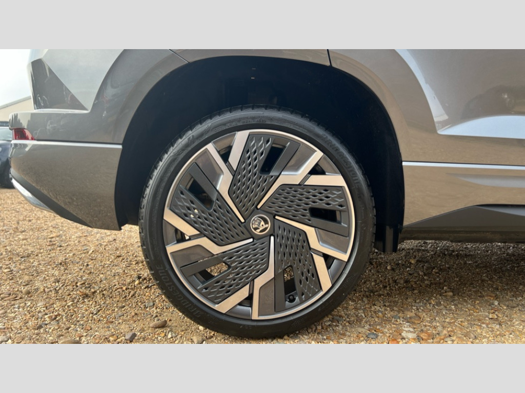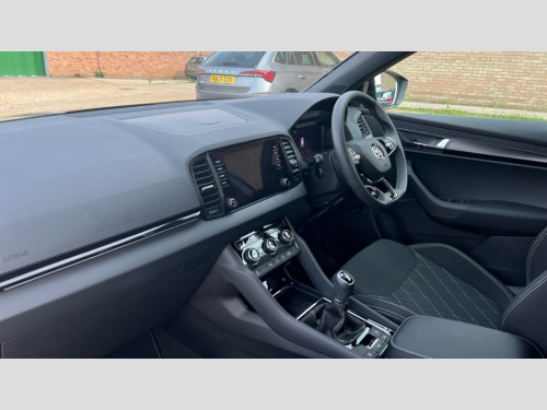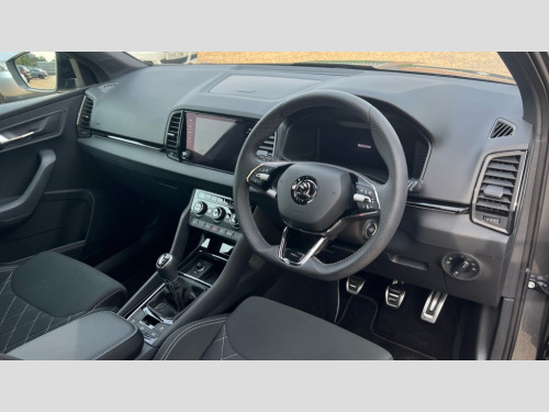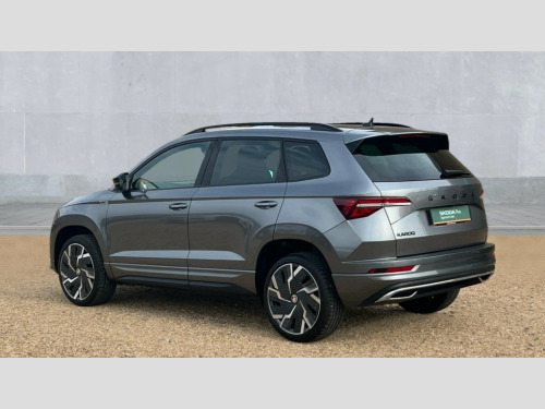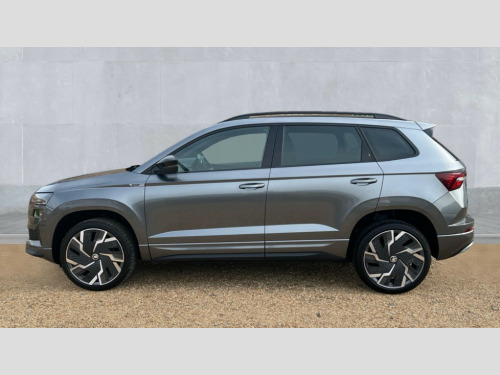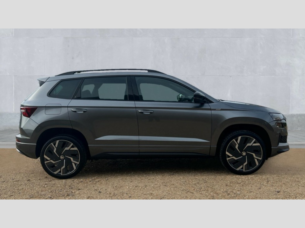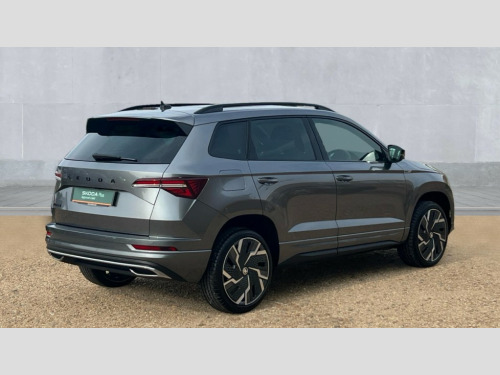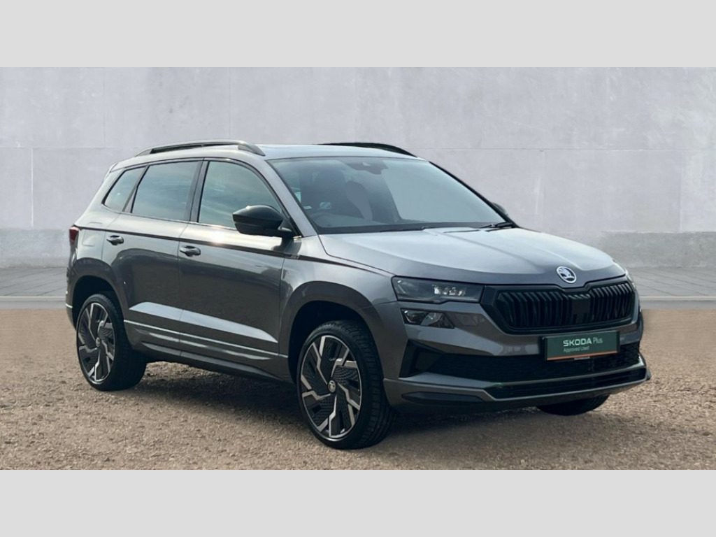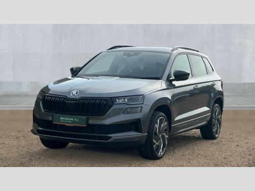 Skoda Karoq 1.5 TSI Sportline 5dr - 19" Sagittarius alloy wheels in anthracite 8" Digital display, Advanced driver attention and drowsiness monitor, Emergency services call system, Outside temperature gauge, Sensor for driver assistance systems, Service interval indicator, SmartLink wireless for Apple and wired for Android, Start/stop system with regenerative braking, USB C Port x 2 in front centre console, Virtual Cockpit - 10.25" digital display, Virtual pedal with electrically operated boot door, Wireless smartphone charging, Canton sound system, DAB radio with Bluetooth, USB connection, Acoustic glass, Aero front windscreen wipers with intermittent function, Auto dimming rear view mirror with light and rain sensors, Black door mirrors, Black electric window control buttons, Black radiator grille, Black roof rails, Body colour door handles, Electric front and rear windows with child proof lock, Front door steps with SportLine logo, Heated rear windscreen, LED 3rd brake light, LED daytime running lights, LED rear lights with high functionality welcome effect and dynamic indicators, Light assistant (coming/leaving home/tunnel light), Panoramic sliding sunroof, Plastic scuff plates in door apertures, Privacy glass, Protective door side sills in body colour, Rear diffuser, Rear side wing doors, Rear spoiler, Rear window wiper with washer system and intermittent control, Safety reflectors on front doors, Skoda lettering on tailgate in black, Sportline badge on front fender, Sportline decorative inserts with badging, Sports front and rear bumpers, 1.5 litre bottle holders in driver and front passenger door panels, 12V socket in boot, 12v socket in front centre armrest with storage compartment and rear air vents, 2 x Tablet holder, 3 rear height adjustable headrests, 3 seat bench in 2nd row, 3 spoke leather sports multifunction steering wheel and silver stitching, 4 foldable roof handles with rear coat hooks, Black floor carpet, Chrome inner door handles, Double sided boot floor, Foldable hooks in the boot, Front head restraints, Height adjustable front three point seats belts with tensioners, Height/reach adjust steering wheel, Ice scraper, Illuminated glovebox, Illuminated luggage compartment, Isofix child seat preparation for front passenger seat, Isofix child seat preparation outer rear, Manual lumbar support for front seats, Pen holder, Pollen filter, Rear boot cover, Rear reading lights, Rear seats fixed folding and divided 60:40, Rubbish bin door, Safety vest holder, Single front passenger seat, Storage box in upper central dashboard closed, Sunvisors with illuminated vanity mirrors, Textile floor mats, Ticket holder, Titan black interior ceiling, Umbrella under passenger seat, Under passenger seat storage compartment, Welcome animation with sportline logo, Light Pack - Karoq, Non Smokers pack, Automatic door unlocking in case of crash, Automatic fuel cut off in case of crash, Driver airbag, Electronic parking brake with auto hold function, Emergency rear braking signal, ESC including ABS, MSR, ASR, EDS, HBA, DSR, RBS, MKB and traction control, Front side airbags, Head airbags, Hill hold control, Knee airbags, Passenger airbag with switch-off function, Pedestrian monitor, Seatbelt reminder signalisation and pretensioner for all seats, Three point seatbelts rear, Two tone horn, Tyre pressure monitor, Alarm with interior monitoring, back up horn and tilt sensor with safe function, Electronic engine immobiliser, Keyless entry and start/stop, Remote central locking with 2 remote folding keys, Black air vent surround, Black centre console, carbon door decor, Satin black dashboard, Satin black door trim, 19" Sagittarius anthracite alloy wheels, Anti-theft wheel bolts protection, Breakdown and tool kit