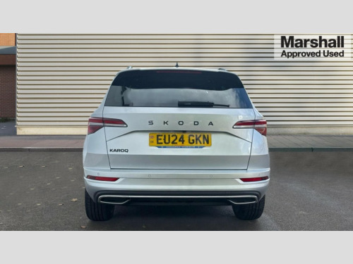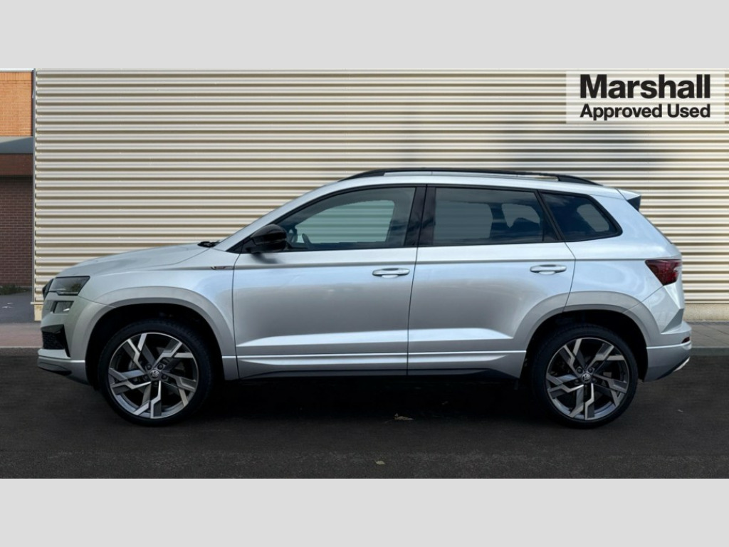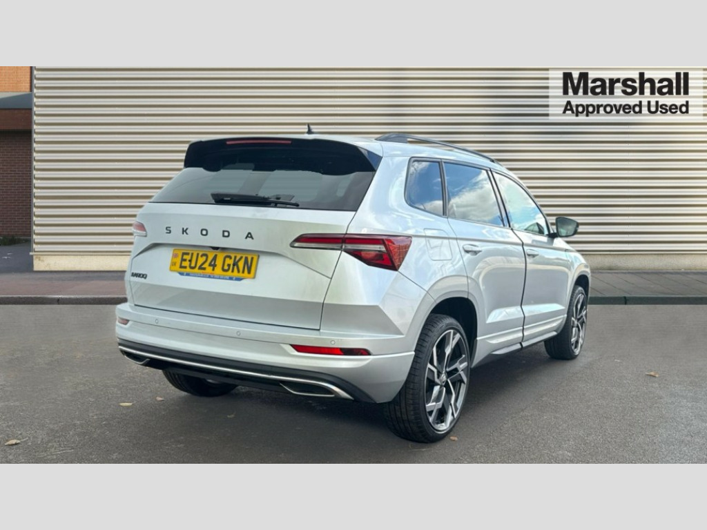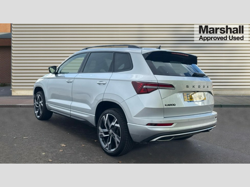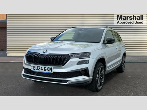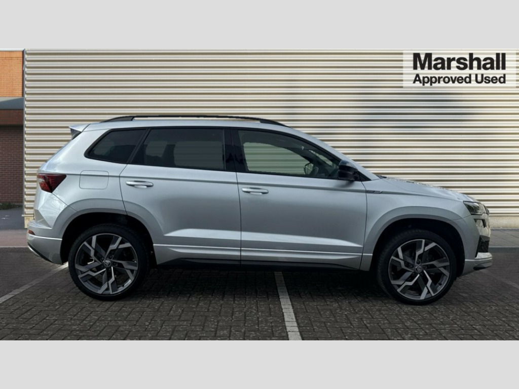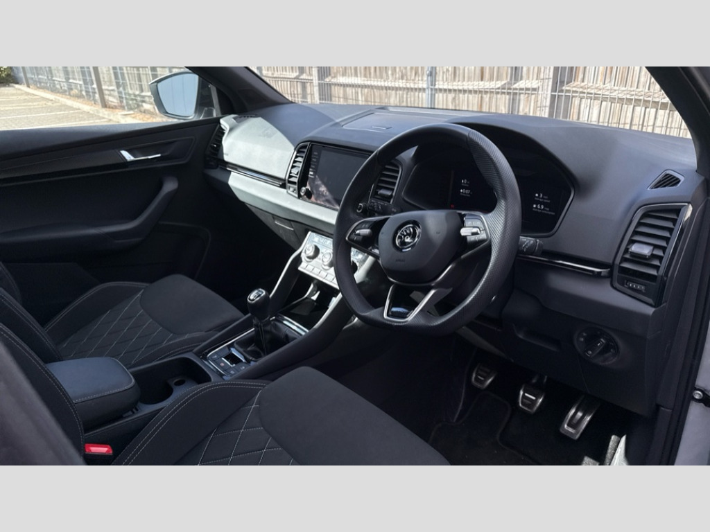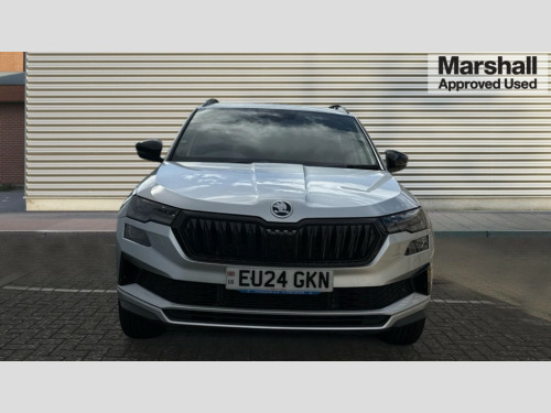 Skoda Karoq 1.5 TSI Sportline 5dr 8" Digital display, Advanced driver attention and drowsiness monitor, Emergency services call system, Outside temperature gauge, Sensor for driver assistance systems, Service interval indicator, SmartLink wireless for Apple and wired for Android, Start/stop system with regenerative braking, USB C Port x 2 in front centre console, Virtual Cockpit - 10.25" digital display, Virtual pedal with electrically operated boot door, Wireless smartphone charging, DAB radio with Bluetooth, USB connection, Acoustic glass, Aero front windscreen wipers with intermittent function, Auto dimming rear view mirror with light and rain sensors, Black door mirrors, Black electric window control buttons, Black radiator grille, Black roof rails, Body colour door handles, Electric front and rear windows with child proof lock, Front door steps with SportLine logo, Heated rear windscreen, LED daytime running lights, LED rear lights with high functionality welcome effect and dynamic indicators, Light assistant (coming/leaving home/tunnel light), Panoramic sliding sunroof, Plastic scuff plates in door apertures, Privacy glass, Protective door side sills in body colour, Rear diffuser, Rear side wing doors, Rear spoiler, Rear window wiper with washer system and intermittent control, Safety reflectors on front doors, Skoda lettering on tailgate in black, Sportline badge on front fender, Sportline decorative inserts with badging, Sports front and rear bumpers, Third brake light, 1.5 litre bottle holders in driver and front passenger door panels, 12V socket in boot, 12v socket in front centre armrest with storage compartment and rear air vents, 2 x Tablet holder, 3 rear height adjustable headrests, 3 seat bench in 2nd row, 3 spoke sports leather heated multifunction steering wheel, 4 foldable roof handles with rear coat hooks, Black floor carpet, Black roof headlining, Chrome inner door handles, Foldable hooks in the boot, Front head restraints, Height adjustable front three point seats belts with tensioners, Height/reach adjust steering wheel, Ice scraper, Illuminated glovebox, Illuminated luggage compartment, Isofix child seat preparation for front passenger seat, Isofix child seat preparation outer rear, Manual lumbar support for front seats, Pen holder, Pollen filter, Rear boot cover, Rear reading lights, Rear seats fixed folding and divided 60:40, Rubbish bin door, Safety vest holder, Single front passenger seat, Storage box in upper central dashboard closed, Sunvisors with illuminated vanity mirrors, Textile floor mats, Ticket holder, Titan black interior ceiling, Umbrella under passenger seat, Under passenger seat storage compartment, LED Interior lighting pack with Skoda welcome logo - Karoq, Light Pack - Karoq, Non Smokers pack, Automatic door unlocking in case of crash, Automatic fuel cut off in case of crash, Driver airbag, Electronic parking brake with auto hold function, Emergency rear braking signal, ESC (incl. ABS+MSR+ASR+EDS+HBA+DSR+RBS+MKB), Front side airbags, Head airbags, Hill hold control, Knee airbags, Passenger airbag with switch-off function, Pedestrian monitor, Seatbelt reminder signalisation and pretensioner for all seats, Three point seatbelts rear, Two tone horn, Tyre pressure monitor, Alarm with interior monitoring, back up horn and tilt sensor with safe function, Electronic engine immobiliser, Keyless entry and start/stop, Remote central locking with 2 remote folding keys, Black air vent surround, Black centre console, carbon door decor, Satin black dashboard, Satin black door trim, 19" Sagittarius anthracite alloy wheels, Anti-theft wheel bolts protection, Breakdown and tool kit