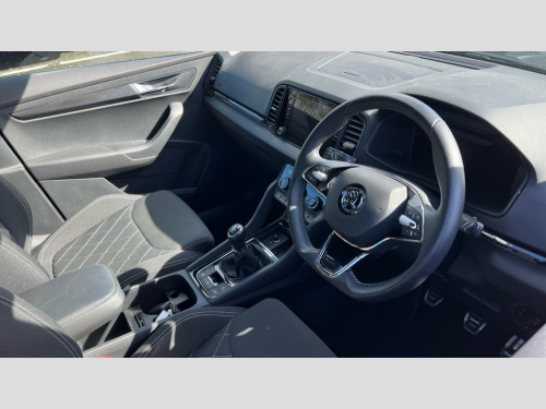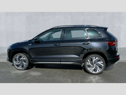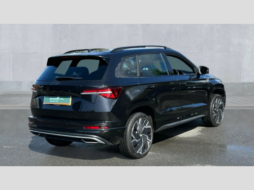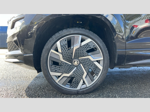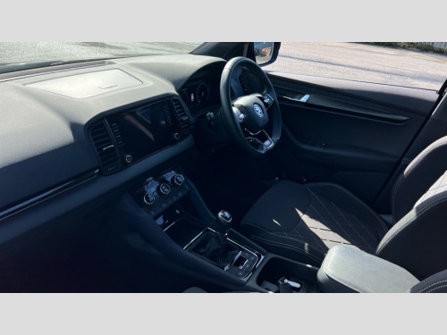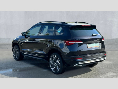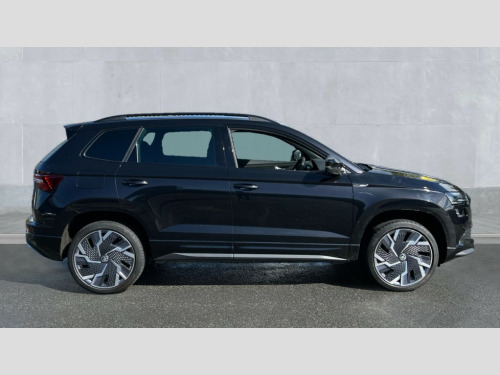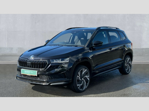 Skoda Karoq 1.5 TSI Sportline 5dr 8" Digital display, Care connect, Colour multifunction trip computer, Driver fatigue sensor, Emergency services call system, Outside temperature gauge, Service interval indicator, SmartLink wireless for Apple and wired for Android, Start/stop system with regenerative braking, USB C Port x 2 in front centre console, Virtual pedal with electrically operated boot door, 8 Speakers, DAB radio with Bluetooth, USB connection, Acoustic glass, Aero front windscreen wipers with intermittent function, Auto dimming rear view mirror with light and rain sensors, Automatic headlight control system, Black door mirrors, Black electric window control buttons, Black radiator grille, Black roof rails, Body colour door handles, Electric front and rear windows with child proof lock, Front door steps with SportLine logo, Heated rear windscreen, LED daytime running lights, LED rear lights with high functionality welcome effect and dynamic indicators, Light assistant (coming/leaving home/tunnel light), Panoramic sliding sunroof, Plastic scuff plates, Privacy glass, Protective door side sills in body colour, Rear diffuser, Rear side wing doors, Rear spoiler, Rear window wiper with washer system and intermittent control, Safety reflectors on front doors, Skoda lettering on tailgate in black, Sportline badge on front fender, Sportline decorative inserts with badging, Sports front and rear bumpers, 1.5 litre bottle holders in driver and front passenger door panels, 12V socket in boot, 12v socket in front centre armrest with storage compartment and rear air vents, 2 Folding hooks and nets in boot, 3 rear height adjustable headrests, 3 seat bench in 2nd row, 3 spoke leather sports multifunction steering wheel and silver stitching, 4 foldable roof handles with rear coat hooks, Black floor carpet, Black roof headlining, Chrome inner door handles, Double sided boot floor, Foldable hooks in the boot, Front head restraints, Height adjustable front three point seats belts with tensioners, Height/reach adjust steering wheel, Ice scraper, Illuminated glovebox, Illuminated luggage compartment, Isofix child seat preparation outer rear, Manual lumbar support for front seats, Pen holder, Pollen filter, Rear boot cover, Rear reading lights, Rear seats fixed folding and divided 60:40, Rubbish bin door, Safety vest holder, Single front passenger seat, Storage box in upper central dashboard closed, Sunvisors with illuminated vanity mirrors, Textile floor mats, Ticket holder, Titan black interior ceiling, Welcome animation with sportline logo, Light Pack - Karoq, Parking pack - Karoq, Automatic door unlocking in case of crash, Automatic fuel cut off in case of crash, Child locks on rear doors, Driver airbag, Electronic parking brake with auto hold function, Emergency rear braking signal, ESC including ABS, MSR, ASR, EDS, HBA, DSR, RBS, MKB and traction control, Front side airbags, Hill hold control, Knee airbags, Passenger airbag with switch-off function, Pedestrian monitor, Seatbelt reminder signalisation and pretensioner for all seats, Three point seatbelts rear, Two tone horn, Tyre pressure display, Tyre pressure monitor, Alarm with interior monitoring, back up horn and tilt sensor with safe function, Electronic engine immobiliser, Keyless entry and start/stop, Remote central locking with 2 remote folding keys, Black air vent surround, Black centre console, Satin black dashboard, Satin black door trim, 19" Sagitarius anthracite alloy wheels with matt black aero inserts, Anti-theft wheel bolts protection, Matt black aero hub caps, Storage on wheel cover, Tool kit