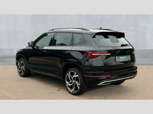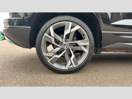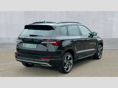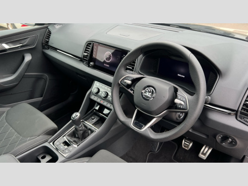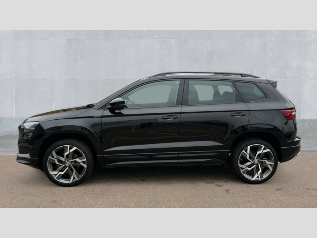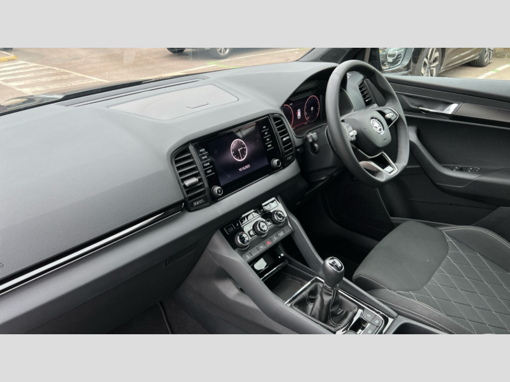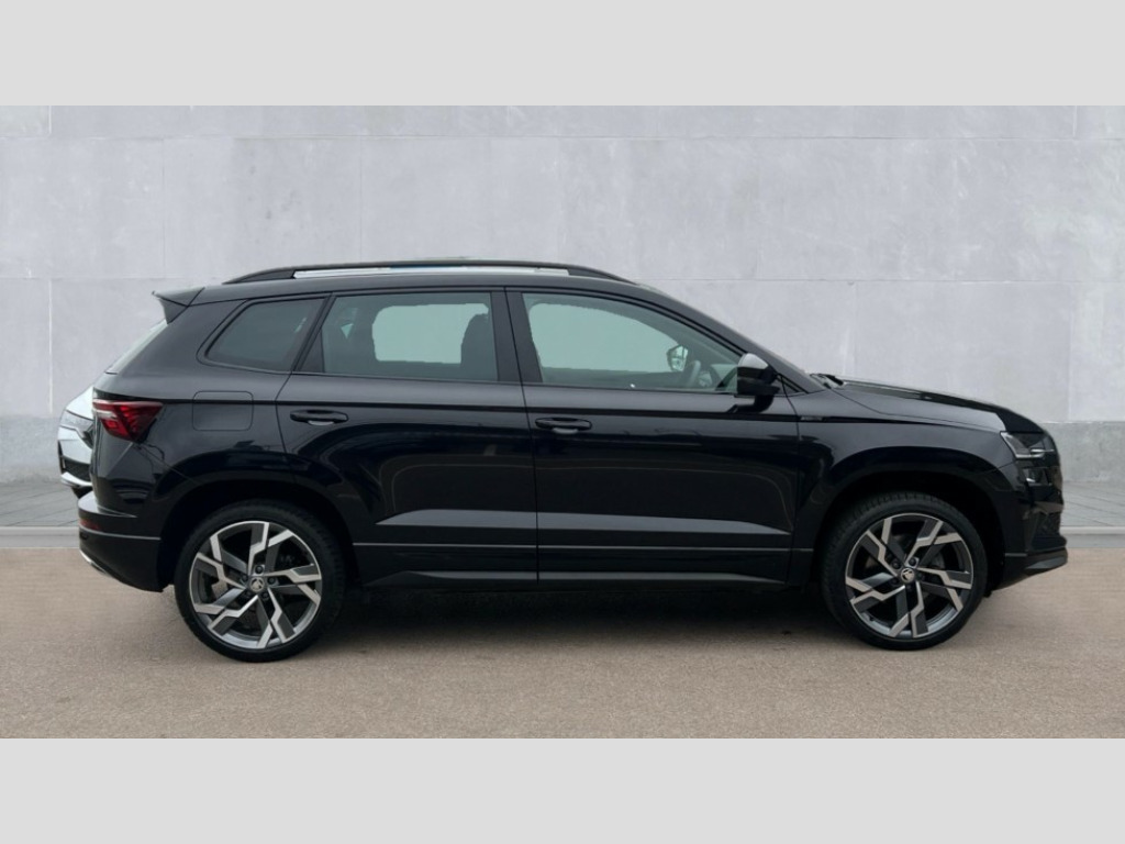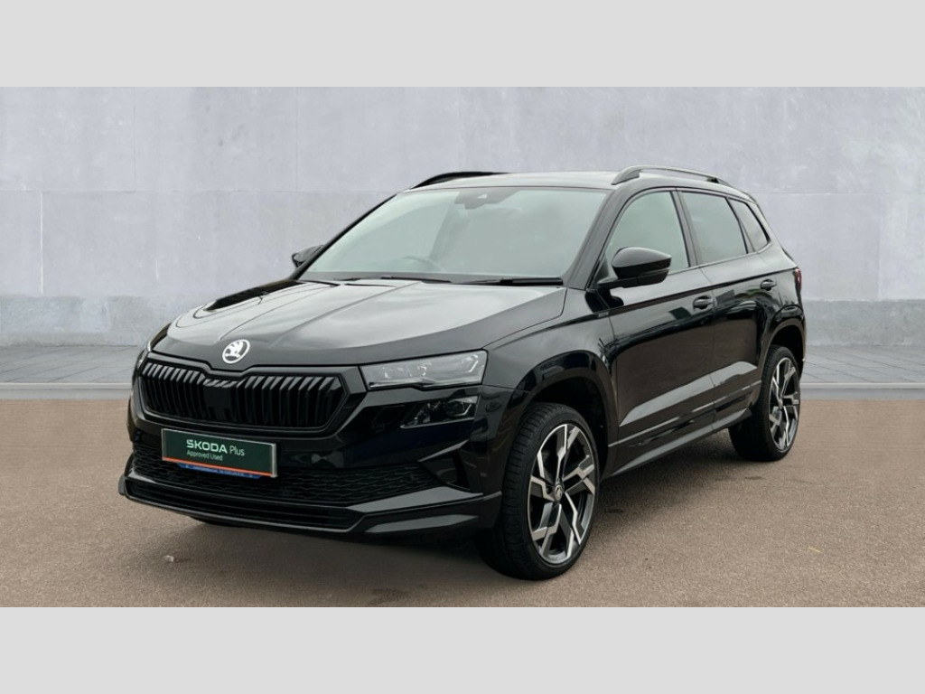 Skoda Karoq 1.5 TSI Sportline 5dr 8" Digital display, Advanced driver attention and drowsiness monitor, Emergency services call system, Outside temperature gauge, Sensor for driver assistance systems, Service interval indicator, SmartLink wireless for Apple and wired for Android, Start/stop system with regenerative braking, USB C Port x 2 in front centre console, Virtual Cockpit - 10.25" digital display, Virtual pedal with electrically operated boot door, Wireless smartphone charging, DAB radio with Bluetooth, USB connection, Acoustic glass, Aero front windscreen wipers with intermittent function, Auto dimming rear view mirror with light and rain sensors, Black door mirrors, Black electric window control buttons, Black radiator grille, Black roof rails, Body colour door handles, Electric front and rear windows with child proof lock, Front door steps with SportLine logo, Heated rear windscreen, LED daytime running lights, LED rear lights with high functionality welcome effect and dynamic indicators, Light assistant (coming/leaving home/tunnel light), Panoramic sliding sunroof, Plastic scuff plates in door apertures, Privacy glass, Protective door side sills in body colour, Rear diffuser, Rear side wing doors, Rear spoiler, Rear window wiper with washer system and intermittent control, Safety reflectors on front doors, Skoda lettering on tailgate in black, Sportline badge on front fender, Sportline decorative inserts with badging, Sports front and rear bumpers, Third brake light, 1.5 litre bottle holders in driver and front passenger door panels, 12V socket in boot, 12v socket in front centre armrest with storage compartment and rear air vents, 2 x Tablet holder, 3 rear height adjustable headrests, 3 seat bench in 2nd row, 3 spoke sports leather heated multifunction steering wheel, 4 foldable roof handles with rear coat hooks, Black floor carpet, Black roof headlining, Chrome inner door handles, Foldable hooks in the boot, Front head restraints, Height adjustable front three point seats belts with tensioners, Height/reach adjust steering wheel, Ice scraper, Illuminated glovebox, Illuminated luggage compartment, Isofix child seat preparation for front passenger seat, Isofix child seat preparation outer rear, Manual lumbar support for front seats, Pen holder, Pollen filter, Rear boot cover, Rear reading lights, Rear seats fixed folding and divided 60:40, Rubbish bin door, Safety vest holder, Single front passenger seat, Storage box in upper central dashboard closed, Sunvisors with illuminated vanity mirrors, Textile floor mats, Ticket holder, Titan black interior ceiling, Umbrella under passenger seat, Under passenger seat storage compartment, LED Interior lighting pack with Skoda welcome logo - Karoq, Light Pack - Karoq, Non Smokers pack, Automatic door unlocking in case of crash, Automatic fuel cut off in case of crash, Driver airbag, Electronic parking brake with auto hold function, Emergency rear braking signal, ESC (incl. ABS+MSR+ASR+EDS+HBA+DSR+RBS+MKB), Front side airbags, Head airbags, Hill hold control, Knee airbags, Passenger airbag with switch-off function, Pedestrian monitor, Seatbelt reminder signalisation and pretensioner for all seats, Three point seatbelts rear, Two tone horn, Tyre pressure monitor, Alarm with interior monitoring, back up horn and tilt sensor with safe function, Electronic engine immobiliser, Keyless entry and start/stop, Remote central locking with 2 remote folding keys, Black air vent surround, Black centre console, carbon door decor, Satin black dashboard, Satin black door trim, 19" Sagittarius anthracite alloy wheels, Anti-theft wheel bolts protection, Breakdown and tool kit
