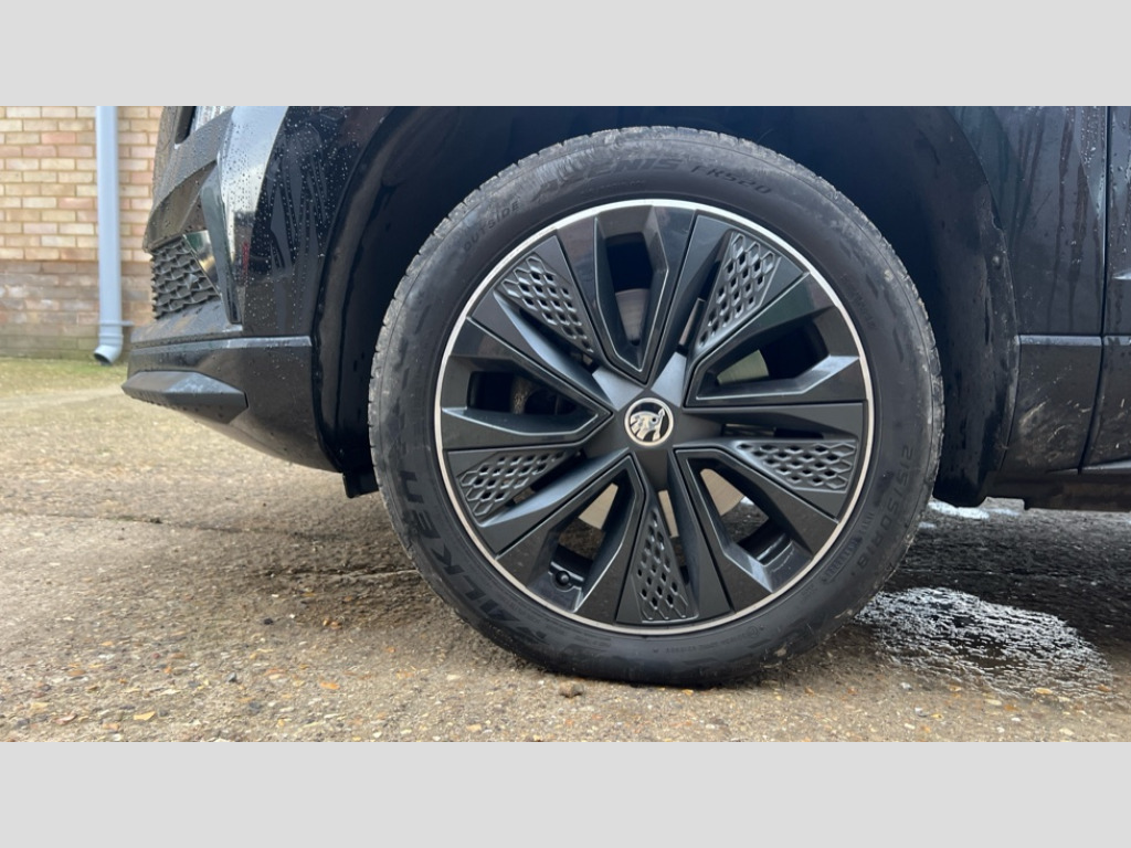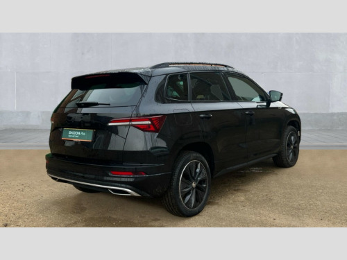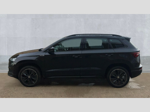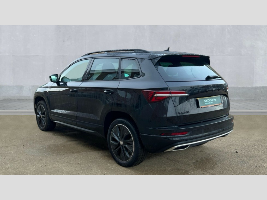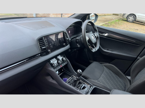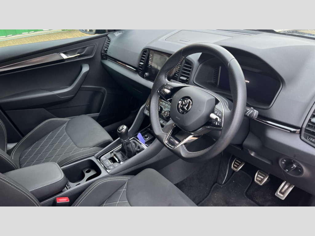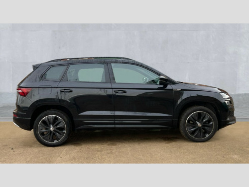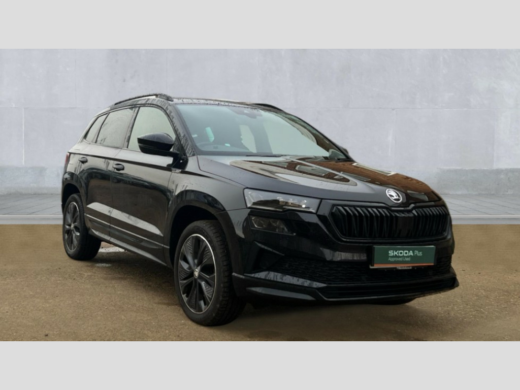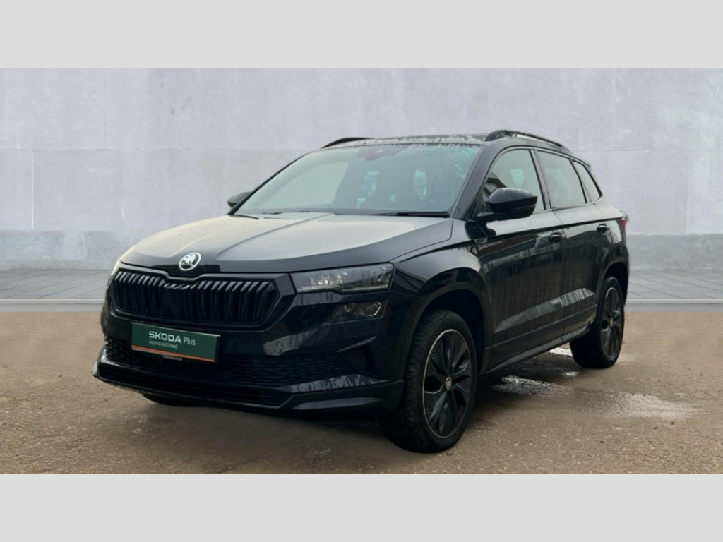 Skoda Karoq 1.5 TSI Sportline 5dr 8" Digital display, Care connect, Colour multifunction trip computer, Driver fatigue sensor, Emergency services call system, Outside temperature gauge, Service interval indicator, SmartLink wireless for Apple and wired for Android, Start/stop system with regenerative braking, USB C Port x 2 in front centre console, Virtual pedal with electrically operated boot door, 8 Speakers, DAB radio with Bluetooth, USB connection, Acoustic glass, Aero front windscreen wipers with intermittent function, Auto dimming rear view mirror with light and rain sensors, Automatic headlight control system, Black door mirrors, Black electric window control buttons, Black radiator grille, Black roof rails, Body colour door handles, Electric front and rear windows with child proof lock, Front door steps with SportLine logo, Heated rear windscreen, LED daytime running lights, LED rear lights with high functionality welcome effect and dynamic indicators, Light assistant (coming/leaving home/tunnel light), Panoramic sliding sunroof, Plastic scuff plates, Privacy glass, Protective door side sills in body colour, Rear diffuser, Rear side wing doors, Rear spoiler, Rear window wiper with washer system and intermittent control, Safety reflectors on front doors, Skoda lettering on tailgate in black, Sportline badge on front fender, Sportline decorative inserts with badging, Sports front and rear bumpers, 1.5 litre bottle holders in driver and front passenger door panels, 12V socket in boot, 12v socket in front centre armrest with storage compartment and rear air vents, 2 Folding hooks and nets in boot, 3 rear height adjustable headrests, 3 seat bench in 2nd row, 3 spoke leather sports multifunction steering wheel and silver stitching, 4 foldable roof handles with rear coat hooks, Black floor carpet, Black roof headlining, Chrome inner door handles, Double sided boot floor, Foldable hooks in the boot, Front head restraints, Height adjustable front three point seats belts with tensioners, Height/reach adjust steering wheel, Ice scraper, Illuminated glovebox, Illuminated luggage compartment, Isofix child seat preparation outer rear, Manual lumbar support for front seats, Pen holder, Pollen filter, Rear boot cover, Rear reading lights, Rear seats fixed folding and divided 60:40, Rubbish bin door, Safety vest holder, Single front passenger seat, Storage box in upper central dashboard closed, Sunvisors with illuminated vanity mirrors, Textile floor mats, Ticket holder, Titan black interior ceiling, Welcome animation with sportline logo, Light Pack - Karoq, Parking pack - Karoq, Automatic door unlocking in case of crash, Automatic fuel cut off in case of crash, Child locks on rear doors, Driver airbag, Electronic parking brake with auto hold function, Emergency rear braking signal, ESC including ABS, MSR, ASR, EDS, HBA, DSR, RBS, MKB and traction control, Front side airbags, Hill hold control, Knee airbags, Passenger airbag with switch-off function, Pedestrian monitor, Seatbelt reminder signalisation and pretensioner for all seats, Three point seatbelts rear, Two tone horn, Tyre pressure display, Tyre pressure monitor, Alarm with interior monitoring, back up horn and tilt sensor with safe function, Electronic engine immobiliser, Keyless entry and start/stop, Remote central locking with 2 remote folding keys, Black air vent surround, Black centre console, Satin black dashboard, Satin black door trim, 19" Sagitarius anthracite alloy wheels with matt black aero inserts, Anti-theft wheel bolts protection, Matt black aero hub caps, Storage on wheel cover, Tool kit