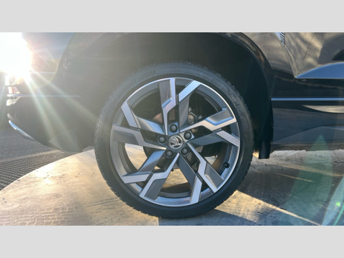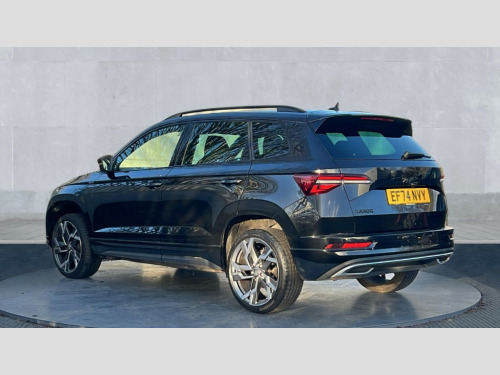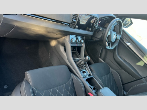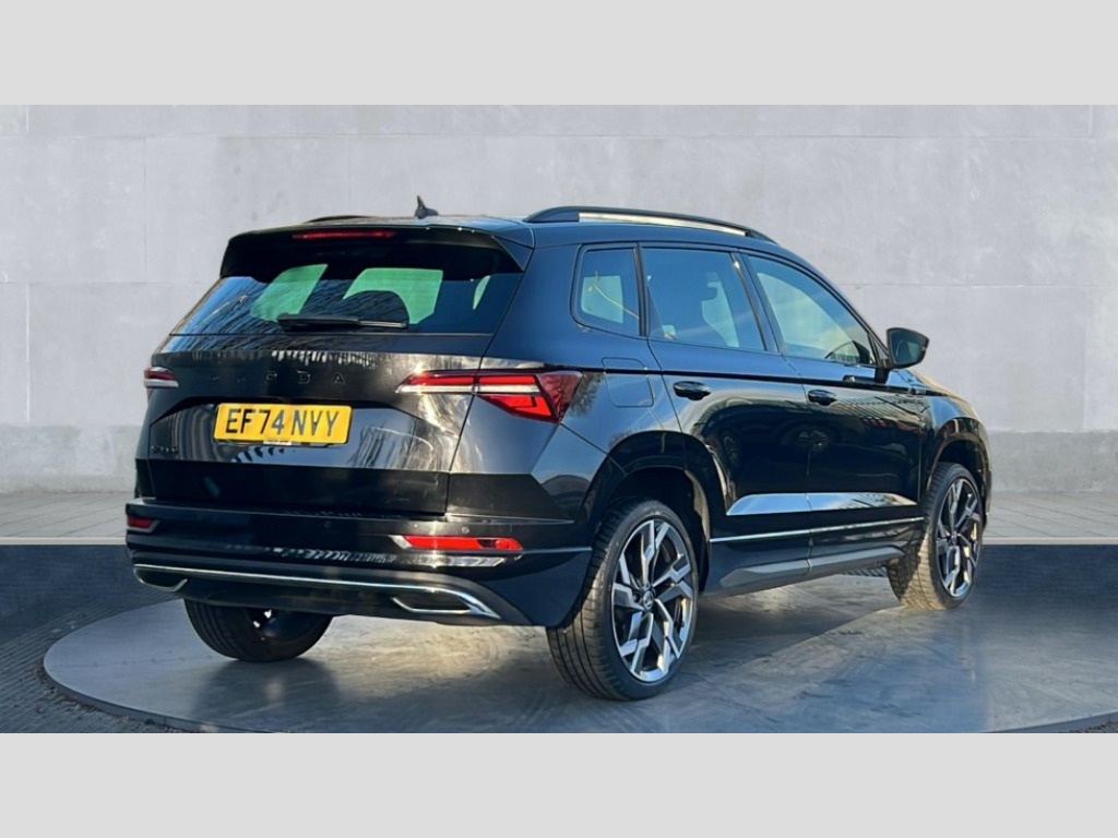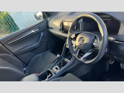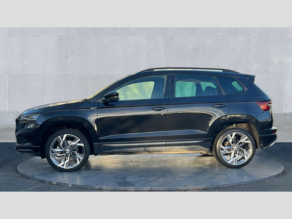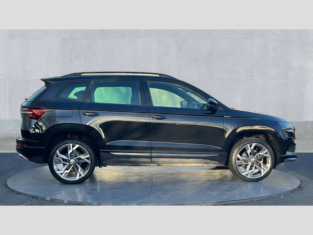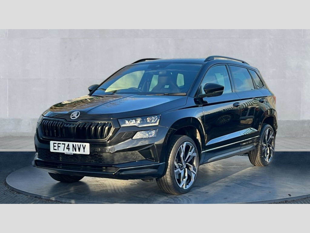 Skoda Karoq 1.5 TSI Sportline 5dr 8" Digital display, Advanced driver attention and drowsiness monitor, Emergency services call system, Outside temperature gauge, Sensor for driver assistance systems, Service interval indicator, SmartLink wireless for Apple and wired for Android, Start/stop system with regenerative braking, USB C Port x 2 in front centre console, Virtual Cockpit - 10.25" digital display, Virtual pedal with electrically operated boot door, Wireless smartphone charging, DAB radio with Bluetooth, USB connection, Acoustic glass, Aero front windscreen wipers with intermittent function, Auto dimming rear view mirror with light and rain sensors, Black door mirrors, Black electric window control buttons, Black radiator grille, Black roof rails, Body colour door handles, Electric front and rear windows with child proof lock, Front door steps with SportLine logo, Heated rear windscreen, LED daytime running lights, LED rear lights with high functionality welcome effect and dynamic indicators, Light assistant (coming/leaving home/tunnel light), Panoramic sliding sunroof, Plastic scuff plates in door apertures, Privacy glass, Protective door side sills in body colour, Rear diffuser, Rear side wing doors, Rear spoiler, Rear window wiper with washer system and intermittent control, Safety reflectors on front doors, Skoda lettering on tailgate in black, Sportline badge on front fender, Sportline decorative inserts with badging, Sports front and rear bumpers, Third brake light, 1.5 litre bottle holders in driver and front passenger door panels, 12V socket in boot, 12v socket in front centre armrest with storage compartment and rear air vents, 2 x Tablet holder, 3 rear height adjustable headrests, 3 seat bench in 2nd row, 3 spoke sports leather heated multifunction steering wheel, 4 foldable roof handles with rear coat hooks, Black floor carpet, Black roof headlining, Chrome inner door handles, Foldable hooks in the boot, Front head restraints, Height adjustable front three point seats belts with tensioners, Height/reach adjust steering wheel, Ice scraper, Illuminated glovebox, Illuminated luggage compartment, Isofix child seat preparation for front passenger seat, Isofix child seat preparation outer rear, Manual lumbar support for front seats, Pen holder, Pollen filter, Rear boot cover, Rear reading lights, Rear seats fixed folding and divided 60:40, Rubbish bin door, Safety vest holder, Single front passenger seat, Storage box in upper central dashboard closed, Sunvisors with illuminated vanity mirrors, Textile floor mats, Ticket holder, Titan black interior ceiling, Umbrella under passenger seat, Under passenger seat storage compartment, LED Interior lighting pack with Skoda welcome logo - Karoq, Light Pack - Karoq, Non Smokers pack, Automatic door unlocking in case of crash, Automatic fuel cut off in case of crash, Driver airbag, Electronic parking brake with auto hold function, Emergency rear braking signal, ESC (incl. ABS+MSR+ASR+EDS+HBA+DSR+RBS+MKB), Front side airbags, Head airbags, Hill hold control, Knee airbags, Passenger airbag with switch-off function, Pedestrian monitor, Seatbelt reminder signalisation and pretensioner for all seats, Three point seatbelts rear, Two tone horn, Tyre pressure monitor, Alarm with interior monitoring, back up horn and tilt sensor with safe function, Electronic engine immobiliser, Keyless entry and start/stop, Remote central locking with 2 remote folding keys, Black air vent surround, Black centre console, carbon door decor, Satin black dashboard, Satin black door trim, 19" Sagittarius anthracite alloy wheels, Anti-theft wheel bolts protection, Breakdown and tool kit