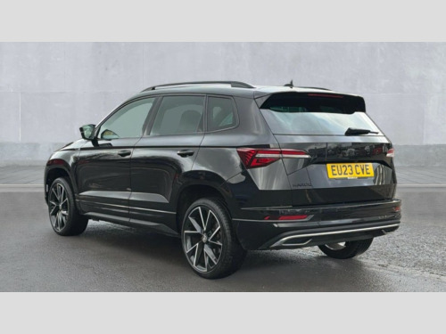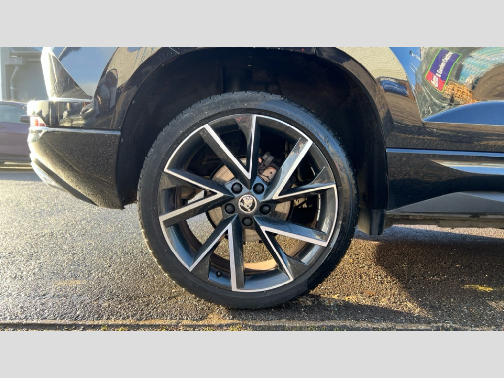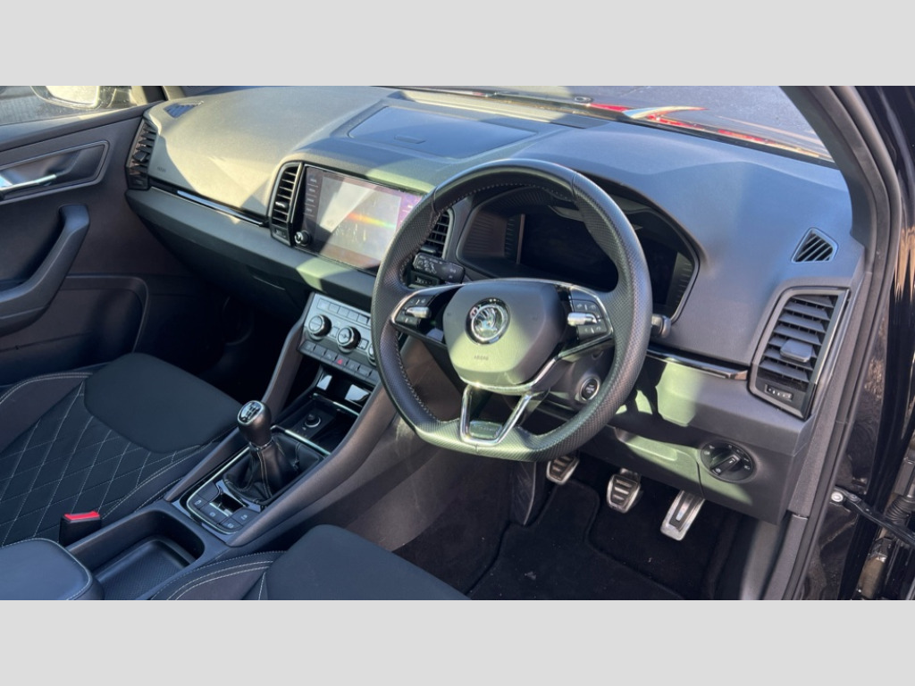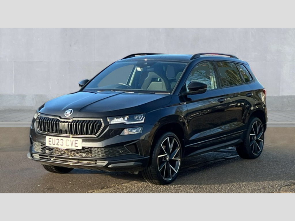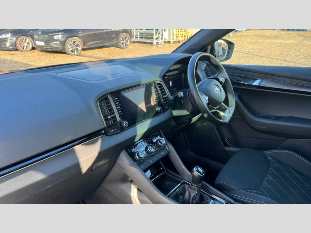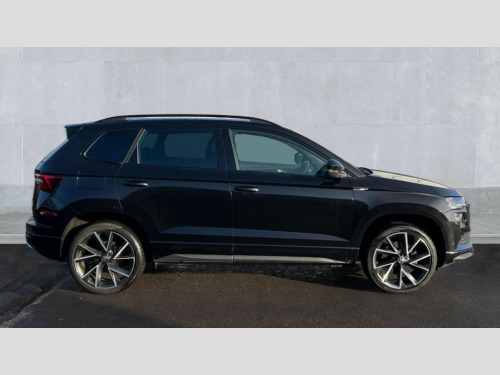 Skoda Karoq 1.5 TSI Sportline 5dr 8" Digital display, Care connect, Driver fatigue sensor, Emergency services call system, Outside temperature gauge, Service interval indicator, SmartLink wireless for Apple and wired for Android, Start/stop system with regenerative braking, USB C Port x 2 in front centre console, Virtual cockpit, Virtual pedal with electrically operated boot door, 8 Speakers, DAB radio with Bluetooth, USB connection, Wireless charging without wireless aerial connection, Acoustic glass, Aero front windscreen wipers with intermittent function, Auto dimming rear view mirror with light and rain sensors, Black door mirrors, Black electric window control buttons, Black radiator grille, Black roof rails, Body colour door handles, Dynamic headlight range control with cornering light function, Electric front and rear windows with child proof lock, Front door steps with SportLine logo, Heated rear windscreen, LED daytime running lights, LED rear lights with high functionality welcome effect and dynamic indicators, Light assistant (coming/leaving home/tunnel light), Panoramic sliding sunroof, Plastic scuff plates, Privacy glass, Protective door side sills in body colour, Rear diffuser, Rear side wing doors, Rear spoiler, Rear window wiper with washer system and intermittent control, Safety reflectors on front doors, Skoda lettering on tailgate in black, Sportline badge on front fender, Sportline decorative inserts with badging, Sports front and rear bumpers, 1.5 litre bottle holders in driver and front passenger door panels, 12V socket in boot, 12v socket in front centre armrest with storage compartment and rear air vents, 2 Folding hooks and nets in boot, 3 rear height adjustable headrests, 3 seat bench in 2nd row, 3 spoke leather sports multifunction steering wheel and silver stitching, 4 foldable roof handles with rear coat hooks, Black floor carpet, Black roof headlining, Chrome inner door handles, Double sided boot floor, Foldable hooks in the boot, Front head restraints, Height adjustable front three point seats belts with tensioners, Height/reach adjust steering wheel, Ice scraper, Illuminated glovebox, Illuminated luggage compartment, Isofix child seat preparation outer rear, Manual lumbar support for front seats, Pen holder, Pollen filter, Rear boot cover, Rear reading lights, Rear seats fixed folding and divided 60:40, Rubbish bin door, Safety vest holder, Single front passenger seat, Storage box in upper central dashboard closed, Sunvisors with illuminated vanity mirrors, Textile floor mats, Ticket holder, Titan black interior ceiling, Welcome animation with sportline logo, Light Pack - Karoq, Parking pack - Karoq, Automatic door unlocking in case of crash, Automatic fuel cut off in case of crash, Child locks on rear doors, Driver airbag, Electronic parking brake with auto hold function, Emergency rear braking signal, ESC including ABS, MSR, ASR, EDS, HBA, DSR, RBS, MKB and traction control, Front side airbags, Hill hold control, Knee airbags, Passenger airbag with switch-off function, Pedestrian monitor, Seatbelt reminder signalisation and pretensioner for all seats, Three point seatbelts rear, Two tone horn, Tyre pressure display, Tyre pressure monitor, Alarm with interior monitoring, back up horn and tilt sensor with safe function, Electronic engine immobiliser, Keyless entry and start/stop, Remote central locking with 2 remote folding keys, Black air vent surround, Black centre console, Satin black dashboard, Satin black door trim, 19" Vega black polished alloy wheels, Anti-theft wheel bolts protection, Matt black aero hub caps, Storage on wheel cover, Tool kit