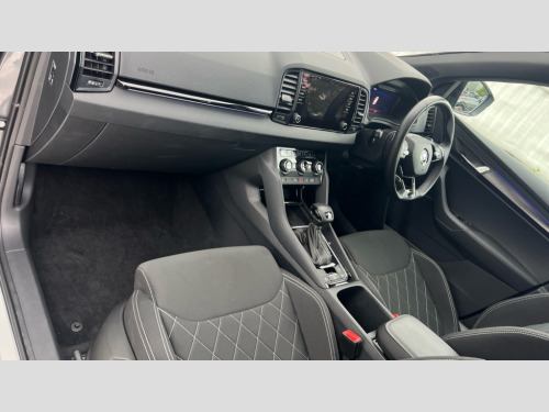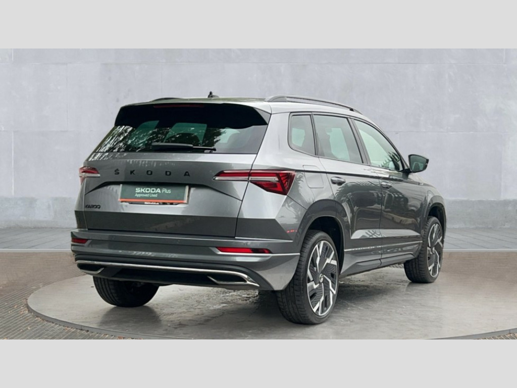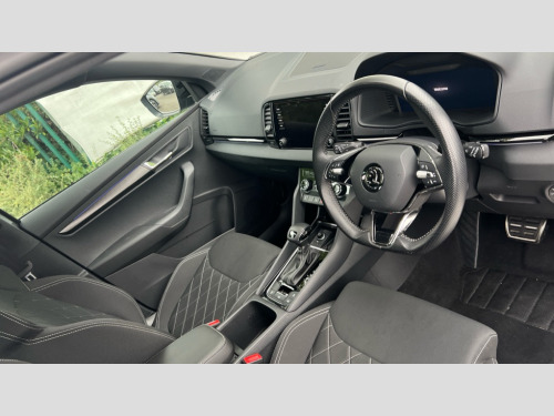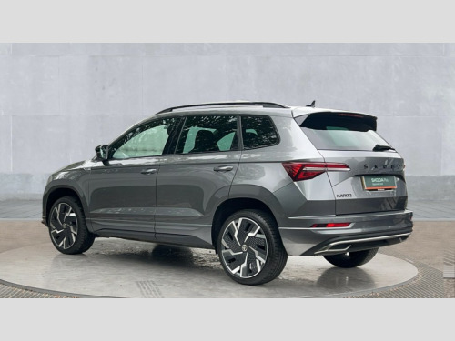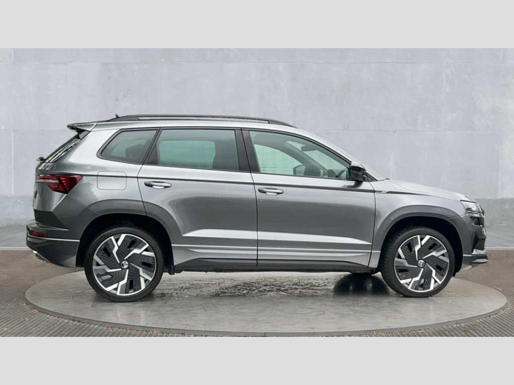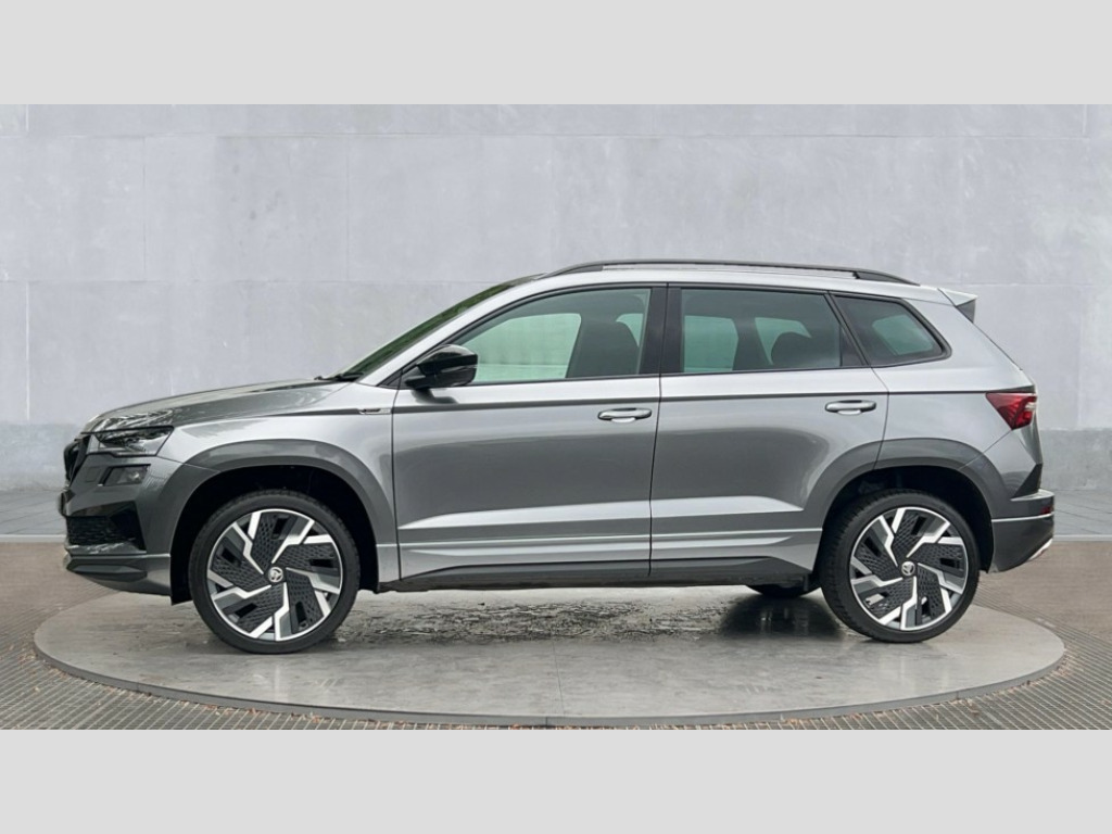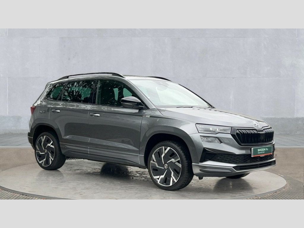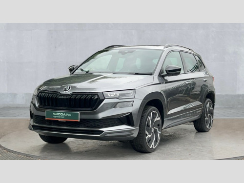 Skoda Karoq 1.5 TSI Sportline 5dr DSG 8" Digital display, Care connect, Driver fatigue sensor, Emergency services call system, Outside temperature gauge, Service interval indicator, SmartLink wireless for Apple and wired for Android, Start/stop system with regenerative braking, USB C Port x 2 in front centre console, Virtual cockpit, Virtual pedal with electrically operated boot door, 8 Speakers, DAB radio with Bluetooth, USB connection, Wireless charging without wireless aerial connection, Acoustic glass, Aero front windscreen wipers with intermittent function, Auto dimming rear view mirror with light and rain sensors, Black door mirrors, Black electric window control buttons, Black radiator grille, Black roof rails, Body colour door handles, Electric front and rear windows with child proof lock, Front door steps with SportLine logo, Heated rear windscreen, LED daytime running lights, LED rear lights with high functionality welcome effect and dynamic indicators, Light assistant (coming/leaving home/tunnel light), Panoramic sliding sunroof, Plastic scuff plates, Privacy glass, Protective door side sills in body colour, Rear diffuser, Rear side wing doors, Rear spoiler, Rear window wiper with washer system and intermittent control, Safety reflectors on front doors, Skoda lettering on tailgate in black, Sportline badge on front fender, Sportline decorative inserts with badging, Sports front and rear bumpers, 1.5 litre bottle holders in driver and front passenger door panels, 12V socket in boot, 12v socket in front centre armrest with storage compartment and rear air vents, 3 rear height adjustable headrests, 3 seat bench in 2nd row, 3 spoke leather sports multifunction steering wheel and silver stitching with gear shift paddles, 4 foldable roof handles with rear coat hooks, Black floor carpet, Black roof headlining, Chrome inner door handles, Double sided boot floor, Foldable hooks in the boot, Front head restraints, Height adjustable front three point seats belts with tensioners, Height/reach adjust steering wheel, Ice scraper, Illuminated glovebox, Illuminated luggage compartment, Isofix child seat preparation outer rear, Manual lumbar support for front seats, Pen holder, Pollen filter, Rear boot cover, Rear reading lights, Rear seats fixed folding and divided 60:40, Rubbish bin door, Safety vest holder, Single front passenger seat, Storage box in upper central dashboard closed, Sunvisors with illuminated vanity mirrors, Textile floor mats, Ticket holder, Titan black interior ceiling, Welcome animation with sportline logo, Boot pack - Karoq, Light Pack - Karoq, Parking pack - Karoq, Automatic door unlocking in case of crash, Automatic fuel cut off in case of crash, Child locks on rear doors, Driver airbag, Electronic parking brake with auto hold function, Emergency rear braking signal, ESC including ABS, MSR, ASR, EDS, HBA, DSR, RBS, MKB and traction control, Front side airbags, Hill hold control, Knee airbags, Passenger airbag with switch-off function, Pedestrian monitor, Seatbelt reminder signalisation and pretensioner for all seats, Three point seatbelts rear, Two tone horn, Tyre pressure display, Tyre pressure monitor, Alarm with interior monitoring, back up horn and tilt sensor with safe function, Electronic engine immobiliser, Keyless entry and start/stop, Remote central locking with 2 remote folding keys, Black air vent surround, Black centre console, Satin black dashboard, Satin black door trim, 19" Sagitarius anthracite alloy wheels with matt black aero inserts, Anti-theft wheel bolts protection, Matt black aero hub caps, Tool kit