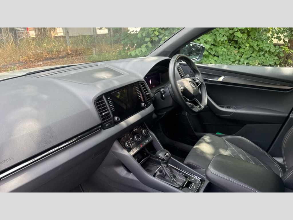 19" Sagittarius alloy wheels in anthracite 8" Digital display, Care connect, Driver fatigue sensor, Emergency services call system, Outside temperature gauge, Service interval indicator, SmartLink wireless for Apple and wired for Android, Start/stop system with regenerative braking, USB C Port x 2 in front centre console, Virtual cockpit, Virtual pedal with electrically operated boot door, 8 Speakers, DAB radio with Bluetooth, USB connection, Wireless charging without wireless aerial connection, Acoustic glass, Aero front windscreen wipers with intermittent function, Auto dimming rear view mirror with light and rain sensors, Black door mirrors, Black electric window control buttons, Black radiator grille, Black roof rails, Body colour door handles, Electric front and rear windows with child proof lock, Front door steps with SportLine logo, Heated rear windscreen, LED daytime running lights, LED rear lights with high functionality welcome effect and dynamic indicators, Light assistant (coming/leaving home/tunnel light), Panoramic sliding sunroof, Plastic scuff plates, Privacy glass, Protective door side sills in body colour, Rear diffuser, Rear side wing doors, Rear spoiler, Rear window wiper with washer system and intermittent control, Safety reflectors on front doors, Skoda lettering on tailgate in black, Sportline badge on front fender, Sportline decorative inserts with badging, Sports front and rear bumpers, 1.5 litre bottle holders in driver and front passenger door panels, 12V socket in boot, 12v socket in front centre armrest with storage compartment and rear air vents, 3 rear height adjustable headrests, 3 seat bench in 2nd row, 3 spoke leather sports multifunction steering wheel and silver stitching with gear shift paddles, 4 foldable roof handles with rear coat hooks, Black floor carpet, Black roof headlining, Chrome inner door handles, Double sided boot floor, Foldable hooks in the boot, Front head restraints, Height adjustable front three point seats belts with tensioners, Height/reach adjust steering wheel, Ice scraper, Illuminated glovebox, Illuminated luggage compartment, Isofix child seat preparation outer rear, Manual lumbar support for front seats, Pen holder, Pollen filter, Rear boot cover, Rear reading lights, Rear seats fixed folding and divided 60:40, Rubbish bin door, Safety vest holder, Single front passenger seat, Storage box in upper central dashboard closed, Sunvisors with illuminated vanity mirrors, Textile floor mats, Ticket holder, Titan black interior ceiling, Welcome animation with sportline logo, Boot pack - Karoq, Light Pack - Karoq, Parking pack - Karoq, Automatic door unlocking in case of crash, Automatic fuel cut off in case of crash, Child locks on rear doors, Driver airbag, Electronic parking brake with auto hold function, Emergency rear braking signal, ESC including ABS, MSR, ASR, EDS, HBA, DSR, RBS, MKB and traction control, Front side airbags, Hill hold control, Knee airbags, Passenger airbag with switch-off function, Pedestrian monitor, Seatbelt reminder signalisation and pretensioner for all seats, Three point seatbelts rear, Two tone horn, Tyre pressure display, Tyre pressure monitor, Alarm with interior monitoring, back up horn and tilt sensor with safe function, Electronic engine immobiliser, Keyless entry and start/stop, Remote central locking with 2 remote folding keys, Black air vent surround, Black centre console, Satin black dashboard, Satin black door trim, 19" Sagitarius anthracite alloy wheels with matt black aero inserts, Anti-theft wheel bolts protection, Matt black aero hub caps, Tool kit