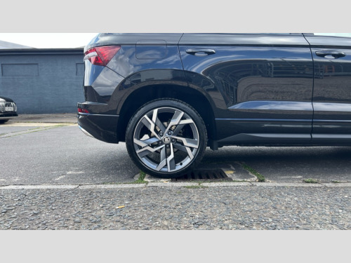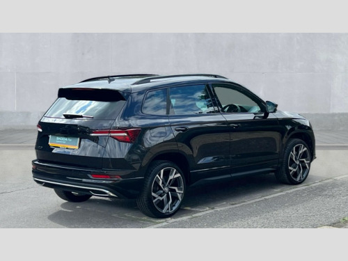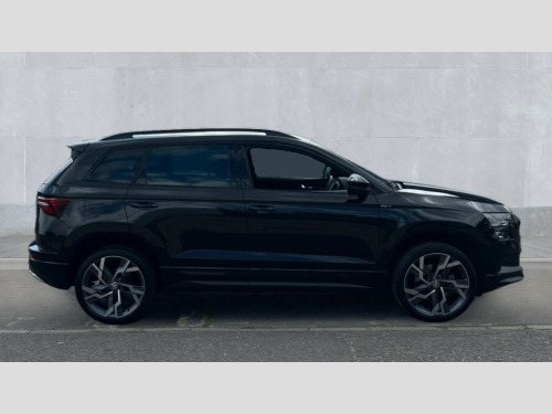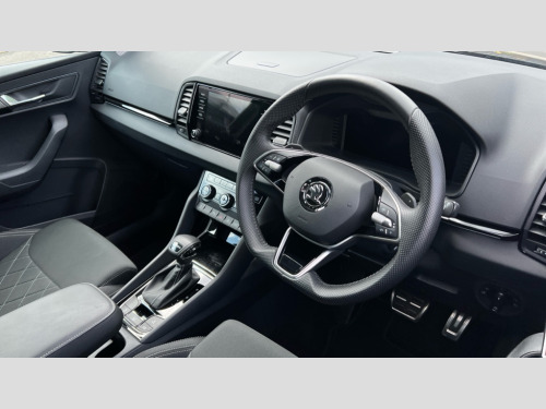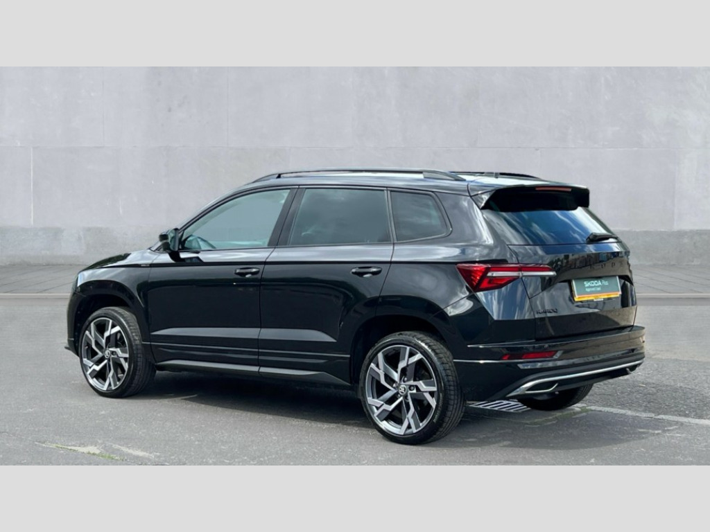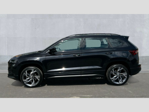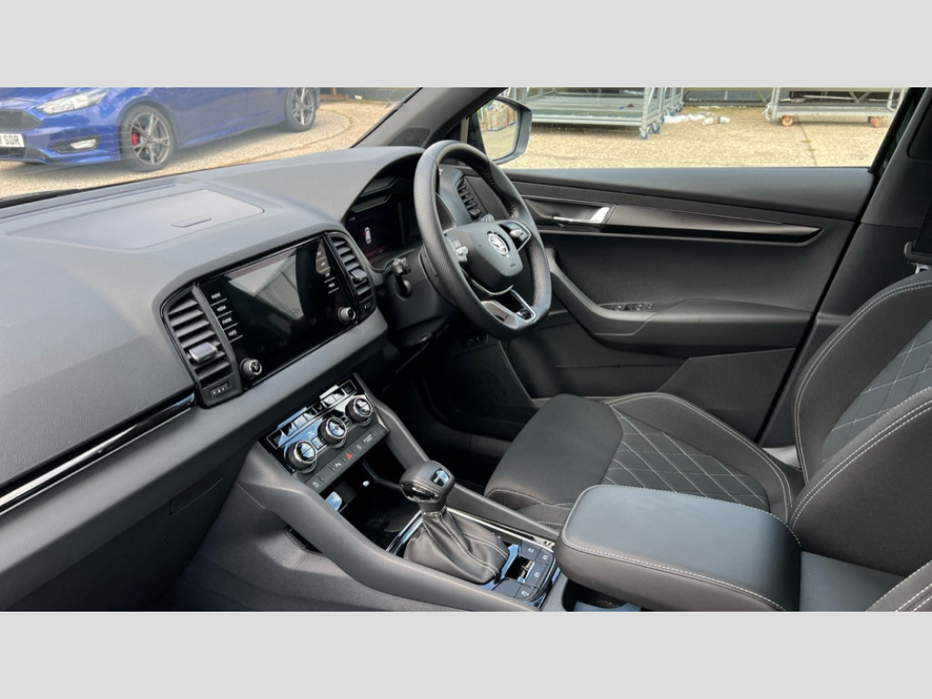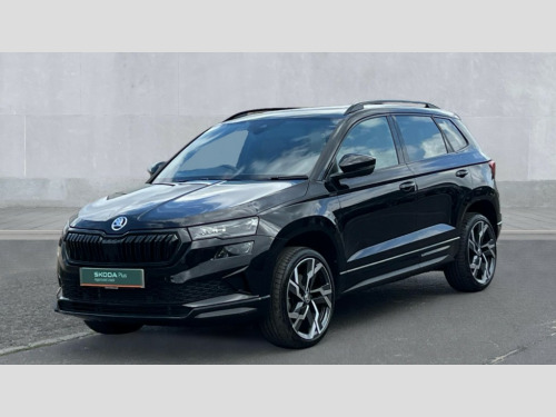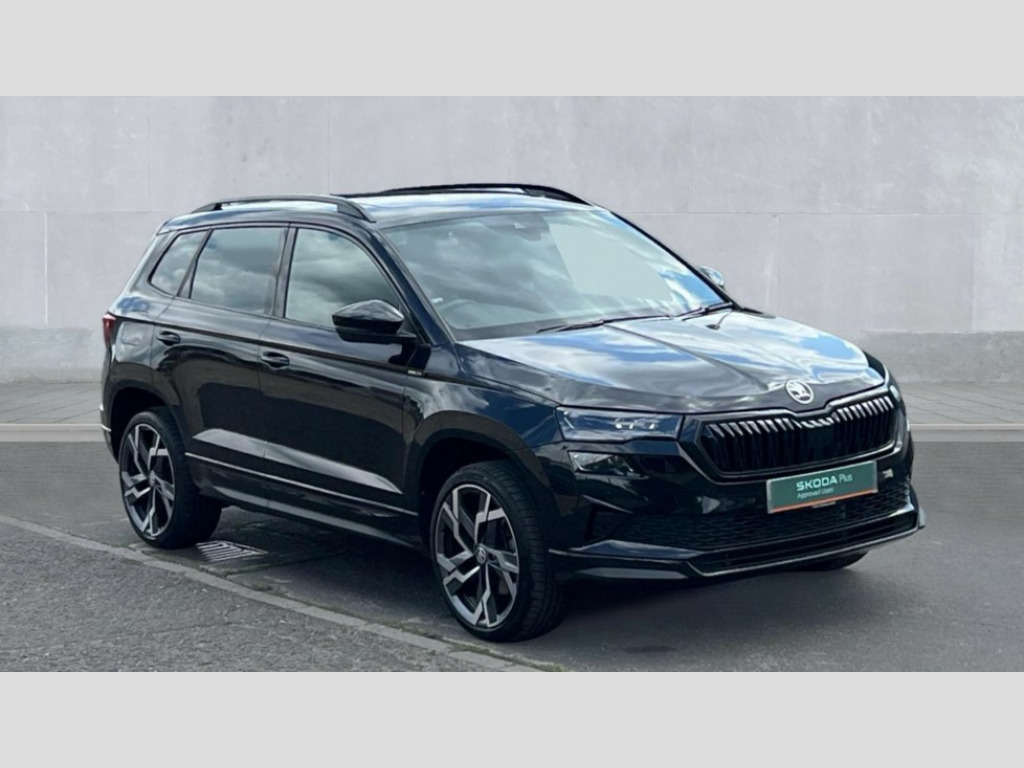 Skoda Karoq 1.5 TSI Sportline 5dr DSG 8" Digital display, Advanced driver attention and drowsiness monitor, Emergency services call system, Outside temperature gauge, Sensor for driver assistance systems, Service interval indicator, SmartLink wireless for Apple and wired for Android, Start/stop system with regenerative braking, USB C Port x 2 in front centre console, Virtual Cockpit - 10.25" digital display, Virtual pedal with electrically operated boot door, Wireless smartphone charging, DAB radio with Bluetooth, USB connection, Acoustic glass, Aero front windscreen wipers with intermittent function, Auto dimming rear view mirror with light and rain sensors, Black door mirrors, Black electric window control buttons, Black radiator grille, Black roof rails, Body colour door handles, Electric front and rear windows with child proof lock, Front door steps with SportLine logo, Heated rear windscreen, LED daytime running lights, LED rear lights with high functionality welcome effect and dynamic indicators, Light assistant (coming/leaving home/tunnel light), Panoramic sliding sunroof, Plastic scuff plates in door apertures, Privacy glass, Protective door side sills in body colour, Rear diffuser, Rear side wing doors, Rear spoiler, Rear window wiper with washer system and intermittent control, Safety reflectors on front doors, Skoda lettering on tailgate in black, Sportline badge on front fender, Sportline decorative inserts with badging, Sports front and rear bumpers, Third brake light, 1.5 litre bottle holders in driver and front passenger door panels, 12V socket in boot, 12v socket in front centre armrest with storage compartment and rear air vents, 2 x Tablet holder, 3 rear height adjustable headrests, 3 seat bench in 2nd row, 3 spoke sports leather heated multifunction steering wheel with DSG paddles, 4 foldable roof handles with rear coat hooks, Black floor carpet, Black roof headlining, Chrome inner door handles, Foldable hooks in the boot, Front head restraints, Height adjustable front three point seats belts with tensioners, Height/reach adjust steering wheel, Ice scraper, Illuminated glovebox, Illuminated luggage compartment, Isofix child seat preparation for front passenger seat, Isofix child seat preparation outer rear, Manual lumbar support for front seats, Pen holder, Pollen filter, Rear boot cover, Rear reading lights, Rear seats fixed folding and divided 60:40, Rubbish bin door, Safety vest holder, Single front passenger seat, Storage box in upper central dashboard closed, Sunvisors with illuminated vanity mirrors, Textile floor mats, Ticket holder, Titan black interior ceiling, Umbrella under passenger seat, Under passenger seat storage compartment, LED Interior lighting pack with Skoda welcome logo - Karoq, Light Pack - Karoq, Non Smokers pack, Automatic door unlocking in case of crash, Automatic fuel cut off in case of crash, Driver airbag, Electronic parking brake with auto hold function, Emergency rear braking signal, ESC (incl. ABS+MSR+ASR+EDS+HBA+DSR+RBS+MKB), Front side airbags, Head airbags, Hill hold control, Knee airbags, Passenger airbag with switch-off function, Pedestrian monitor, Seatbelt reminder signalisation and pretensioner for all seats, Three point seatbelts rear, Two tone horn, Tyre pressure monitor, Alarm with interior monitoring, back up horn and tilt sensor with safe function, Electronic engine immobiliser, Keyless entry and start/stop, Remote central locking with 2 remote folding keys, Black air vent surround, Black centre console, carbon door decor, Satin black dashboard, Satin black door trim, 19" Sagittarius anthracite alloy wheels, Anti-theft wheel bolts protection, Breakdown and tool kit