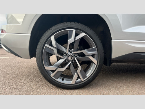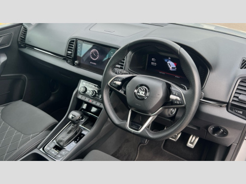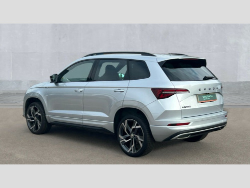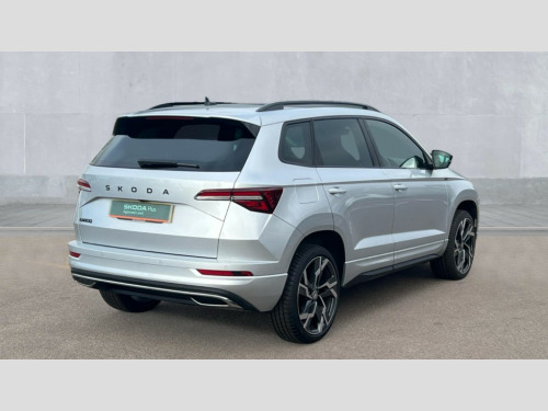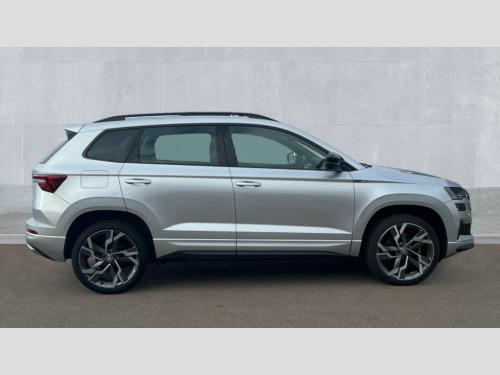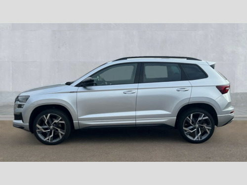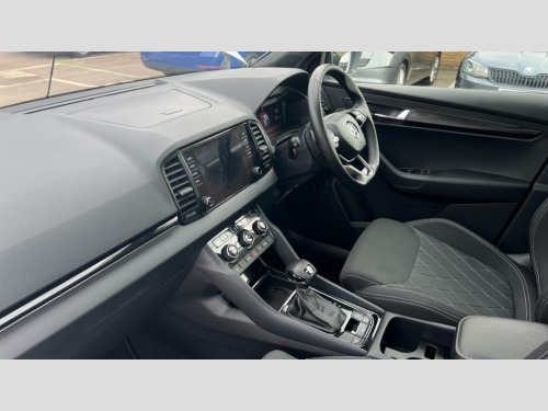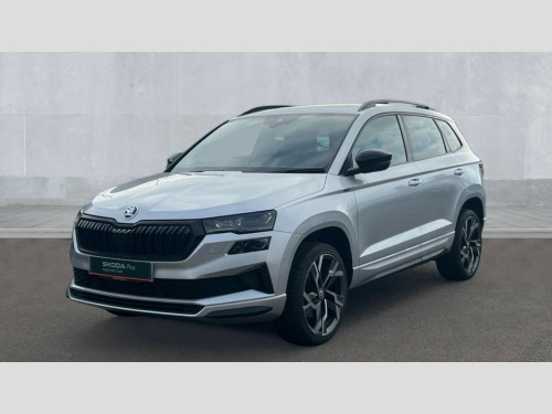Skoda Karoq 1.5 TSI Sportline 5dr DSG 8" Digital display, Advanced driver attention and drowsiness monitor, Emergency services call system, Outside temperature gauge, Sensor for driver assistance systems, Service interval indicator, SmartLink wireless for Apple and wired for Android, Start/stop system with regenerative braking, USB C Port x 2 in front centre console, Virtual Cockpit - 10.25" digital display, Virtual pedal with electrically operated boot door, Wireless smartphone charging, DAB radio with Bluetooth, USB connection, Acoustic glass, Aero front windscreen wipers with intermittent function, Auto dimming rear view mirror with light and rain sensors, Black door mirrors, Black electric window control buttons, Black radiator grille, Black roof rails, Body colour door handles, Electric front and rear windows with child proof lock, Front door steps with SportLine logo, Heated rear windscreen, LED daytime running lights, LED rear lights with high functionality welcome effect and dynamic indicators, Light assistant (coming/leaving home/tunnel light), Panoramic sliding sunroof, Plastic scuff plates in door apertures, Privacy glass, Protective door side sills in body colour, Rear diffuser, Rear side wing doors, Rear spoiler, Rear window wiper with washer system and intermittent control, Safety reflectors on front doors, Skoda lettering on tailgate in black, Sportline badge on front fender, Sportline decorative inserts with badging, Sports front and rear bumpers, Third brake light, 1.5 litre bottle holders in driver and front passenger door panels, 12V socket in boot, 12v socket in front centre armrest with storage compartment and rear air vents, 2 x Tablet holder, 3 rear height adjustable headrests, 3 seat bench in 2nd row, 3 spoke sports leather heated multifunction steering wheel with DSG paddles, 4 foldable roof handles with rear coat hooks, Black floor carpet, Black roof headlining, Chrome inner door handles, Foldable hooks in the boot, Front head restraints, Height adjustable front three point seats belts with tensioners, Height/reach adjust steering wheel, Ice scraper, Illuminated glovebox, Illuminated luggage compartment, Isofix child seat preparation for front passenger seat, Isofix child seat preparation outer rear, Manual lumbar support for front seats, Pen holder, Pollen filter, Rear boot cover, Rear reading lights, Rear seats fixed folding and divided 60:40, Rubbish bin door, Safety vest holder, Single front passenger seat, Storage box in upper central dashboard closed, Sunvisors with illuminated vanity mirrors, Textile floor mats, Ticket holder, Titan black interior ceiling, Umbrella under passenger seat, Under passenger seat storage compartment, LED Interior lighting pack with Skoda welcome logo - Karoq, Light Pack - Karoq, Non Smokers pack, Automatic door unlocking in case of crash, Automatic fuel cut off in case of crash, Driver airbag, Electronic parking brake with auto hold function, Emergency rear braking signal, ESC (incl. ABS+MSR+ASR+EDS+HBA+DSR+RBS+MKB), Front side airbags, Head airbags, Hill hold control, Knee airbags, Passenger airbag with switch-off function, Pedestrian monitor, Seatbelt reminder signalisation and pretensioner for all seats, Three point seatbelts rear, Two tone horn, Tyre pressure monitor, Alarm with interior monitoring, back up horn and tilt sensor with safe function, Electronic engine immobiliser, Keyless entry and start/stop, Remote central locking with 2 remote folding keys, Black air vent surround, Black centre console, carbon door decor, Satin black dashboard, Satin black door trim, 19" Sagittarius anthracite alloy wheels, Anti-theft wheel bolts protection, Breakdown and tool kit