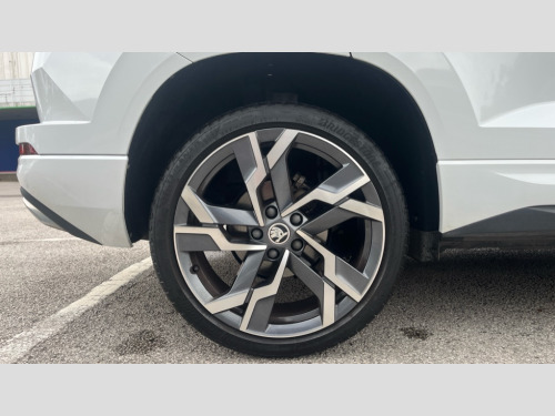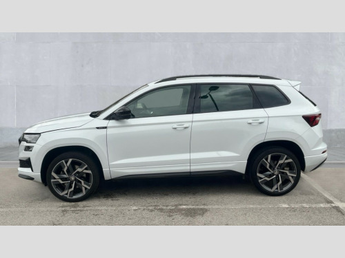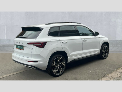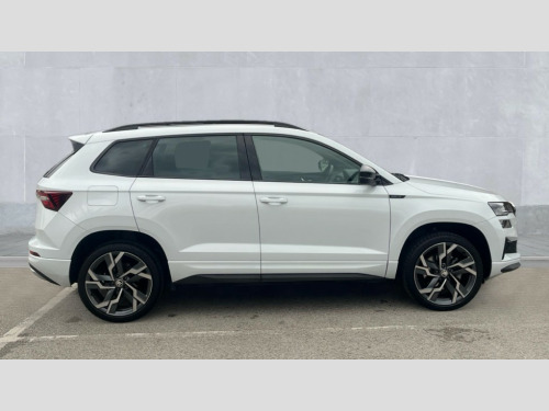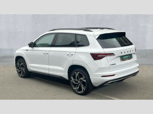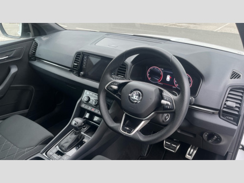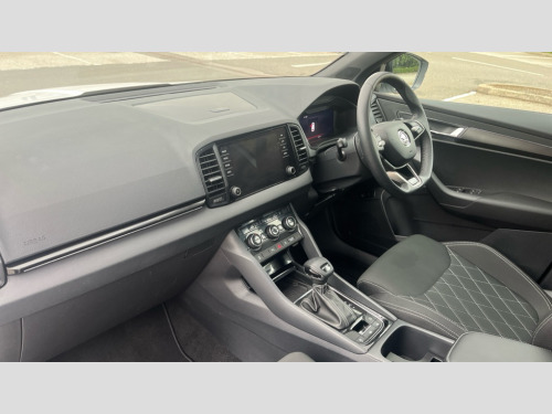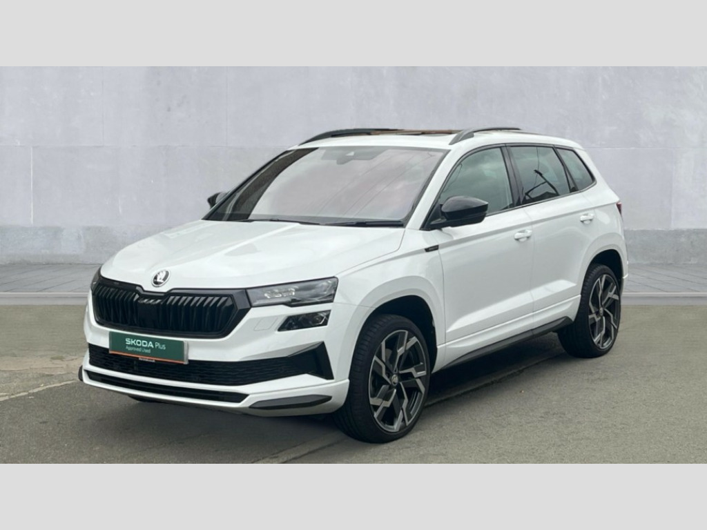Up to 2 years Servicing, 2 years Warranty, 2 years Roadside Assistance, 2 MOT's and up to £250 deposit contribution for vehicles 13-36 months old at 11.4% APR Representative ** 8" Digital display, Advanced driver attention and drowsiness monitor, Emergency services call system, Outside temperature gauge, Sensor for driver assistance systems, Service interval indicator, SmartLink wireless for Apple and wired for Android, Start/stop system with regenerative braking, USB C Port x 2 in front centre console, Virtual Cockpit - 10.25" digital display, Virtual pedal with electrically operated boot door, Wireless smartphone charging, DAB radio with Bluetooth, USB connection, Acoustic glass, Aero front windscreen wipers with intermittent function, Auto dimming rear view mirror with light and rain sensors, Black door mirrors, Black electric window control buttons, Black radiator grille, Black roof rails, Body colour door handles, Electric front and rear windows with child proof lock, Front door steps with SportLine logo, Heated rear windscreen, LED daytime running lights, LED rear lights with high functionality welcome effect and dynamic indicators, Light assistant (coming/leaving home/tunnel light), Panoramic sliding sunroof, Plastic scuff plates in door apertures, Privacy glass, Protective door side sills in body colour, Rear diffuser, Rear side wing doors, Rear spoiler, Rear window wiper with washer system and intermittent control, Safety reflectors on front doors, Skoda lettering on tailgate in black, Sportline badge on front fender, Sportline decorative inserts with badging, Sports front and rear bumpers, Third brake light, 1.5 litre bottle holders in driver and front passenger door panels, 12V socket in boot, 12v socket in front centre armrest with storage compartment and rear air vents, 2 x Tablet holder, 3 rear height adjustable headrests, 3 seat bench in 2nd row, 3 spoke sports leather heated multifunction steering wheel with DSG paddles, 4 foldable roof handles with rear coat hooks, Black floor carpet, Black roof headlining, Chrome inner door handles, Foldable hooks in the boot, Front head restraints, Height adjustable front three point seats belts with tensioners, Height/reach adjust steering wheel, Ice scraper, Illuminated glovebox, Illuminated luggage compartment, Isofix child seat preparation for front passenger seat, Isofix child seat preparation outer rear, Manual lumbar support for front seats, Pen holder, Pollen filter, Rear boot cover, Rear reading lights, Rear seats fixed folding and divided 60:40, Rubbish bin door, Safety vest holder, Single front passenger seat, Storage box in upper central dashboard closed, Sunvisors with illuminated vanity mirrors, Textile floor mats, Ticket holder, Titan black interior ceiling, Umbrella under passenger seat, Under passenger seat storage compartment, LED Interior lighting pack with Skoda welcome logo - Karoq, Light Pack - Karoq, Non Smokers pack, Automatic door unlocking in case of crash, Automatic fuel cut off in case of crash, Driver airbag, Electronic parking brake with auto hold function, Emergency rear braking signal, ESC (incl. ABS+MSR+ASR+EDS+HBA+DSR+RBS+MKB), Front side airbags, Head airbags, Hill hold control, Knee airbags, Passenger airbag with switch-off function, Pedestrian monitor, Seatbelt reminder signalisation and pretensioner for all seats, Three point seatbelts rear, Two tone horn, Tyre pressure monitor, Alarm with interior monitoring, back up horn and tilt sensor with safe function, Electronic engine immobiliser, Keyless entry and start/stop, Remote central locking with 2 remote folding keys, Black air vent surround, Black centre console, carbon door decor, Satin black dashboard, Satin black door trim, 19" Sagittarius anthracite alloy wheels, Anti-theft wheel bolts protection, Breakdown and tool kit