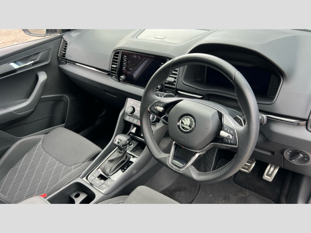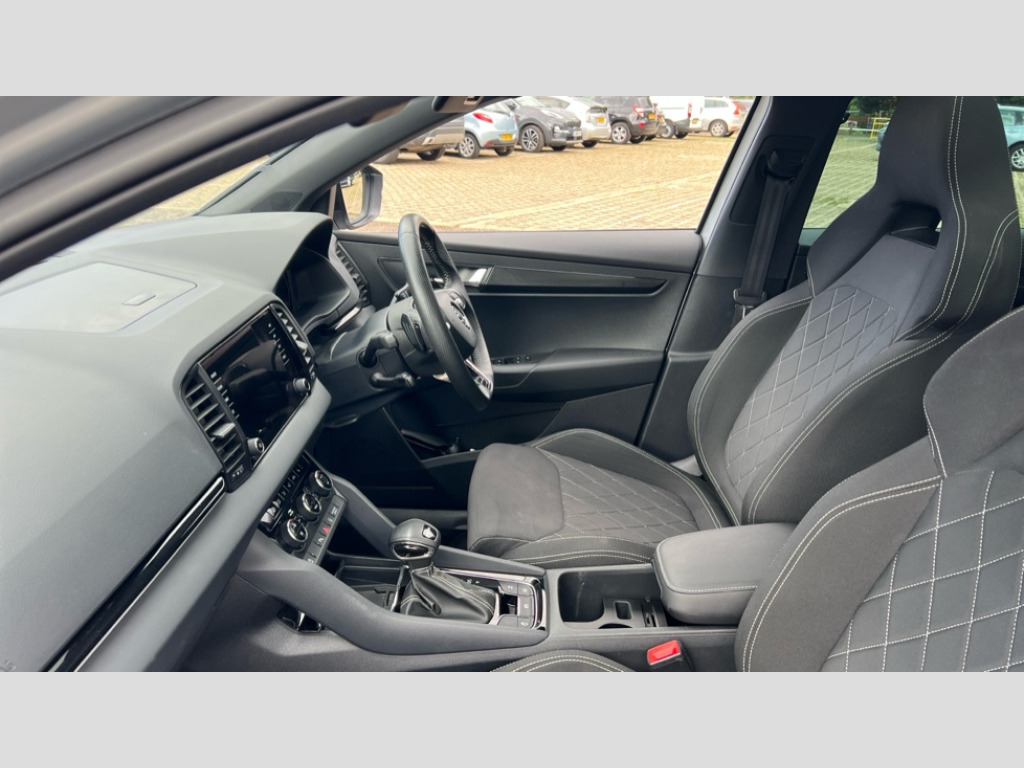 Skoda Karoq 1.5 TSI Sportline 5dr DSG Care connect, Driver fatigue sensor, Emergency services call system, Multifunction colour trip computer, Outside temperature gauge, Service interval indicator, SmartLink wireless for Apple and wired for Android, Start/stop system with regenerative braking, USB C Port x 2 in front centre console, Virtual pedal with electrically operated boot door, 8 Speakers, DAB radio with Bluetooth, USB connection, Acoustic glass, Aero front windscreen wipers with intermittent function, Auto dimming rear view mirror with light and rain sensors, Automatic headlight control system, Black door mirrors, Black electric window control buttons, Black radiator grille, Black roof rails, Body colour door handles, Body coloured bumpers, Electric front and rear windows with child proof lock, Front door steps with SportLine logo, Heated rear windscreen, LED daytime running lights, LED rear lights with high functionality welcome effect and dynamic indicators, Light assistant (coming/leaving home/tunnel light), Panoramic sliding sunroof, Privacy glass, Protective door side sills in body colour, Rear diffuser, Rear side wing doors, Rear spoiler, Rear wiper, Safety reflectors on front doors, Skoda lettering on tailgate in black, Sportline badge on front fender, Sportline decorative inserts with badging, Sports front and rear bumpers, 1.5 litre bottle holders in driver and front passenger door panels, 12V socket in boot, 12v socket in front centre armrest with storage compartment and rear air vents, 2 Folding hooks and nets in boot, 3 rear height adjustable headrests, 3 seat bench in 2nd row, 3 spoke leather sports multifunction steering wheel and silver stitching with gear shift paddles, 4 foldable roof handles with rear coat hooks, Black floor carpet, Black roof headlining, Chrome inner door handles, Double sided boot floor, Foldable hooks in the boot, Front head restraints, Height adjustable front three point seats belts with tensioners, Height/reach adjust steering wheel, Ice scraper, Illuminated and cooled glovebox, Illuminated luggage compartment, Isofix child seat preparation outer rear, Manual lumbar support for front seats, Pen holder, Pollen filter, Rear reading lights, Rear seats fixed folding and divided 60:40, Retractable parcel shelf attachable to tailgate, Rubbish bin door, Safety vest holder, Single front passenger seat, Solid rear boot cover, Storage box in upper central dashboard closed, Sunvisors with illuminated vanity mirrors, Textile floor mats, Titan black interior ceiling, Umbrella under passenger seat, Welcome animation with sportline logo, Light Pack - Karoq, Parking pack - Karoq, Airbags - Front side, head, knee and curtain, Automatic door unlocking in case of crash, Automatic fuel cut off in case of crash, Child locks on rear doors, Driver airbag, Electronic parking brake with auto hold function, Emergency rear braking signal, ESC including ABS, MSR, ASR, EDS, HBA, DSR, RBS, MKB and traction control, Front assist radar scanning of the space in front of the car with automatic braking, Hill hold control, Passenger airbag with switch-off function, Pedestrian monitor, Seatbelt reminder signalisation and pretensioner for all seats, Three point seatbelts rear, Two tone horn, Tyre pressure display, Tyre pressure monitor, Alarm with interior monitoring, back up horn and tilt sensor with safe function, Electronic engine immobiliser, Keyless entry and start/stop system with SAFE system, Remote central locking with 2 remote folding keys, Black air vent surround, Black centre console, Satin black dashboard, Satin black door trim, 18" Procyon alloy wheels in black, Anti-theft wheel bolts protection, Matt black aero hub caps, Storage on wheel cover