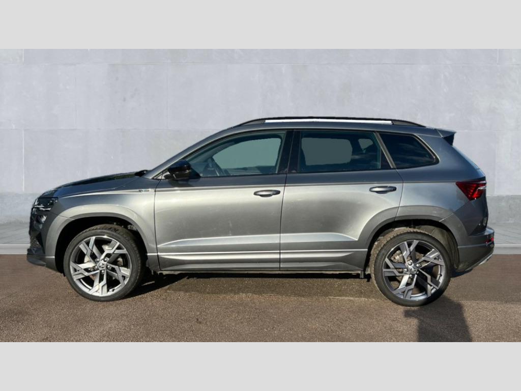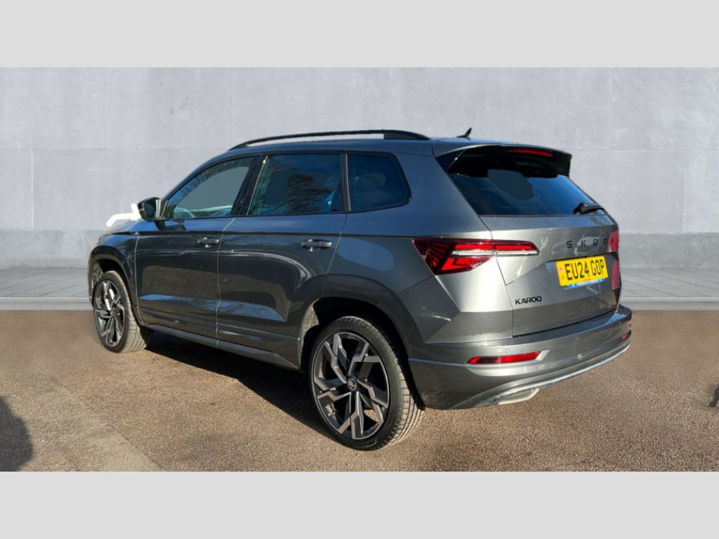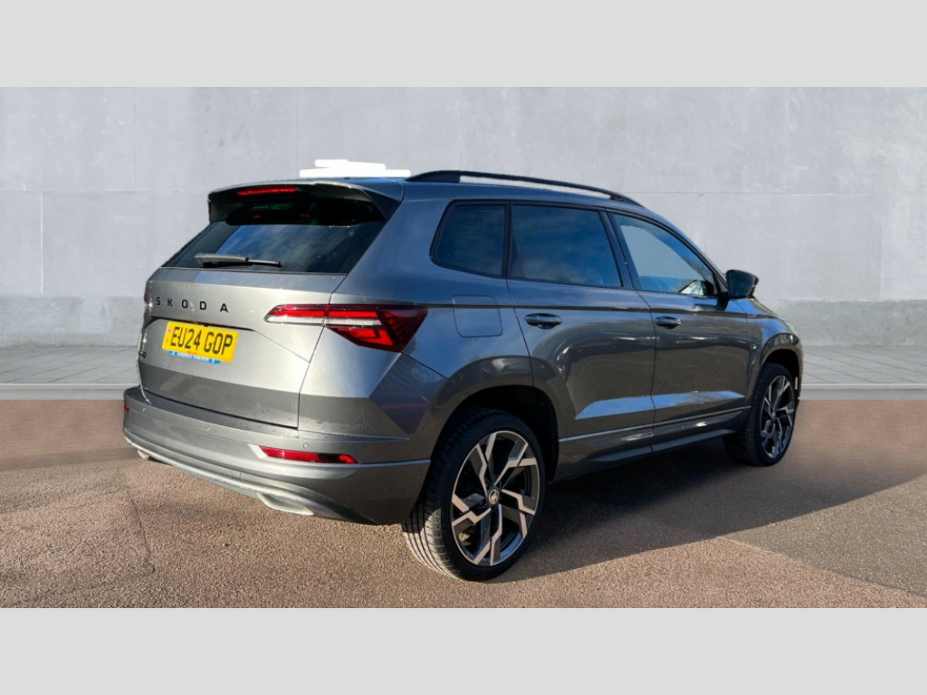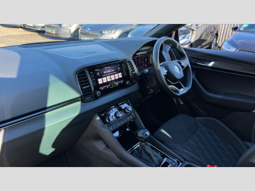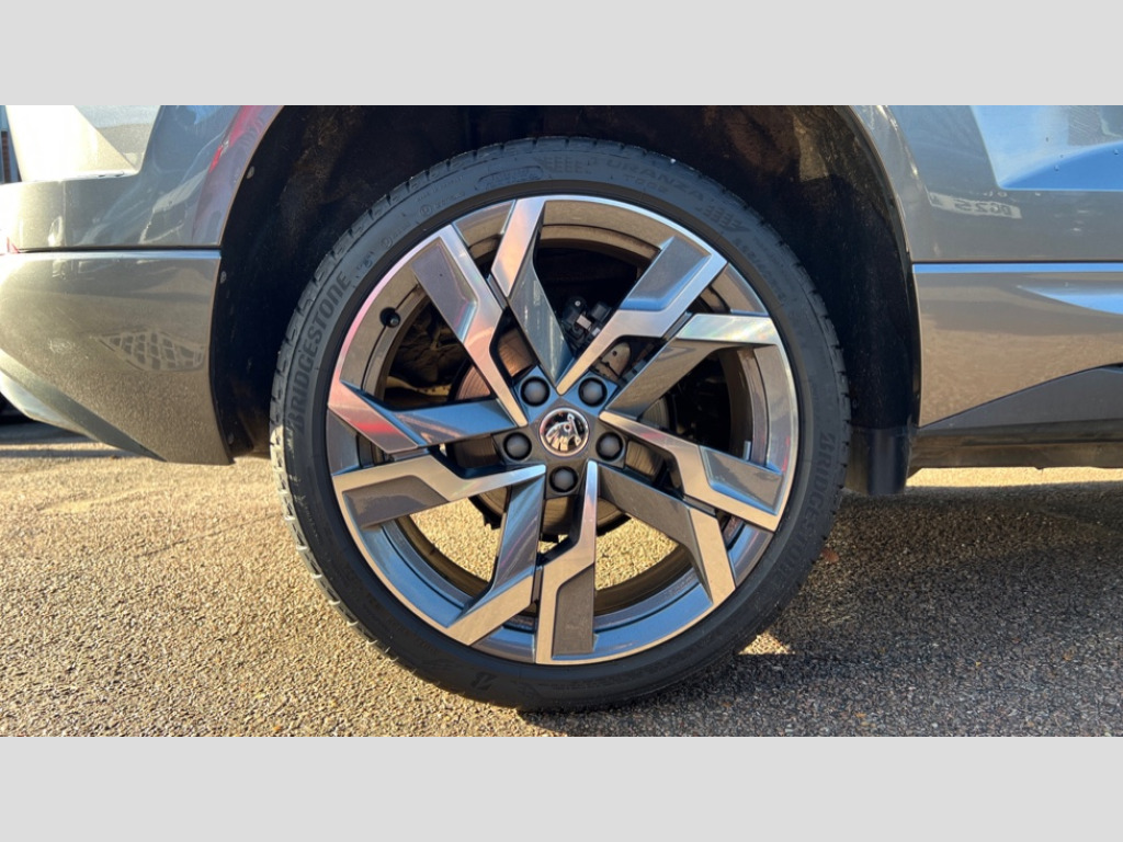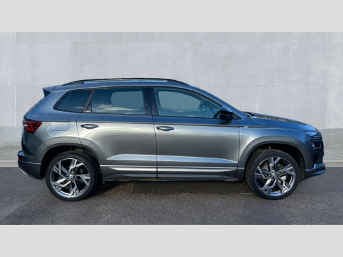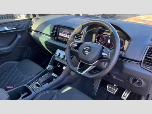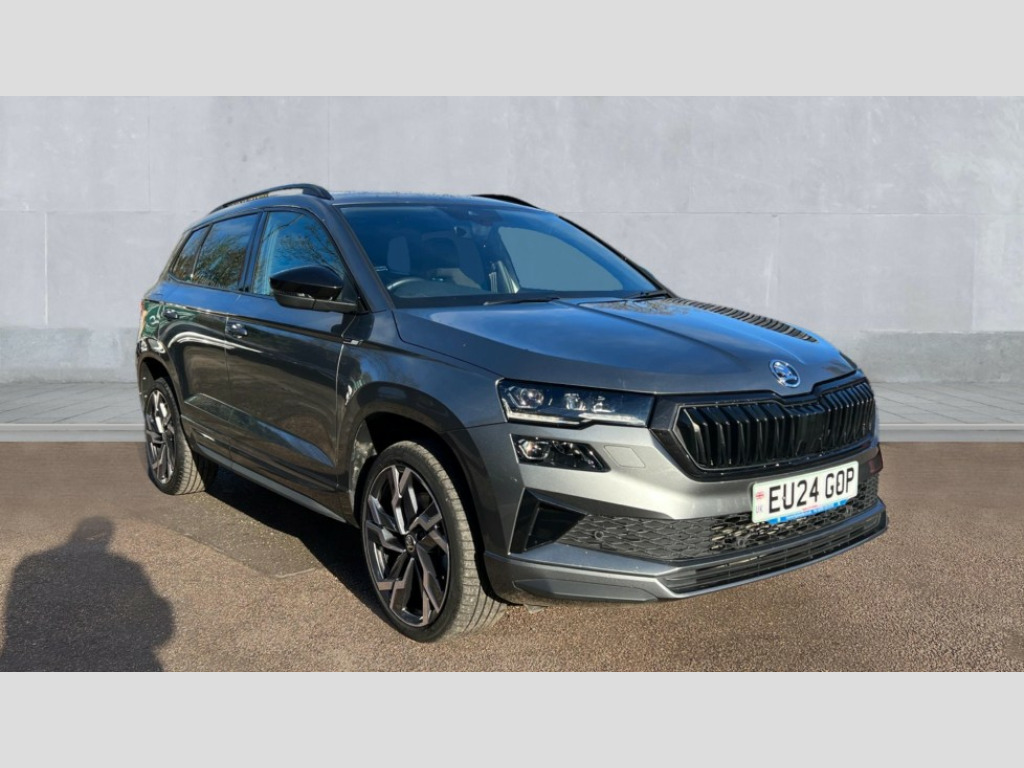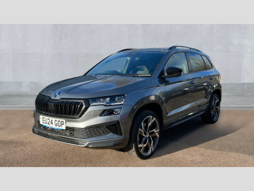 Skoda Karoq 1.5 TSI Sportline 5dr DSG 8" Digital display, Advanced driver attention and drowsiness monitor, Emergency services call system, Outside temperature gauge, Sensor for driver assistance systems, Service interval indicator, SmartLink wireless for Apple and wired for Android, Start/stop system with regenerative braking, USB C Port x 2 in front centre console, Virtual Cockpit - 10.25" digital display, Virtual pedal with electrically operated boot door, Wireless smartphone charging, DAB radio with Bluetooth, USB connection, Acoustic glass, Aero front windscreen wipers with intermittent function, Auto dimming rear view mirror with light and rain sensors, Black door mirrors, Black electric window control buttons, Black radiator grille, Black roof rails, Body colour door handles, Electric front and rear windows with child proof lock, Front door steps with SportLine logo, Heated rear windscreen, LED daytime running lights, LED rear lights with high functionality welcome effect and dynamic indicators, Light assistant (coming/leaving home/tunnel light), Panoramic sliding sunroof, Plastic scuff plates in door apertures, Privacy glass, Protective door side sills in body colour, Rear diffuser, Rear side wing doors, Rear spoiler, Rear window wiper with washer system and intermittent control, Safety reflectors on front doors, Skoda lettering on tailgate in black, Sportline badge on front fender, Sportline decorative inserts with badging, Sports front and rear bumpers, Third brake light, 1.5 litre bottle holders in driver and front passenger door panels, 12V socket in boot, 12v socket in front centre armrest with storage compartment and rear air vents, 2 x Tablet holder, 3 rear height adjustable headrests, 3 seat bench in 2nd row, 3 spoke sports leather heated multifunction steering wheel with DSG paddles, 4 foldable roof handles with rear coat hooks, Black floor carpet, Black roof headlining, Chrome inner door handles, Foldable hooks in the boot, Front head restraints, Height adjustable front three point seats belts with tensioners, Height/reach adjust steering wheel, Ice scraper, Illuminated glovebox, Illuminated luggage compartment, Isofix child seat preparation for front passenger seat, Isofix child seat preparation outer rear, Manual lumbar support for front seats, Pen holder, Pollen filter, Rear boot cover, Rear reading lights, Rear seats fixed folding and divided 60:40, Rubbish bin door, Safety vest holder, Single front passenger seat, Storage box in upper central dashboard closed, Sunvisors with illuminated vanity mirrors, Textile floor mats, Ticket holder, Titan black interior ceiling, Umbrella under passenger seat, Under passenger seat storage compartment, LED Interior lighting pack with Skoda welcome logo - Karoq, Light Pack - Karoq, Non Smokers pack, Automatic door unlocking in case of crash, Automatic fuel cut off in case of crash, Driver airbag, Electronic parking brake with auto hold function, Emergency rear braking signal, ESC (incl. ABS+MSR+ASR+EDS+HBA+DSR+RBS+MKB), Front side airbags, Head airbags, Hill hold control, Knee airbags, Passenger airbag with switch-off function, Pedestrian monitor, Seatbelt reminder signalisation and pretensioner for all seats, Three point seatbelts rear, Two tone horn, Tyre pressure monitor, Alarm with interior monitoring, back up horn and tilt sensor with safe function, Electronic engine immobiliser, Keyless entry and start/stop, Remote central locking with 2 remote folding keys, Black air vent surround, Black centre console, carbon door decor, Satin black dashboard, Satin black door trim, 19" Sagittarius anthracite alloy wheels, Anti-theft wheel bolts protection, Breakdown and tool kit