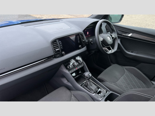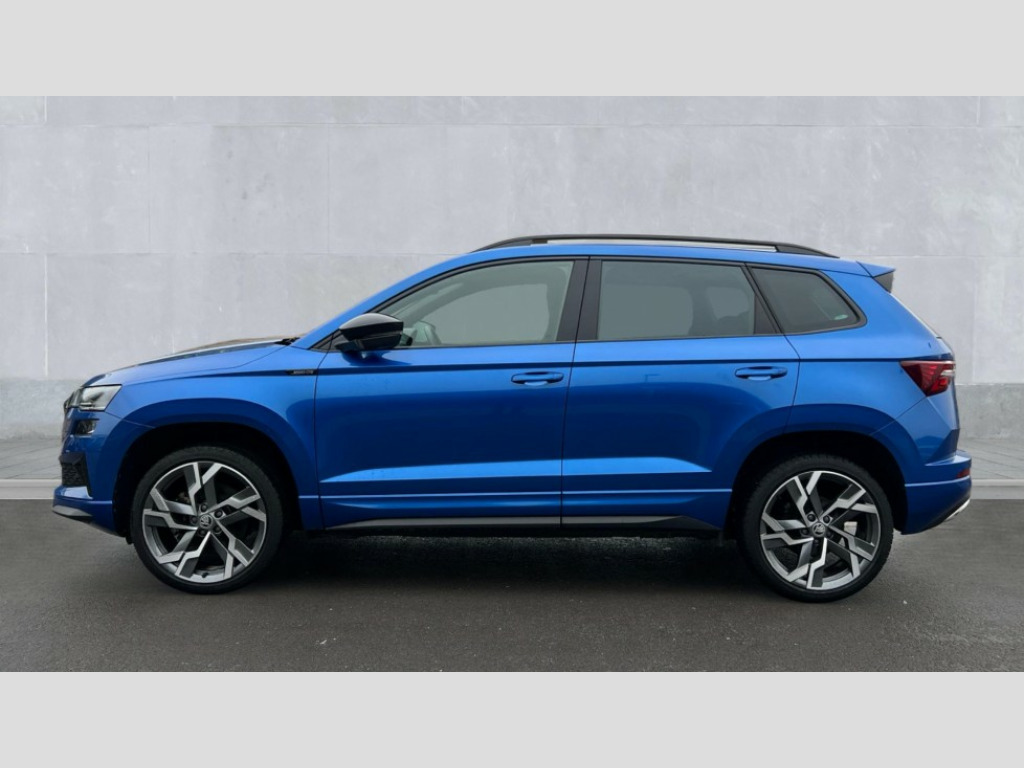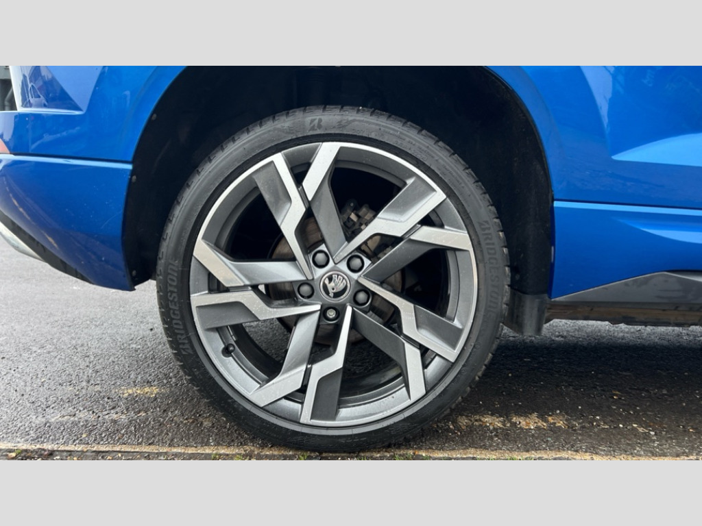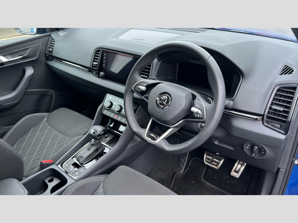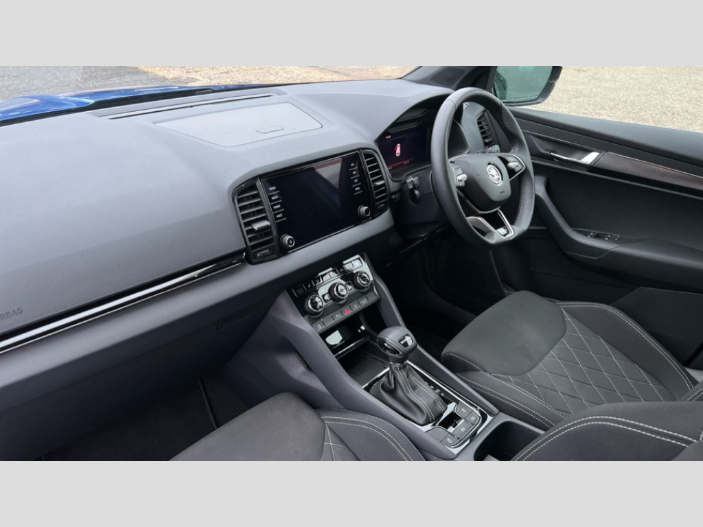 Skoda Karoq 1.5 TSI Sportline 5dr DSG 8" Digital display, Advanced driver attention and drowsiness monitor, Emergency services call system, Outside temperature gauge, Sensor for driver assistance systems, Service interval indicator, SmartLink wireless for Apple and wired for Android, Start/stop system with regenerative braking, USB C Port x 2 in front centre console, Virtual Cockpit - 10.25" digital display, Virtual pedal with electrically operated boot door, Wireless smartphone charging, DAB radio with Bluetooth, USB connection, Acoustic glass, Aero front windscreen wipers with intermittent function, Auto dimming rear view mirror with light and rain sensors, Black door mirrors, Black electric window control buttons, Black radiator grille, Black roof rails, Body colour door handles, Electric front and rear windows with child proof lock, Front door steps with SportLine logo, Heated rear windscreen, LED daytime running lights, LED rear lights with high functionality welcome effect and dynamic indicators, Light assistant (coming/leaving home/tunnel light), Panoramic sliding sunroof, Plastic scuff plates in door apertures, Privacy glass, Protective door side sills in body colour, Rear diffuser, Rear side wing doors, Rear spoiler, Rear window wiper with washer system and intermittent control, Safety reflectors on front doors, Skoda lettering on tailgate in black, Sportline badge on front fender, Sportline decorative inserts with badging, Sports front and rear bumpers, Third brake light, 1.5 litre bottle holders in driver and front passenger door panels, 12V socket in boot, 12v socket in front centre armrest with storage compartment and rear air vents, 2 x Tablet holder, 3 rear height adjustable headrests, 3 seat bench in 2nd row, 3 spoke sports leather heated multifunction steering wheel with DSG paddles, 4 foldable roof handles with rear coat hooks, Black floor carpet, Black roof headlining, Chrome inner door handles, Foldable hooks in the boot, Front head restraints, Height adjustable front three point seats belts with tensioners, Height/reach adjust steering wheel, Ice scraper, Illuminated glovebox, Illuminated luggage compartment, Isofix child seat preparation for front passenger seat, Isofix child seat preparation outer rear, Manual lumbar support for front seats, Pen holder, Pollen filter, Rear boot cover, Rear reading lights, Rear seats fixed folding and divided 60:40, Rubbish bin door, Safety vest holder, Single front passenger seat, Storage box in upper central dashboard closed, Sunvisors with illuminated vanity mirrors, Textile floor mats, Ticket holder, Titan black interior ceiling, Umbrella under passenger seat, Under passenger seat storage compartment, LED Interior lighting pack with Skoda welcome logo - Karoq, Light Pack - Karoq, Non Smokers pack, Automatic door unlocking in case of crash, Automatic fuel cut off in case of crash, Driver airbag, Electronic parking brake with auto hold function, Emergency rear braking signal, ESC (incl. ABS+MSR+ASR+EDS+HBA+DSR+RBS+MKB), Front side airbags, Head airbags, Hill hold control, Knee airbags, Passenger airbag with switch-off function, Pedestrian monitor, Seatbelt reminder signalisation and pretensioner for all seats, Three point seatbelts rear, Two tone horn, Tyre pressure monitor, Alarm with interior monitoring, back up horn and tilt sensor with safe function, Electronic engine immobiliser, Keyless entry and start/stop, Remote central locking with 2 remote folding keys, Black air vent surround, Black centre console, carbon door decor, Satin black dashboard, Satin black door trim, 19" Sagittarius anthracite alloy wheels, Anti-theft wheel bolts protection, Breakdown and tool kit