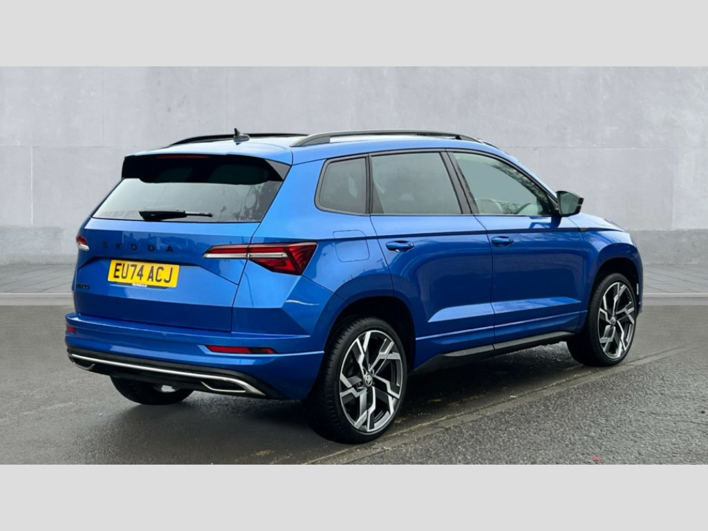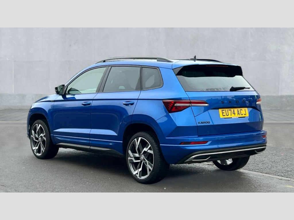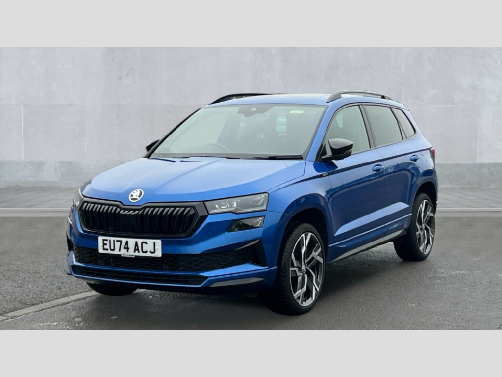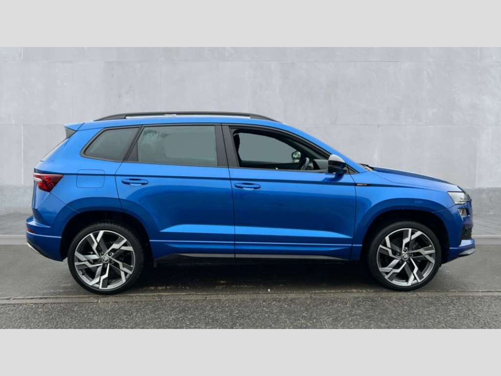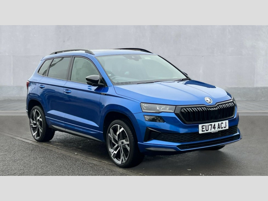 Skoda Karoq 1.5 TSI Sportline 5dr DSG 8" Digital display, Advanced driver attention and drowsiness monitor, Emergency services call system, Outside temperature gauge, Sensor for driver assistance systems, Service interval indicator, SmartLink wireless for Apple and wired for Android, Start/stop system with regenerative braking, USB C Port x 2 in front centre console, Virtual Cockpit - 10.25" digital display, Virtual pedal with electrically operated boot door, Wireless smartphone charging, DAB radio with Bluetooth, USB connection, Acoustic glass, Aero front windscreen wipers with intermittent function, Auto dimming rear view mirror with light and rain sensors, Black door mirrors, Black electric window control buttons, Black radiator grille, Black roof rails, Body colour door handles, Electric front and rear windows with child proof lock, Front door steps with SportLine logo, Heated rear windscreen, LED daytime running lights, LED rear lights with high functionality welcome effect and dynamic indicators, Light assistant (coming/leaving home/tunnel light), Panoramic sliding sunroof, Plastic scuff plates in door apertures, Privacy glass, Protective door side sills in body colour, Rear diffuser, Rear side wing doors, Rear spoiler, Rear window wiper with washer system and intermittent control, Safety reflectors on front doors, Skoda lettering on tailgate in black, Sportline badge on front fender, Sportline decorative inserts with badging, Sports front and rear bumpers, Third brake light, 1.5 litre bottle holders in driver and front passenger door panels, 12V socket in boot, 12v socket in front centre armrest with storage compartment and rear air vents, 2 x Tablet holder, 3 rear height adjustable headrests, 3 seat bench in 2nd row, 3 spoke sports leather heated multifunction steering wheel with DSG paddles, 4 foldable roof handles with rear coat hooks, Black floor carpet, Black roof headlining, Chrome inner door handles, Foldable hooks in the boot, Front head restraints, Height adjustable front three point seats belts with tensioners, Height/reach adjust steering wheel, Ice scraper, Illuminated glovebox, Illuminated luggage compartment, Isofix child seat preparation for front passenger seat, Isofix child seat preparation outer rear, Manual lumbar support for front seats, Pen holder, Pollen filter, Rear boot cover, Rear reading lights, Rear seats fixed folding and divided 60:40, Rubbish bin door, Safety vest holder, Single front passenger seat, Storage box in upper central dashboard closed, Sunvisors with illuminated vanity mirrors, Textile floor mats, Ticket holder, Titan black interior ceiling, Umbrella under passenger seat, Under passenger seat storage compartment, LED Interior lighting pack with Skoda welcome logo - Karoq, Light Pack - Karoq, Non Smokers pack, Automatic door unlocking in case of crash, Automatic fuel cut off in case of crash, Driver airbag, Electronic parking brake with auto hold function, Emergency rear braking signal, ESC (incl. ABS+MSR+ASR+EDS+HBA+DSR+RBS+MKB), Front side airbags, Head airbags, Hill hold control, Knee airbags, Passenger airbag with switch-off function, Pedestrian monitor, Seatbelt reminder signalisation and pretensioner for all seats, Three point seatbelts rear, Two tone horn, Tyre pressure monitor, Alarm with interior monitoring, back up horn and tilt sensor with safe function, Electronic engine immobiliser, Keyless entry and start/stop, Remote central locking with 2 remote folding keys, Black air vent surround, Black centre console, carbon door decor, Satin black dashboard, Satin black door trim, 19" Sagittarius anthracite alloy wheels, Anti-theft wheel bolts protection, Breakdown and tool kit