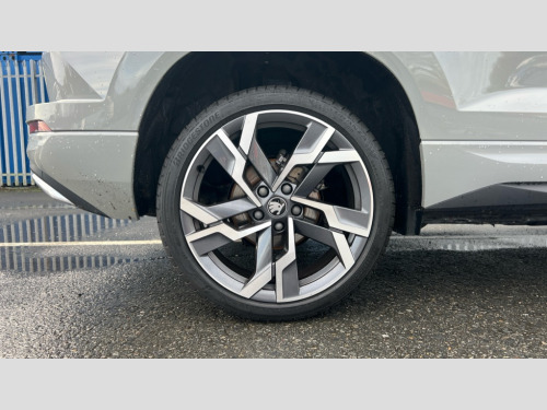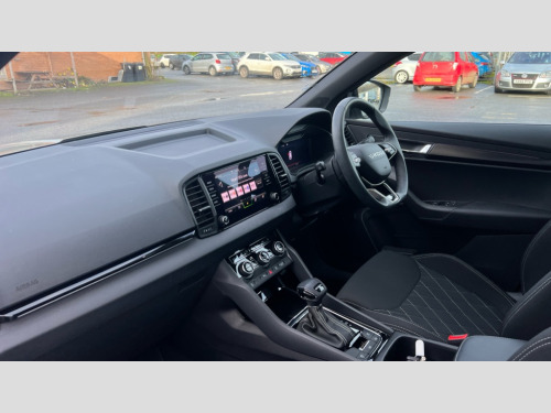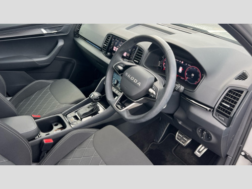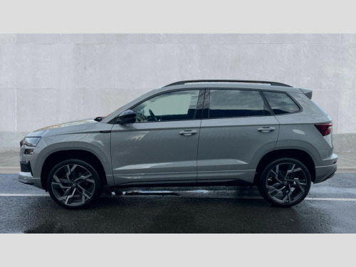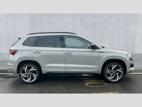 Skoda Karoq 1.5 TSI Sportline 5dr DSG 8" Digital display, Advanced driver attention and drowsiness monitor, Emergency services call system, Outside temperature gauge, Sensor for driver assistance systems, Service interval indicator, SmartLink wireless for Apple and wired for Android, Start/stop system with regenerative braking, USB C Port x 2 in front centre console, Virtual Cockpit - 10.25" digital display, Virtual pedal with electrically operated boot door, Wireless smartphone charging, DAB radio with Bluetooth, USB connection, Acoustic glass, Aero front windscreen wipers with intermittent function, Auto dimming rear view mirror with light and rain sensors, Black door mirrors, Black electric window control buttons, Black radiator grille, Black roof rails, Body colour door handles, Electric front and rear windows with child proof lock, Front door steps with SportLine logo, Heated rear windscreen, LED daytime running lights, LED rear lights with high functionality welcome effect and dynamic indicators, Light assistant (coming/leaving home/tunnel light), Panoramic sliding sunroof, Plastic scuff plates in door apertures, Privacy glass, Protective door side sills in body colour, Rear diffuser, Rear side wing doors, Rear spoiler, Rear window wiper with washer system and intermittent control, Safety reflectors on front doors, Skoda lettering on tailgate in black, Sportline badge on front fender, Sportline decorative inserts with badging, Sports front and rear bumpers, Third brake light, 1.5 litre bottle holders in driver and front passenger door panels, 12V socket in boot, 12v socket in front centre armrest with storage compartment and rear air vents, 2 x Tablet holder, 3 rear height adjustable headrests, 3 seat bench in 2nd row, 3 spoke sports leather heated multifunction steering wheel with DSG paddles, 4 foldable roof handles with rear coat hooks, Black floor carpet, Black roof headlining, Chrome inner door handles, Foldable hooks in the boot, Front head restraints, Height adjustable front three point seats belts with tensioners, Height/reach adjust steering wheel, Ice scraper, Illuminated glovebox, Illuminated luggage compartment, Isofix child seat preparation for front passenger seat, Isofix child seat preparation outer rear, Manual lumbar support for front seats, Pen holder, Pollen filter, Rear boot cover, Rear reading lights, Rear seats fixed folding and divided 60:40, Rubbish bin door, Safety vest holder, Single front passenger seat, Storage box in upper central dashboard closed, Sunvisors with illuminated vanity mirrors, Textile floor mats, Ticket holder, Titan black interior ceiling, Umbrella under passenger seat, Under passenger seat storage compartment, LED Interior lighting pack with Skoda welcome logo - Karoq, Light Pack - Karoq, Non Smokers pack, Automatic door unlocking in case of crash, Automatic fuel cut off in case of crash, Driver airbag, Electronic parking brake with auto hold function, Emergency rear braking signal, ESC (incl. ABS+MSR+ASR+EDS+HBA+DSR+RBS+MKB), Front side airbags, Head airbags, Hill hold control, Knee airbags, Passenger airbag with switch-off function, Pedestrian monitor, Seatbelt reminder signalisation and pretensioner for all seats, Three point seatbelts rear, Two tone horn, Tyre pressure monitor, Alarm with interior monitoring, back up horn and tilt sensor with safe function, Electronic engine immobiliser, Keyless entry and start/stop, Remote central locking with 2 remote folding keys, Black air vent surround, Black centre console, carbon door decor, Satin black dashboard, Satin black door trim, 19" Sagittarius anthracite alloy wheels, Anti-theft wheel bolts protection, Breakdown and tool kit